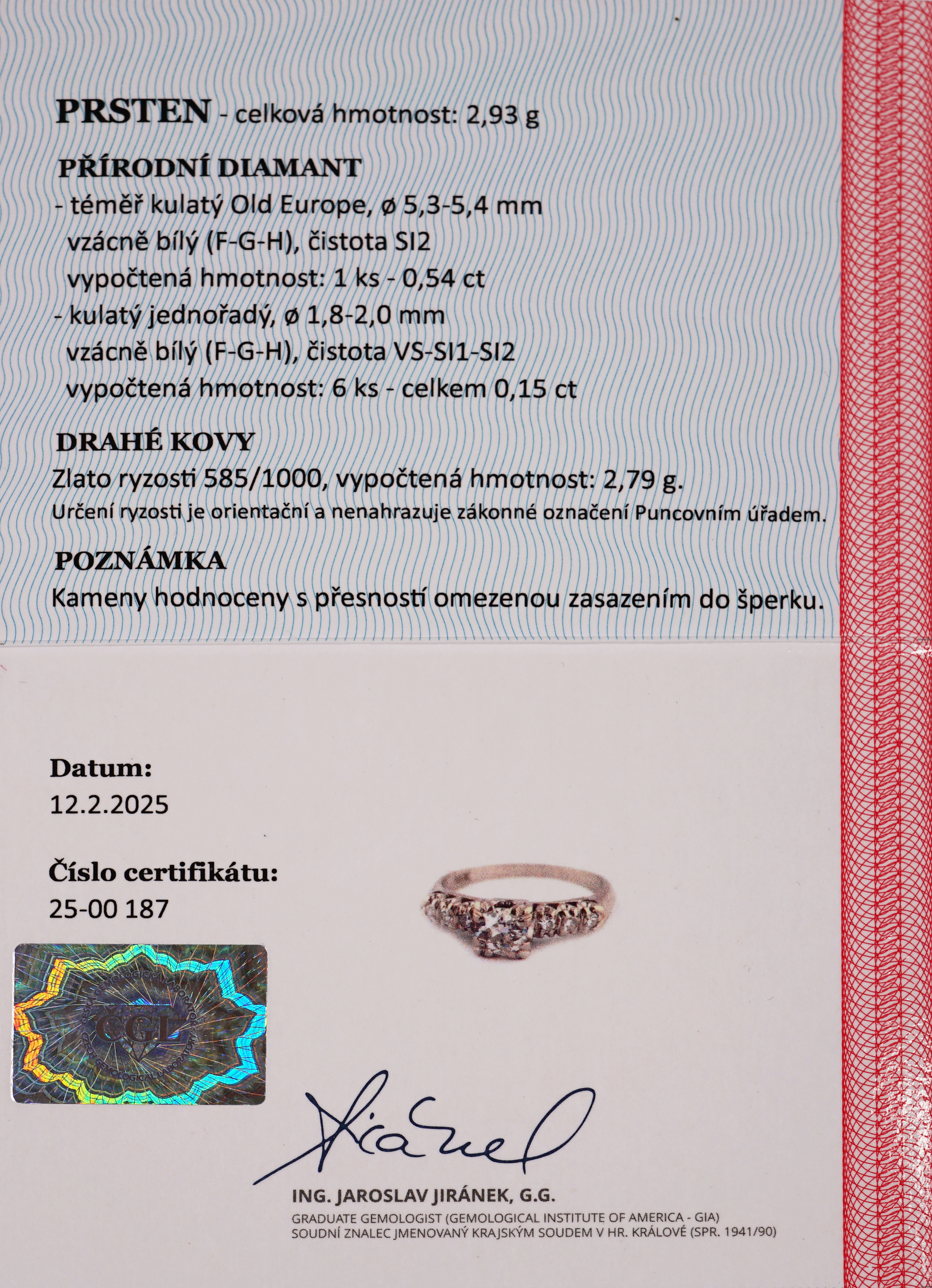 • 1 ks přírodního diamantu Old Europe 0,54 ct, vzácně bílý (F-G-H), čistota SI2, průměr 5,3-5,4 mm,