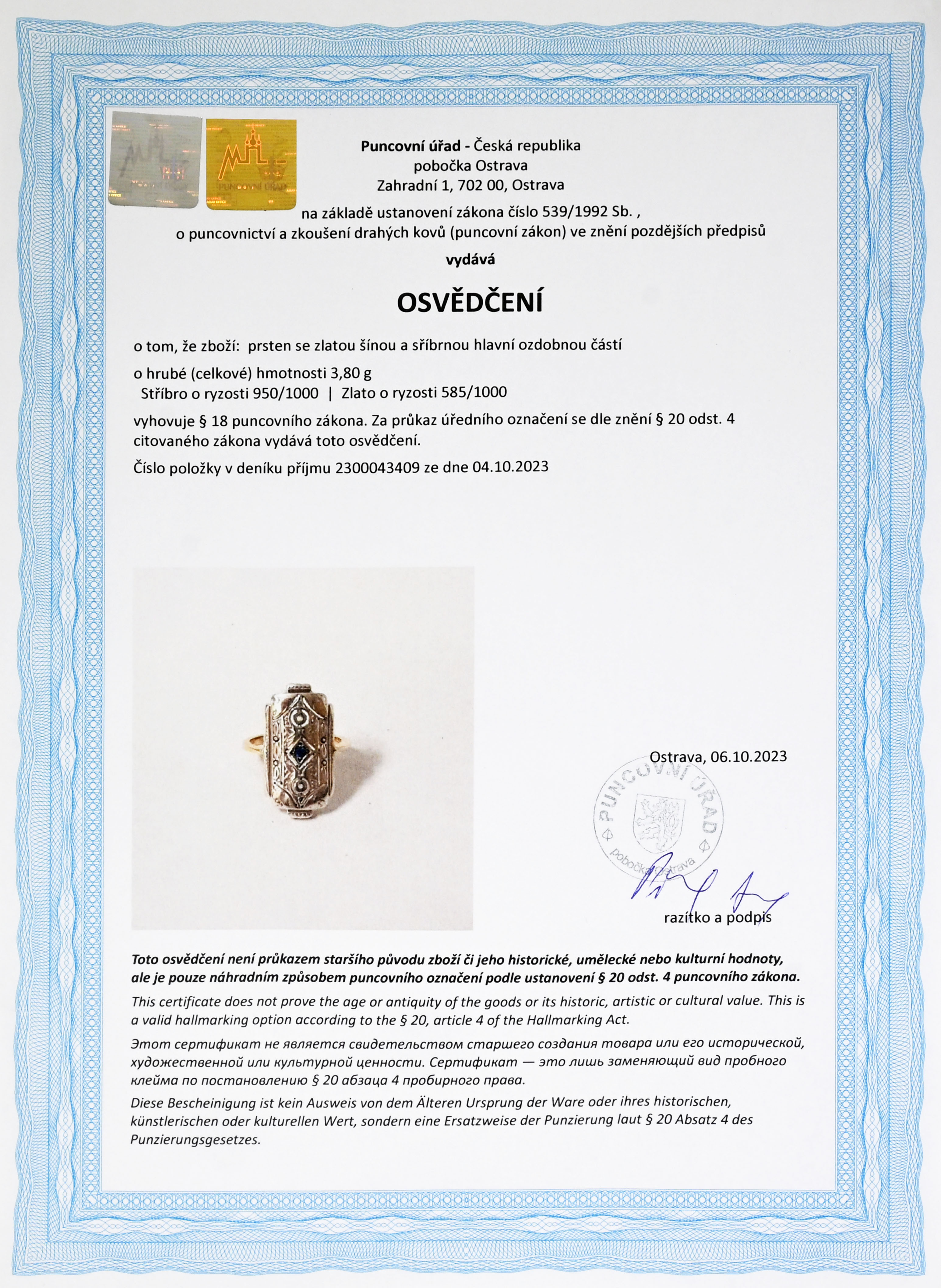Materiál: žluté zlato o ryzosti 585/1000, stříbro o ryzosti 900/1000