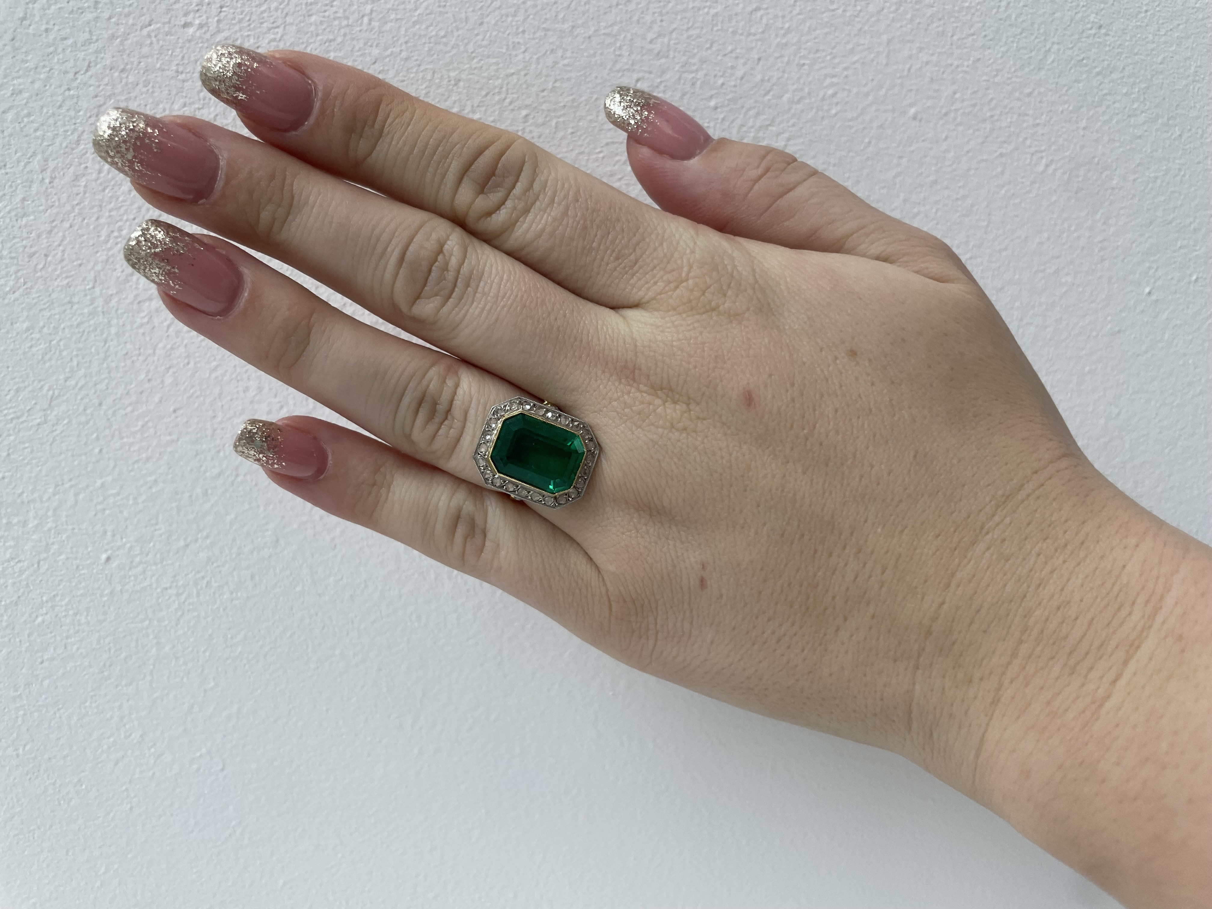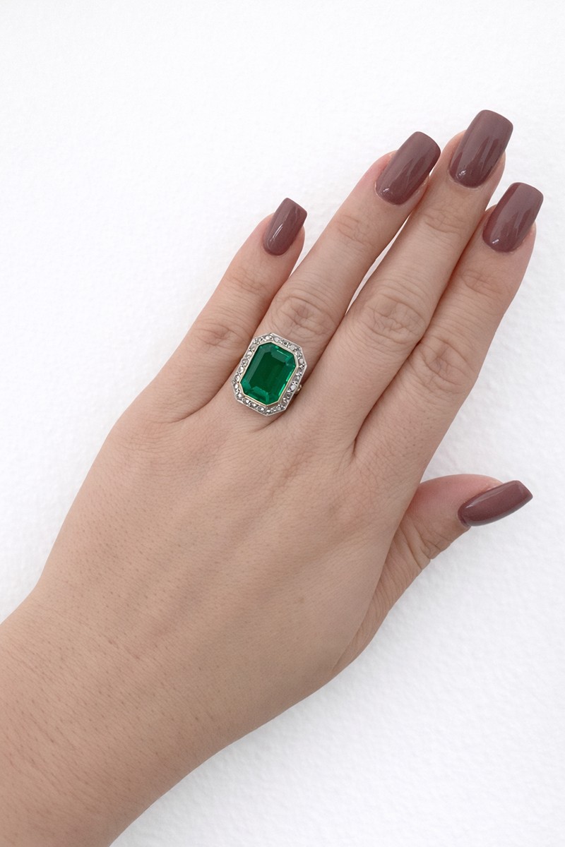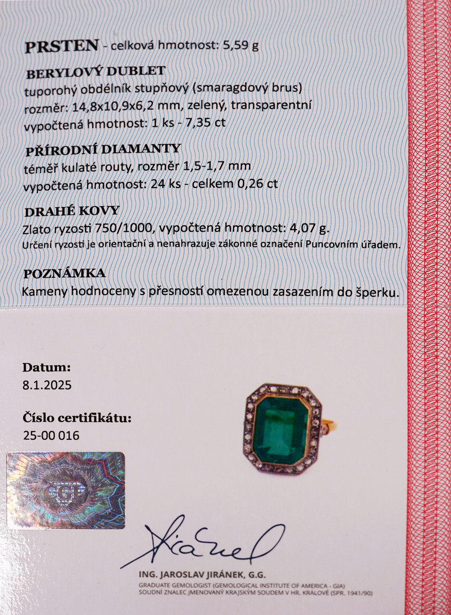 – 1 ks berylového dubletu o hmotnosti 7,35 ct, smaragdový brus, rozměry 14,8 × 10,9 × 6,2 mm,