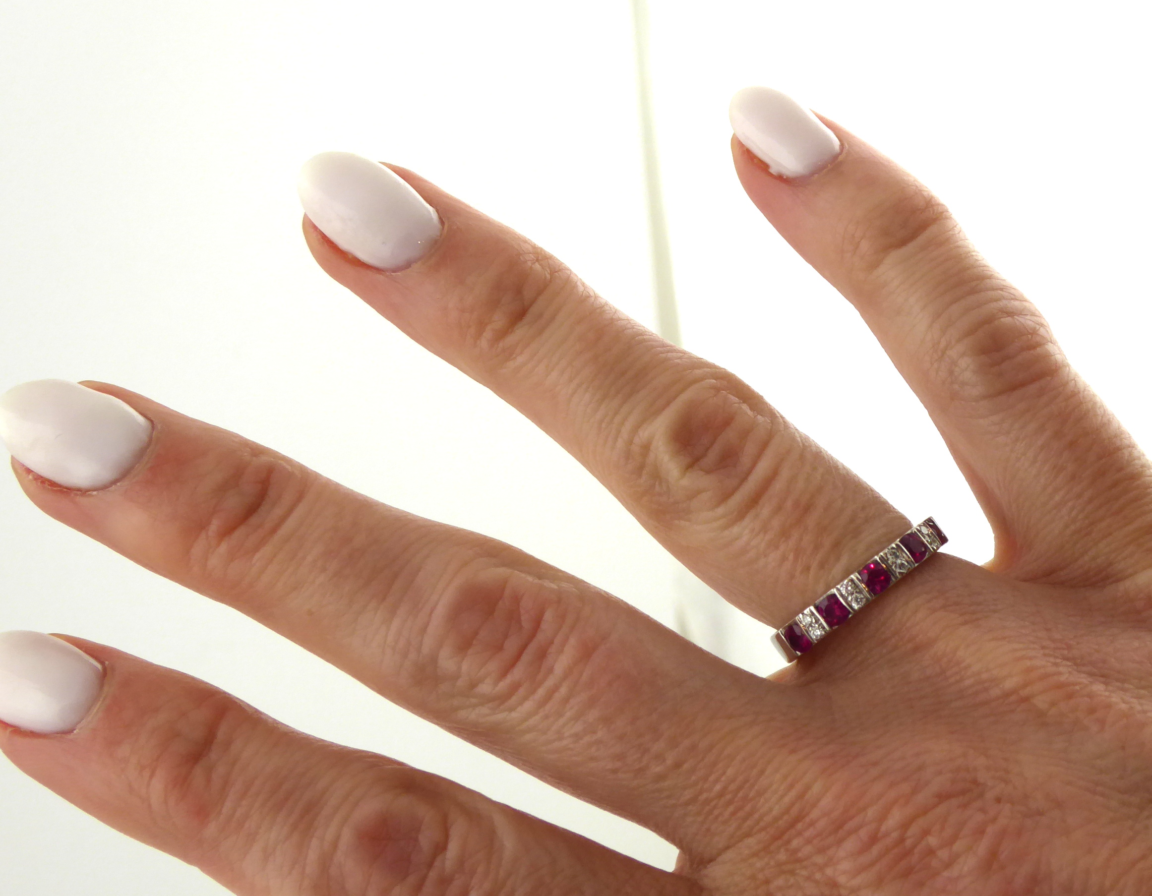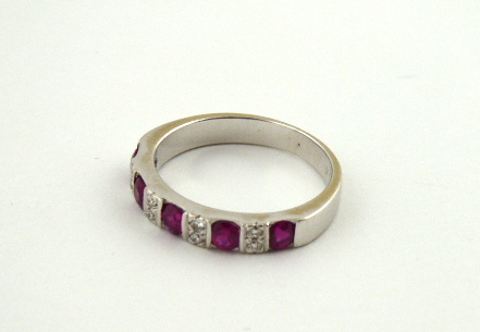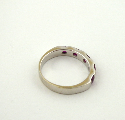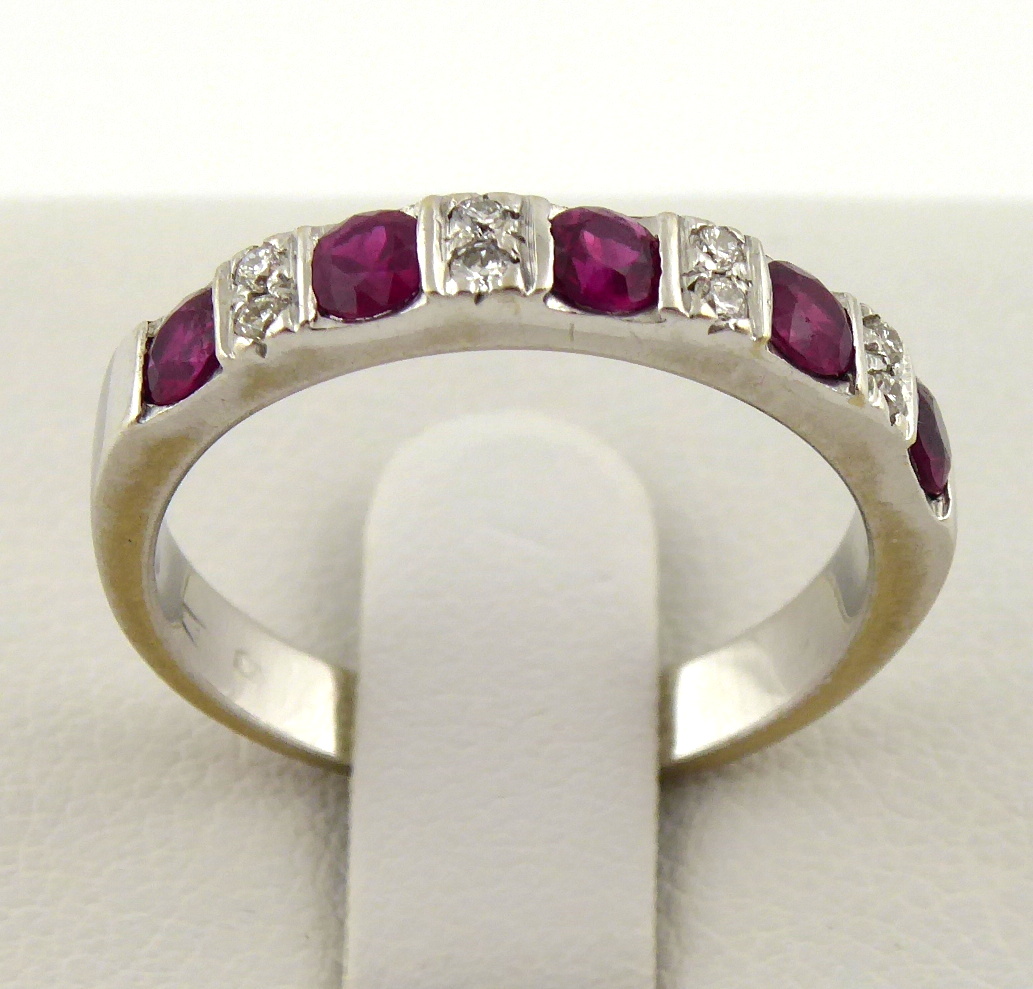Osmnáctikarátové bílé zlato, přírodní rubíny, přírodní diamanty. Ryzost Au 750/1000, celková hmotnost 3,45 g. Prsten s obroučkou z osmnáctikarátového bílého zlata osázený pěti přírodními rubíny a osmi přírodními diamanty. Přírodní diamanty moderního briliantového brusu o váze 0,08 ct, barva G-H, čistota Si. Značeno platným českým puncem. Itálie, třetí třetina minulého století. Velikost prstenu 52.