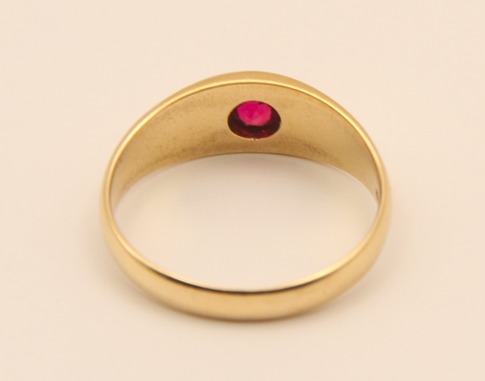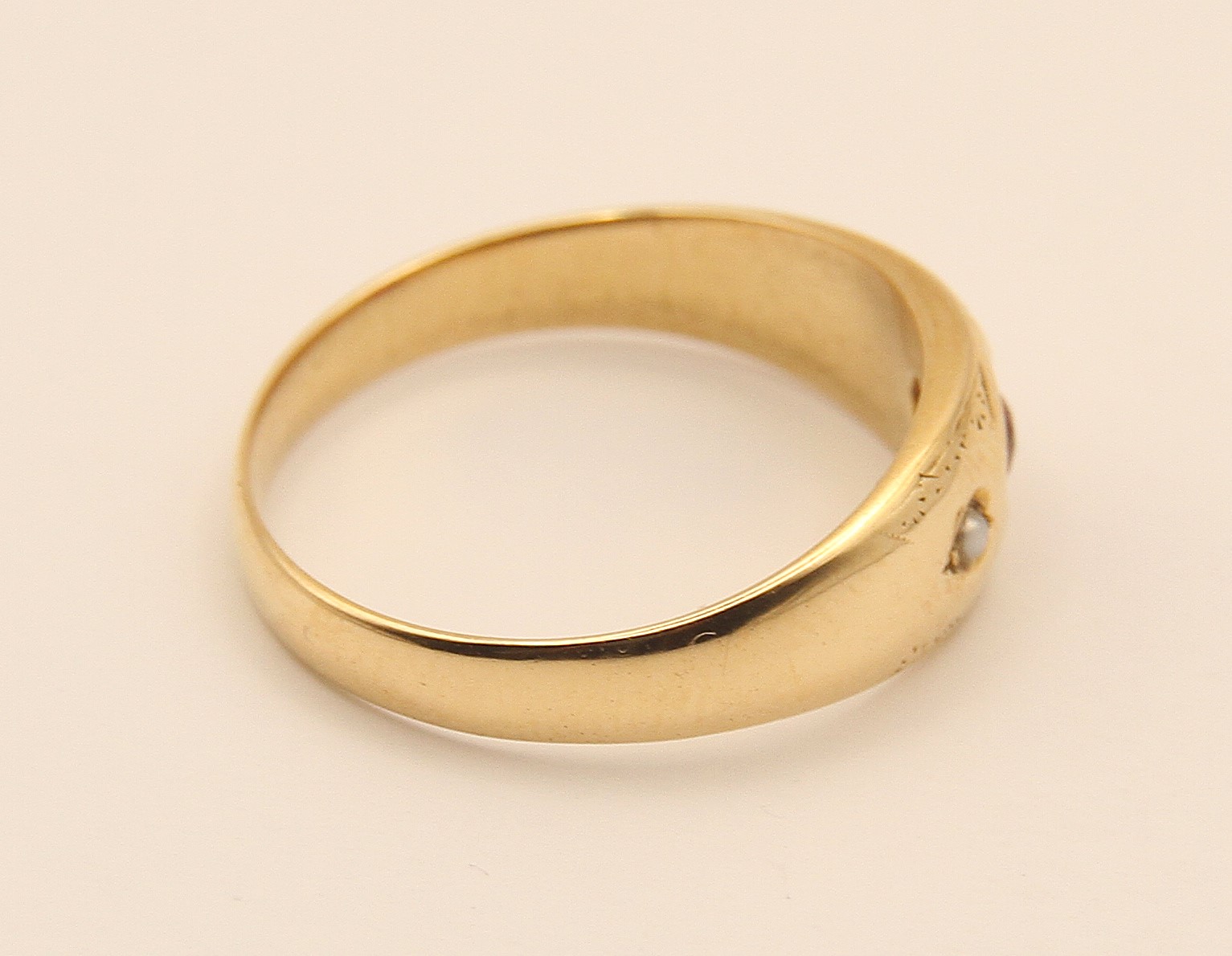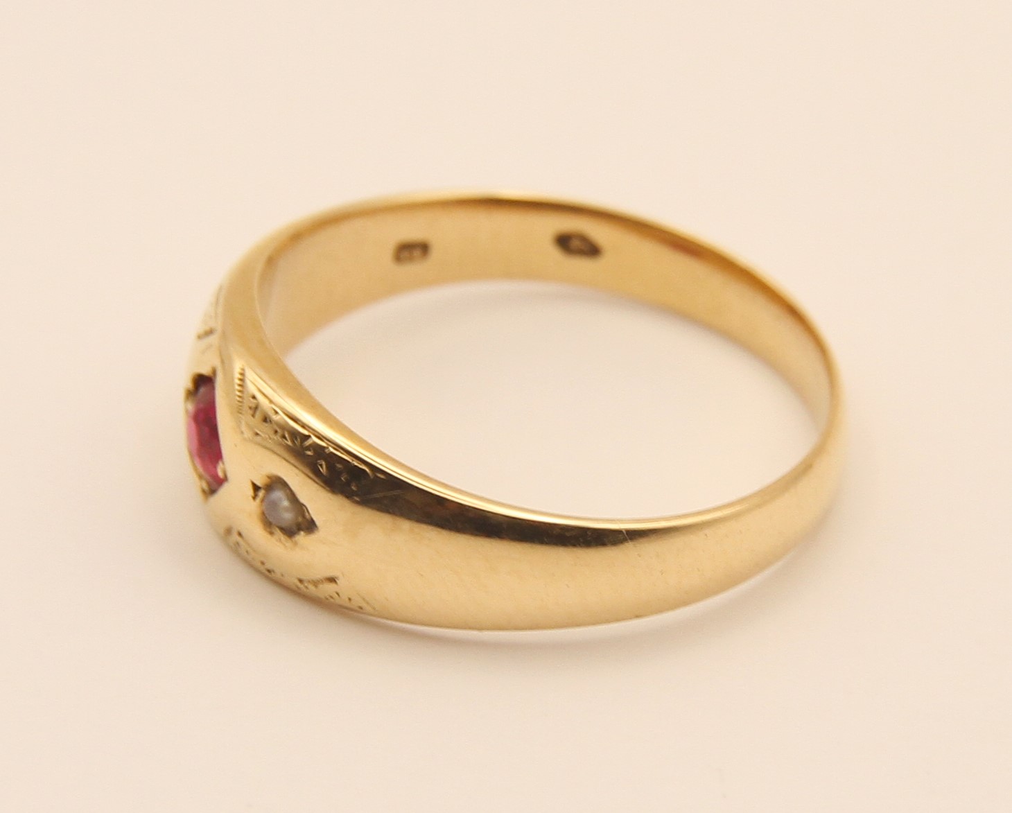 Zlatý prsten s přírodním rubínem a říčními perličkami zdobený gravírováním, AU btto 4,24g/580/1000, Rakousko – Uhersko, Praha kolem roku 1910