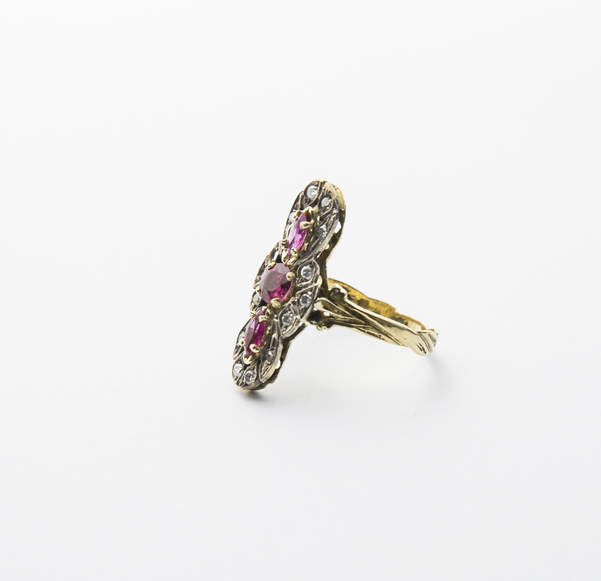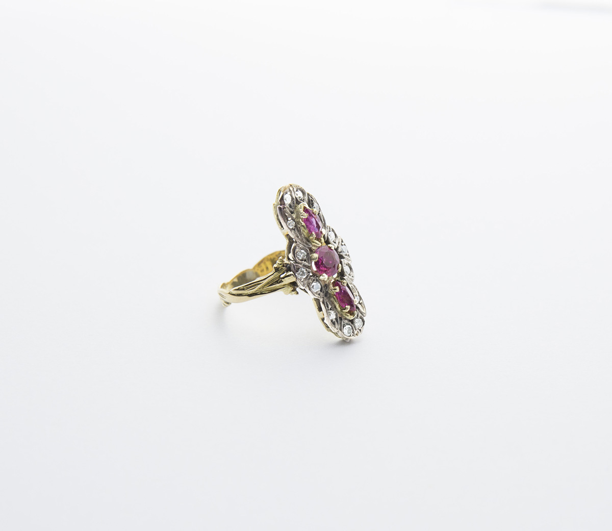 zlatý prsten se syntetickými rubíny a diamanty zasazenými ve stříbře, 2 rubíny markýzového brusu 0,4 ct, centrální rubín briliantového brusu 0,3 ct, 14 diamantů starého briliantového brusu o celkové hmotnosti 0,28 ct, Au btto 3,85 g/750/1000, Západní Evropa, kolem r. 1935, osvědčení Puncovního úřadu, velikost prstenu 57