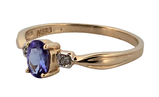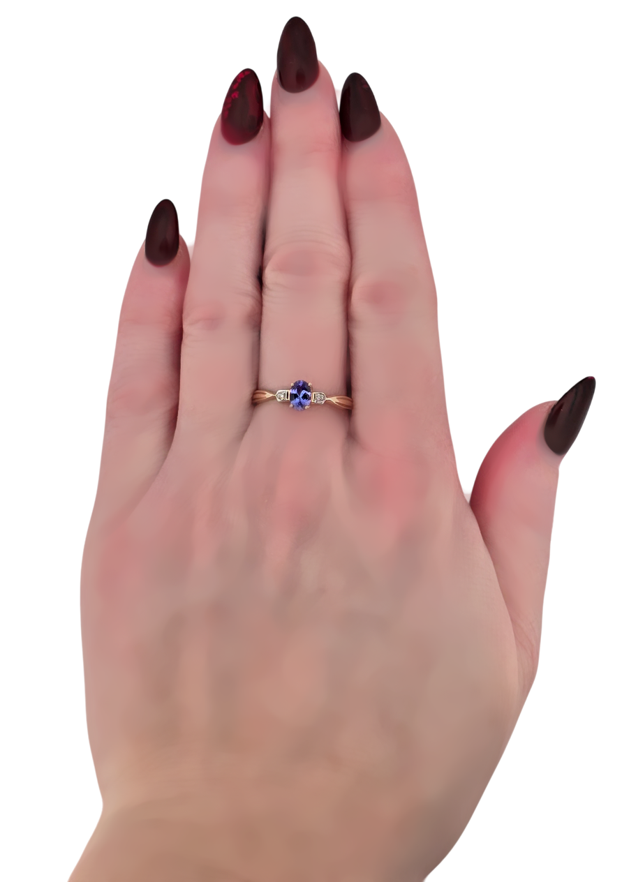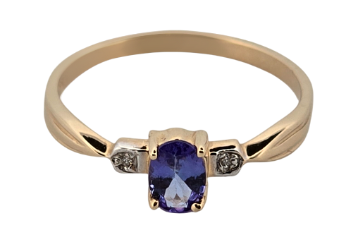 Popis: Jemný elegantní zlatý prsten s centrálním kamenem – přírodním tanzanitem a dvěma přírodními diamanty. Tanzanit má oválný portugalský brus, kvalita brusu je velmi dobrá. Velikost kamene je 6 x 4 x 2,62 mm a celková váha cca 0,45 ct. Kvalita obou diamantů je velmi dobrá, mají briliantový brus a celková váha je cca 0,01 ct. Na vnější straně prstenu je signace IV – jedná se o prsten z dílny Harry Ivens (slavná šperkařská dílna známá pro své výtvory, které často kombinují exotické drahokamy s klasickými vzory).