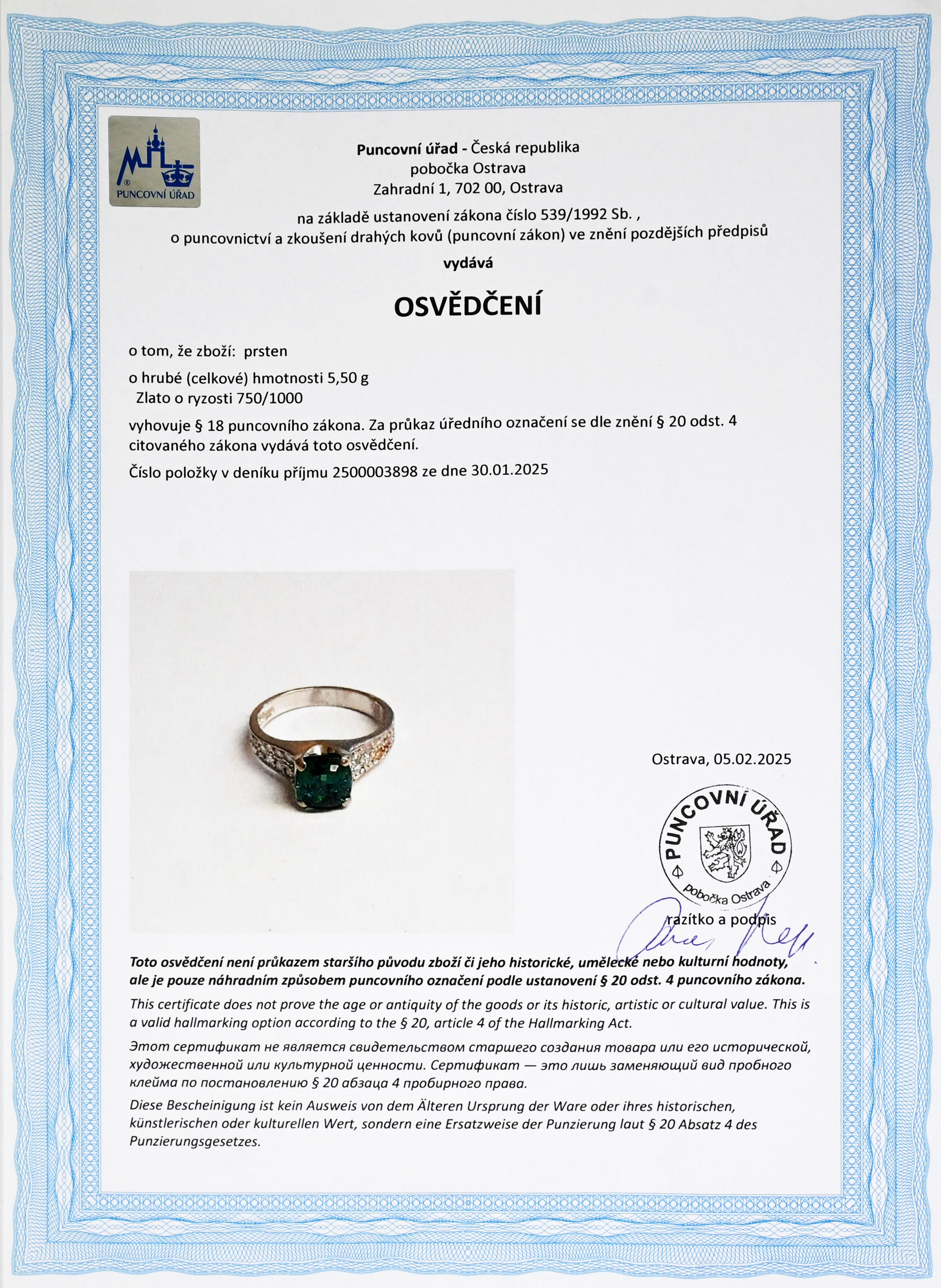 osvědčení puncovního úřadu