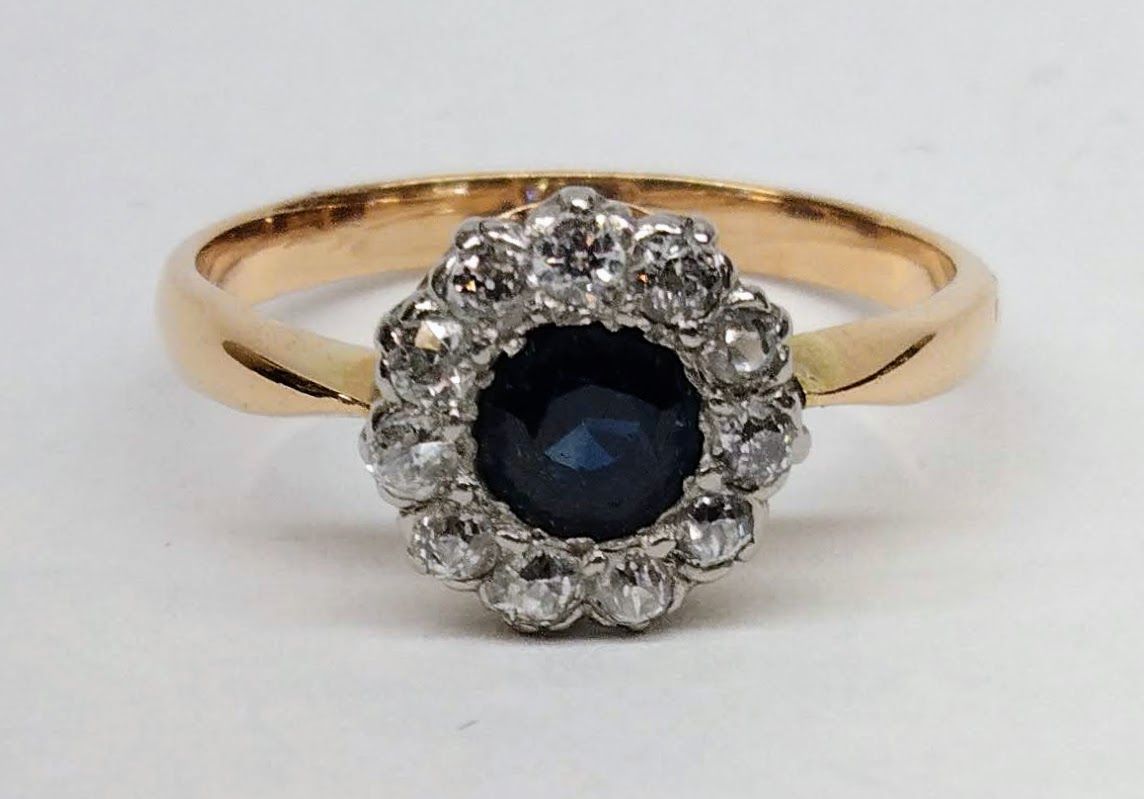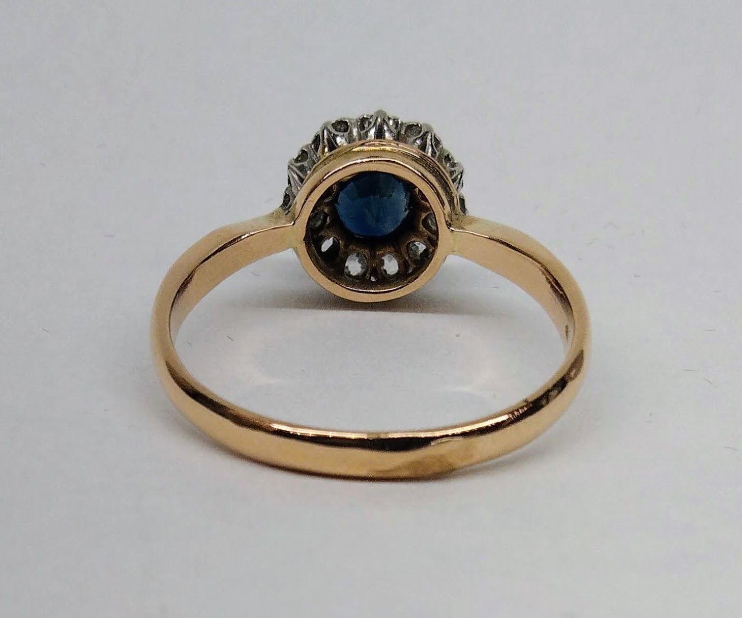 Zlatý prsten se sytě modrým přírodním safírem o průměru 0,5 cm a 11 diamanty briliantového brusu, celkem 0,33 ct, osazenými v koruně z bílého zlata. Celková hmotnost Au 3,86 g/585/1000, punc. Západní Evropa, třetí čtvrtina 20. století, průměr hlavy 1 cm, velikost prstenu 60.