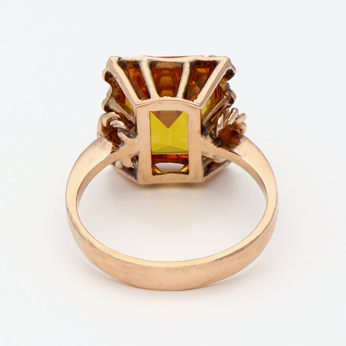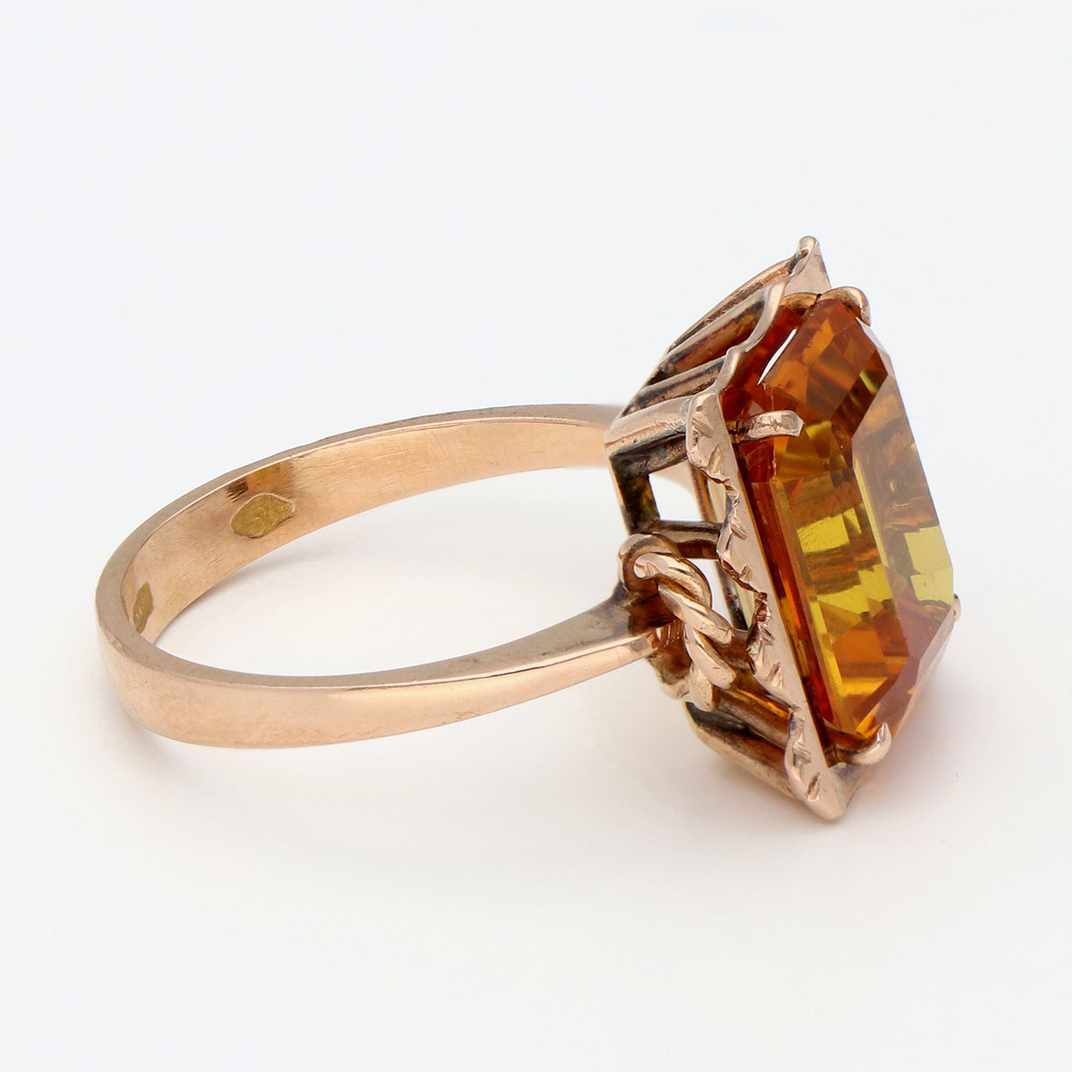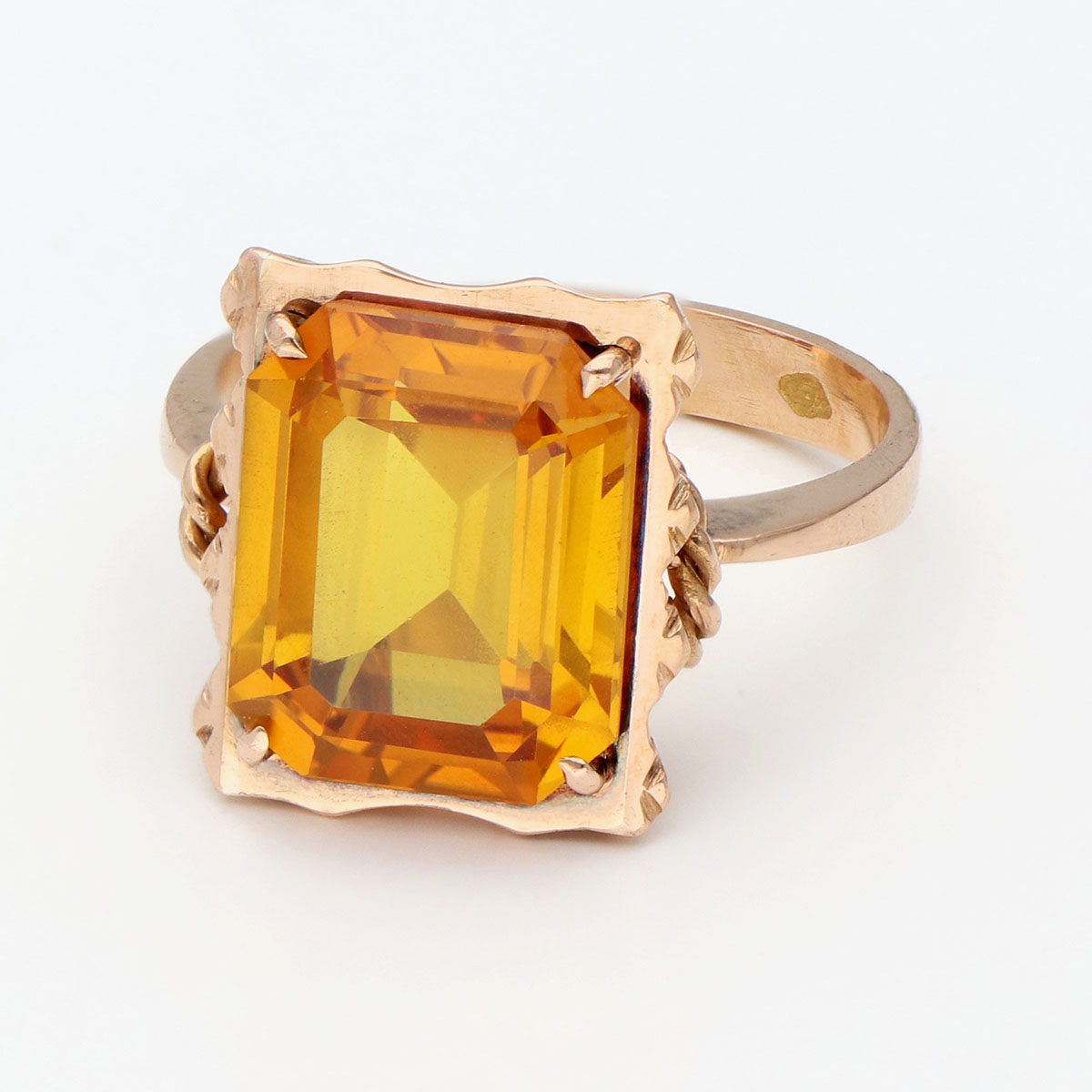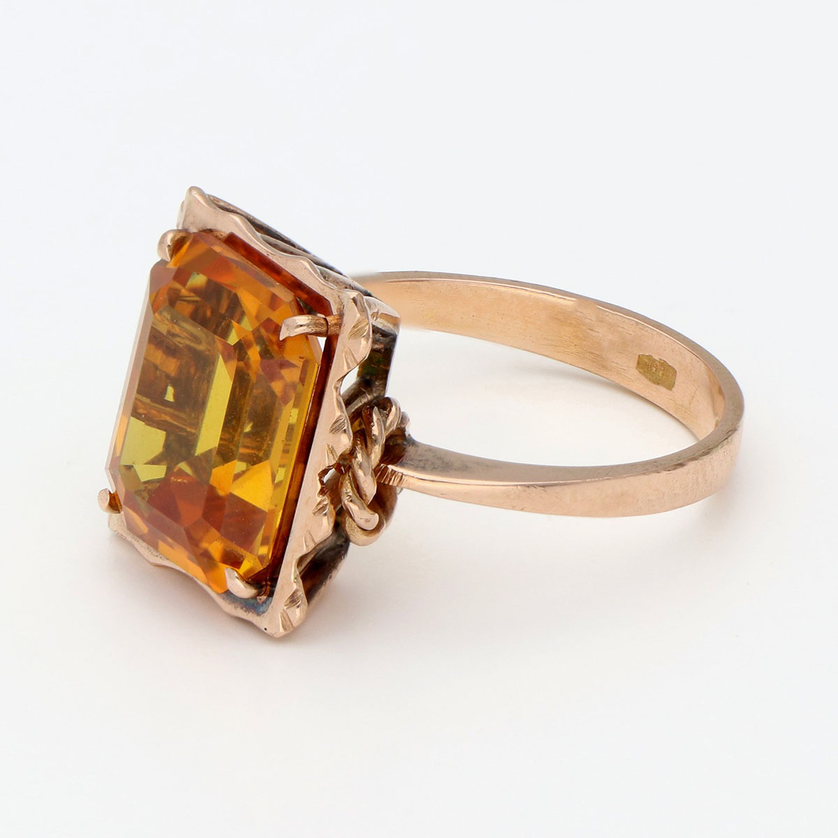 Zlatý prsten z růžového zlata se syntetickým safírem o celkové hmotnosti cca 6.82 ct, velikost 12 x 9.8 mm. Celková Au 5,06 g/585/1000, punc. Západní Evropa, poslední čtvrtina 20. století, velikost prstenu 53.