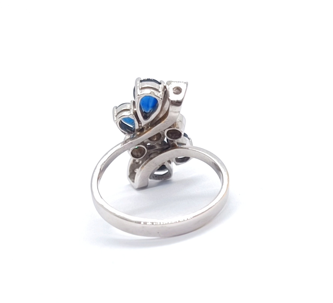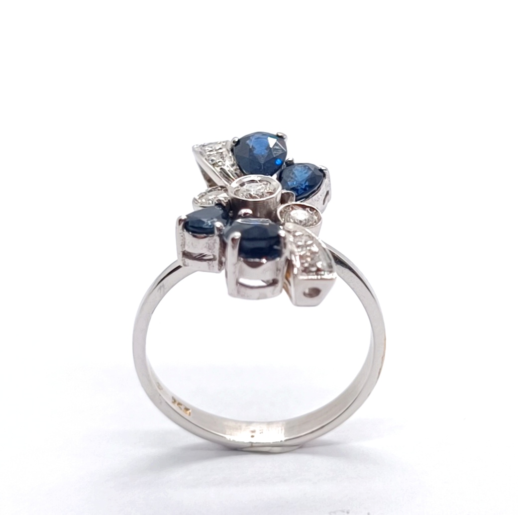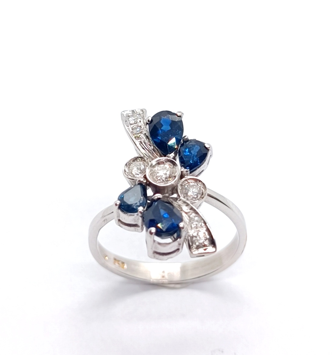 Zlatý prsten se safíry a diamanty briliantového brusu o celkové hmotnosti 0,21 ct, Au btto 4,70g/750/1000, Západní Evropa, 70. léta 20. století; velikost prstenu 51
