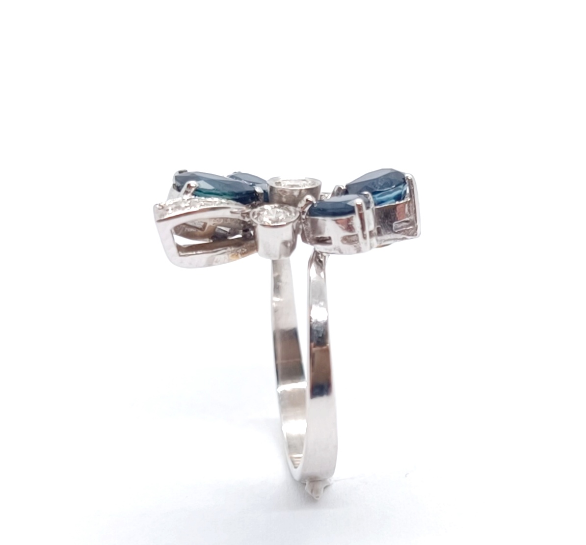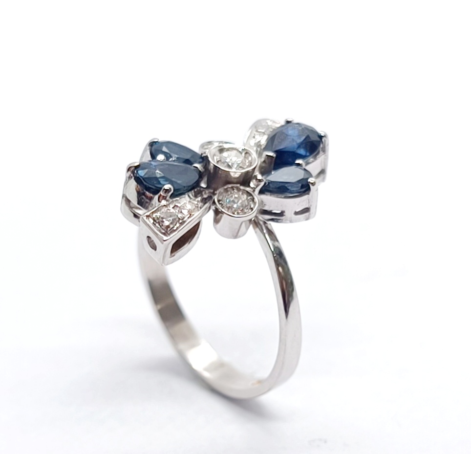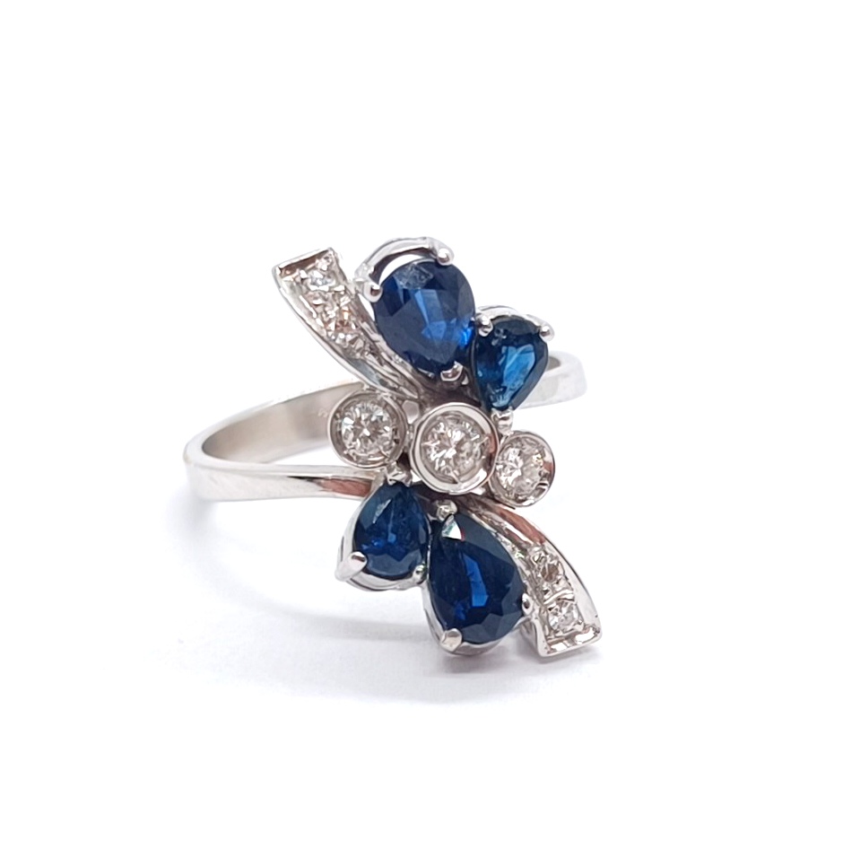 Zlatý prsten se safíry a diamanty briliantového brusu o celkové hmotnosti 0,21 ct, Au btto 4,70g/750/1000, Západní Evropa, 70. léta 20. století; velikost prstenu 51