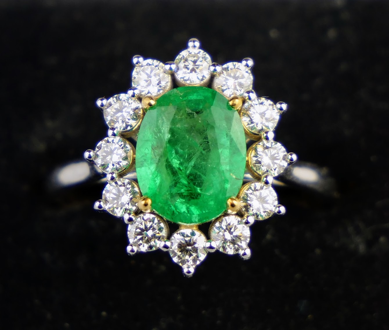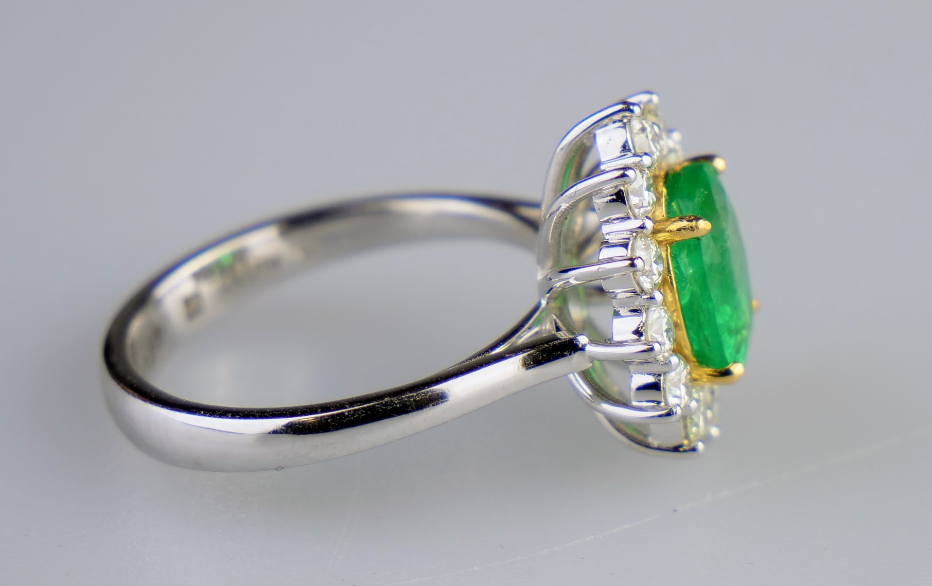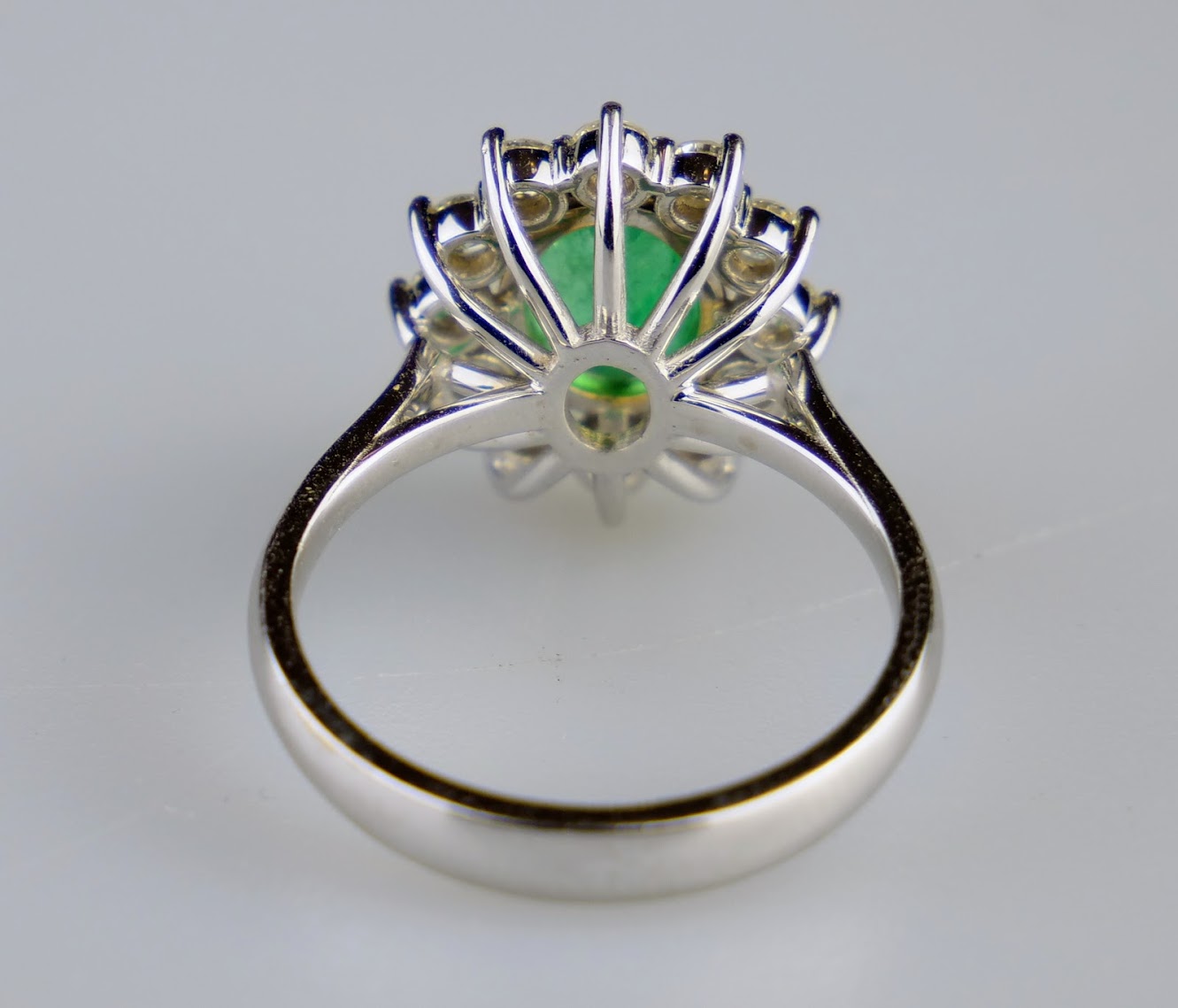 Luxusní prsten z bílého zlata s přírodním smaragdem a s diamanty. Celková hmotnost 5,88 g, Au 585/1000, současný český punc, značka AP&Co. 12 x diamant briliantového brusu vynikající kvality, průměr 2,6 mm, celkem 0,78 ct, přírodní smaragd 9,55 x 7,7 mm, 2,00 ct, malé inkluze, znalecký posudek. Výborný stav, západní Evropa, poslední čtvrtina 20. století. Výška hlavy prstenu 1,7 cm, šířka hlavy prstenu 1,4 cm, velikost 58.