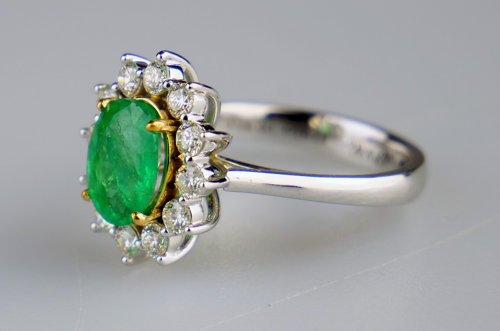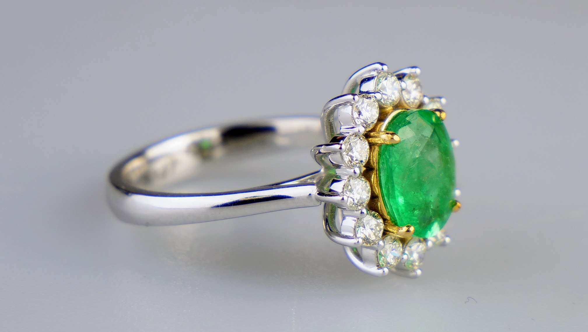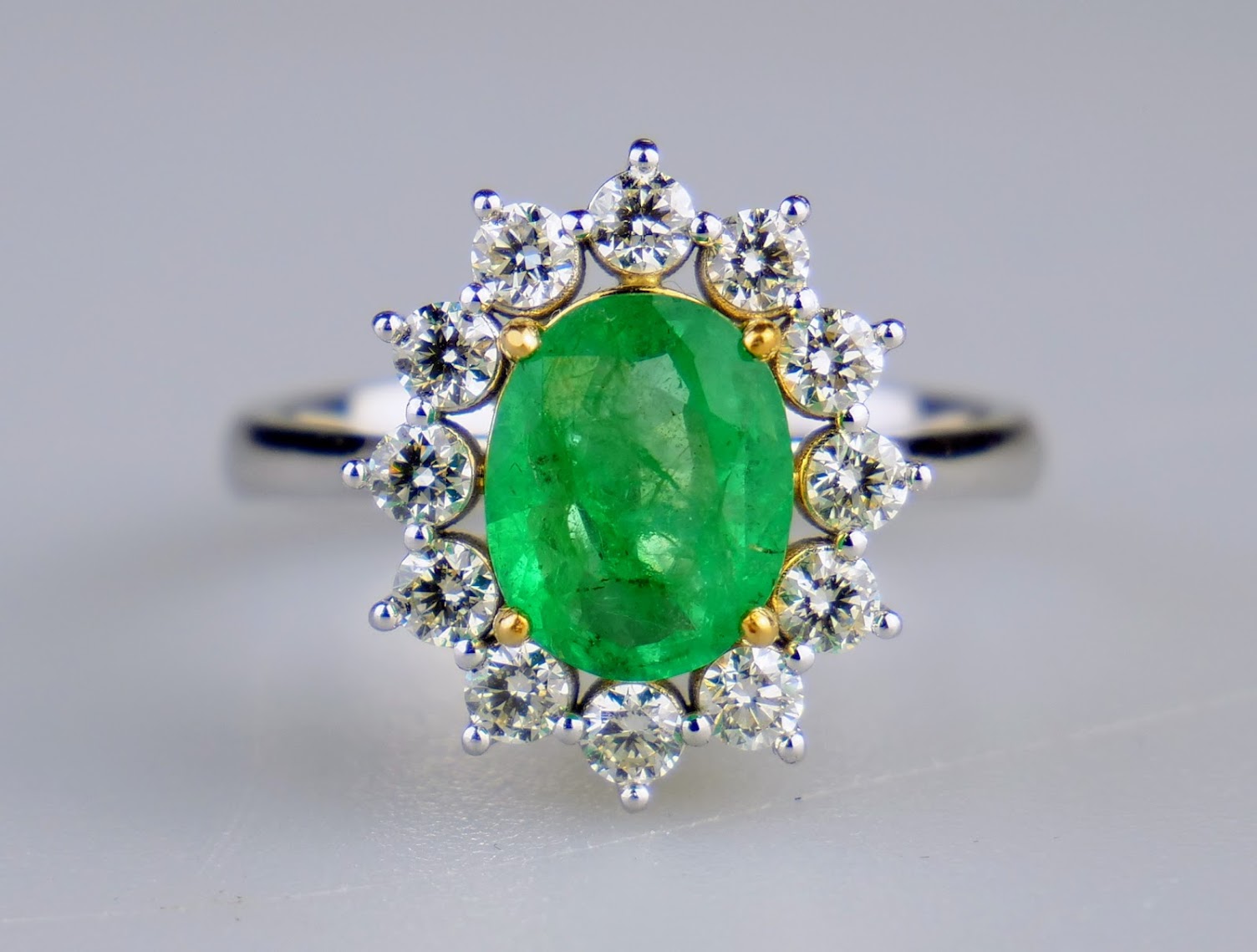Luxusní prsten z bílého zlata s přírodním smaragdem a s diamanty. Celková hmotnost 5,88 g, Au 585/1000, současný český punc, značka AP&Co. 12 x diamant briliantového brusu vynikající kvality, průměr 2,6 mm, celkem 0,78 ct, přírodní smaragd 9,55 x 7,7 mm, 2,00 ct, malé inkluze, znalecký posudek. Výborný stav, západní Evropa, poslední čtvrtina 20. století. Výška hlavy prstenu 1,7 cm, šířka hlavy prstenu 1,4 cm, velikost 58.
