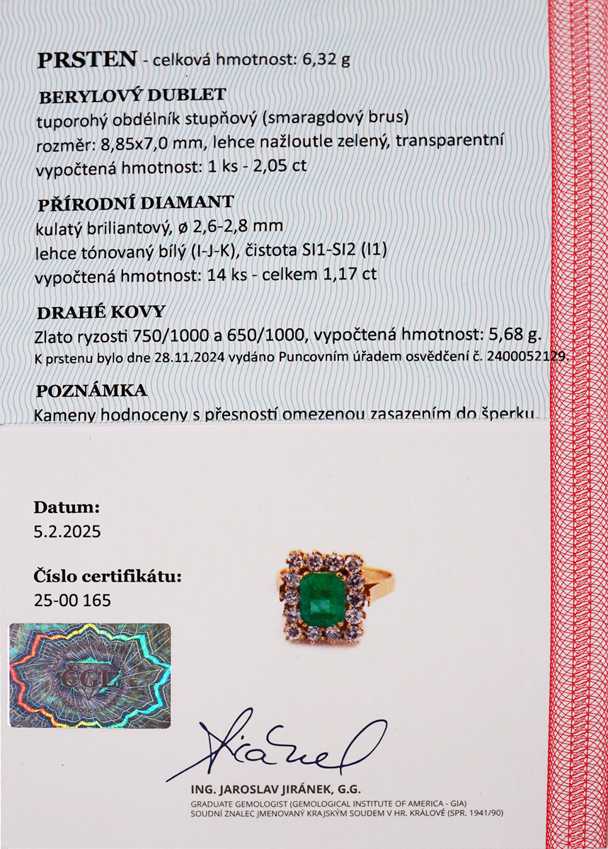berylový dublet 1 ks 2,05 ct, smaragdový brus, rozměr 8,85×7,0 mm
