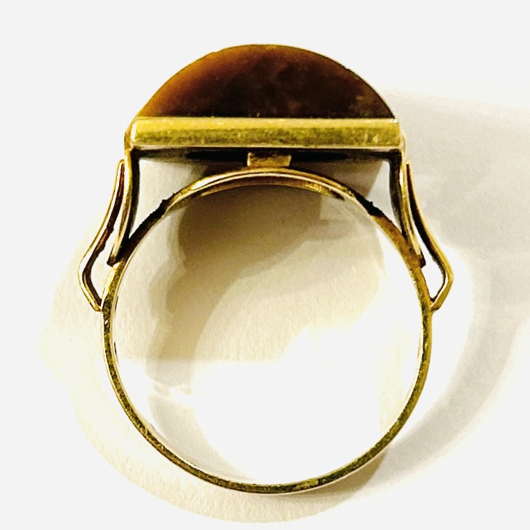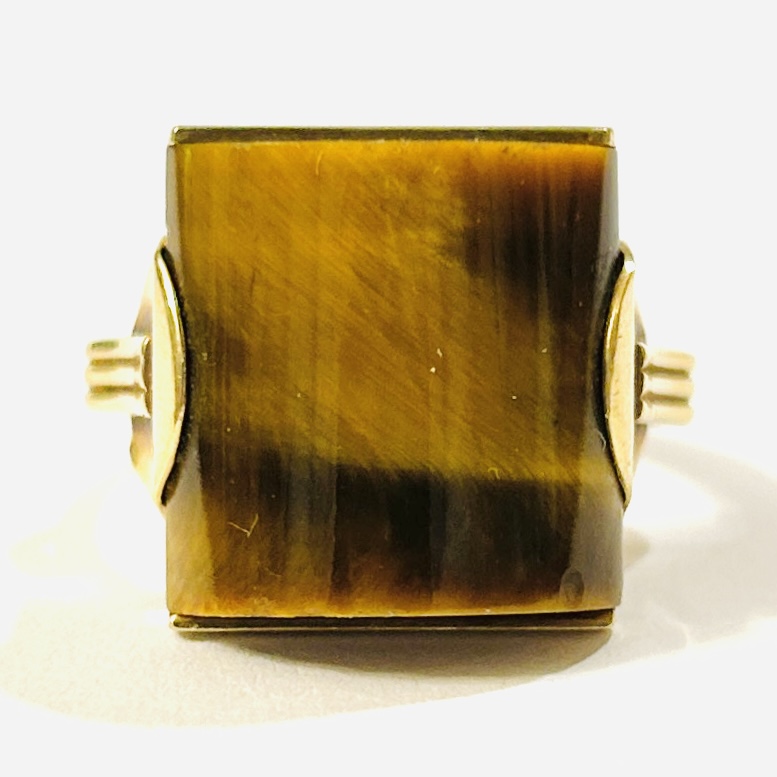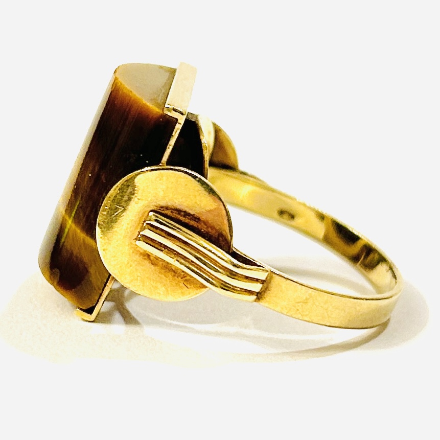 Výrazný prsten koktejlového typu v bruselském stylu, osazeno válcovitě leštěným přírodním tygřím okem, modernisticky pojatá ramena šíny zároveň sloužící též jako podlouhlé krapny. Nápaditá, solidní zlatnická práce DUV Granát v Turnově ze 2. poloviny 60. až počátku 70. let 20. století.
