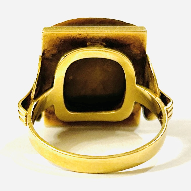 Zhotoveno ze žlutého 14 karátového žlutého zlata, tj. o ryzosti 585/1000; punc Z-36 (čejka 4), ryzostní číslo a značka výrobce \“G2\“ zevnitř šíny. Hmotnost 7,52 g, velikost 58,5, délka hlavice 17,5 mm. Ponecháno s jemnou přirozenou patinou, lze vyčistit, hrany kamene s lehkými oťuky (při nošení není vidět), celkově v zachovalém stavu.