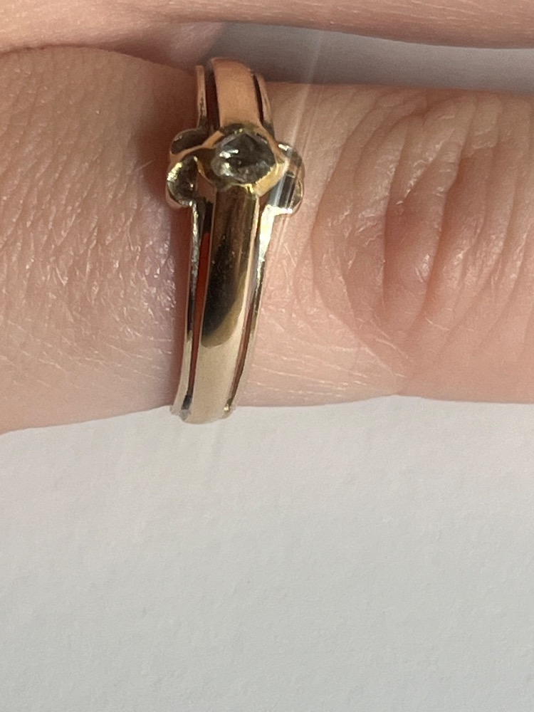 Zlatý prsten ze 14 karátového zlata s diamantovou routou z období Rakousko- Uherska – historický punc Liška – C. Váha prstenu 3,05 gramů brutto. Velikost 54,5