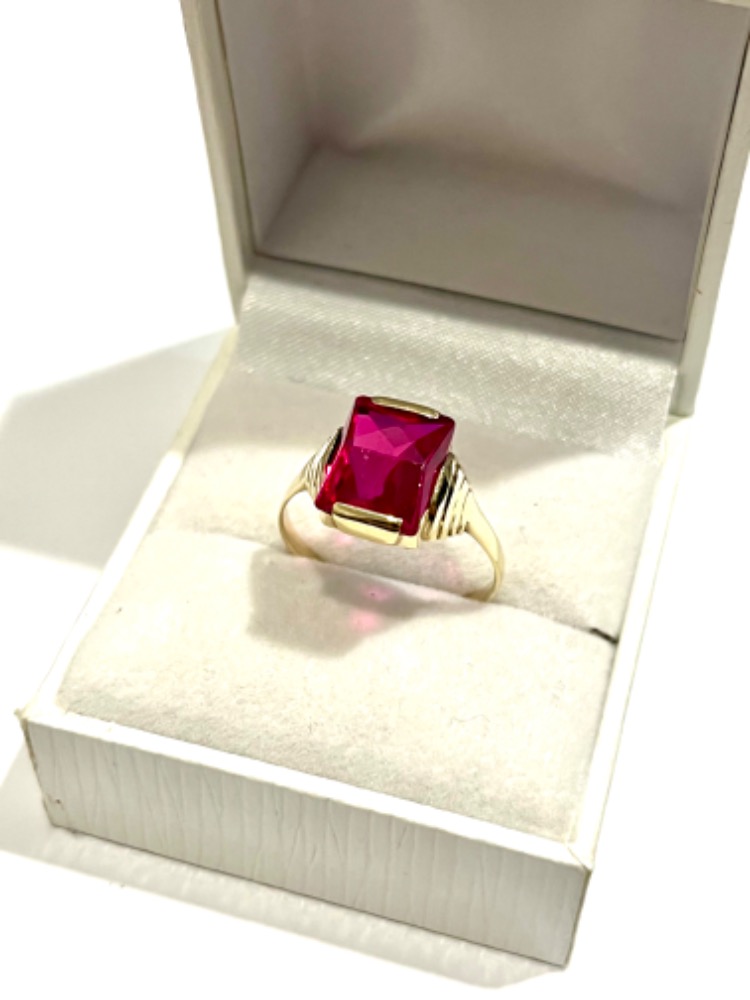 Dámský zlatý prsten ze žlutého 14 karátového zlata – AU 585/1000 doplněný zajímavě broušeným kamenem, váha prstýnku 2,620 gramů. Velikost prstýnku 59 1/2. Prsten je odborně vyčištěn a vyleštěn.