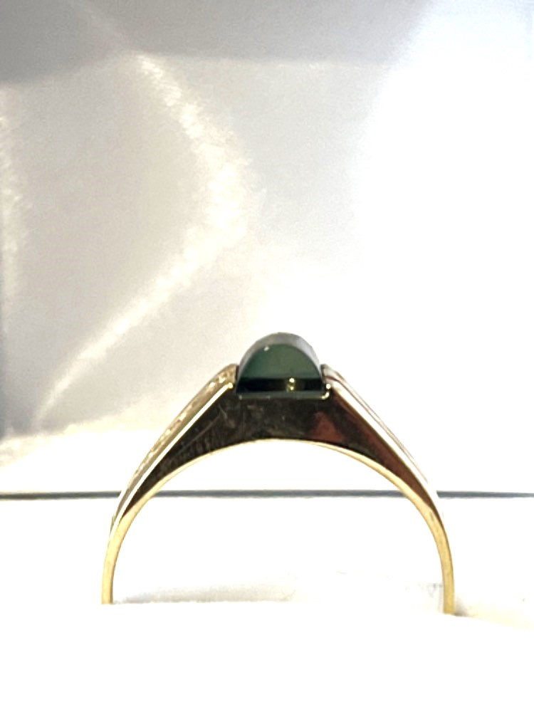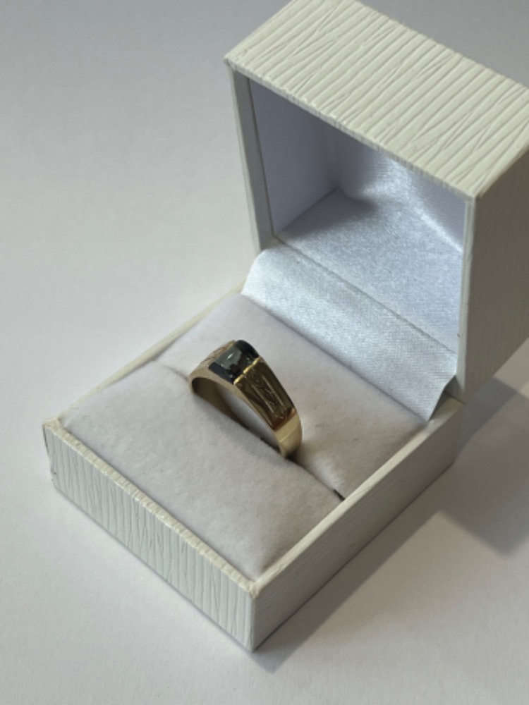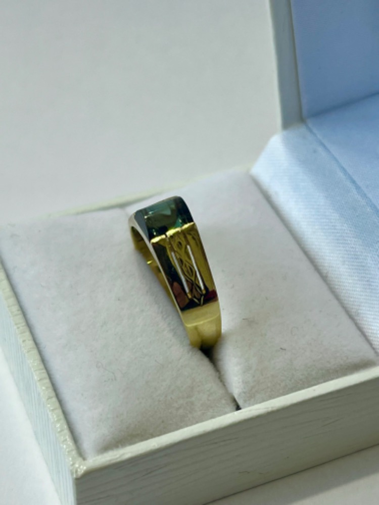 Originální zlatý prsten s velmi zajímavě broušeným kamenem – synt. turmalínem ze žlutého 14 karátového zlata, váha prstenu 3,54 gramů a velikost 58.