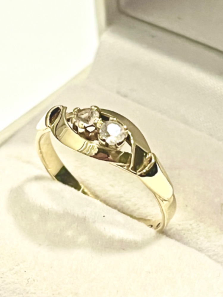 Zlatý prsten ze žlutého 14 karátového zlata = AU 585/1000 doplněný 2 kusy bílých kamenů, váha prstenu 2,190 gramů brutto. Velikost prstýnku 54. Odborně vyčištěno a vyleštěno. Punc Čejka