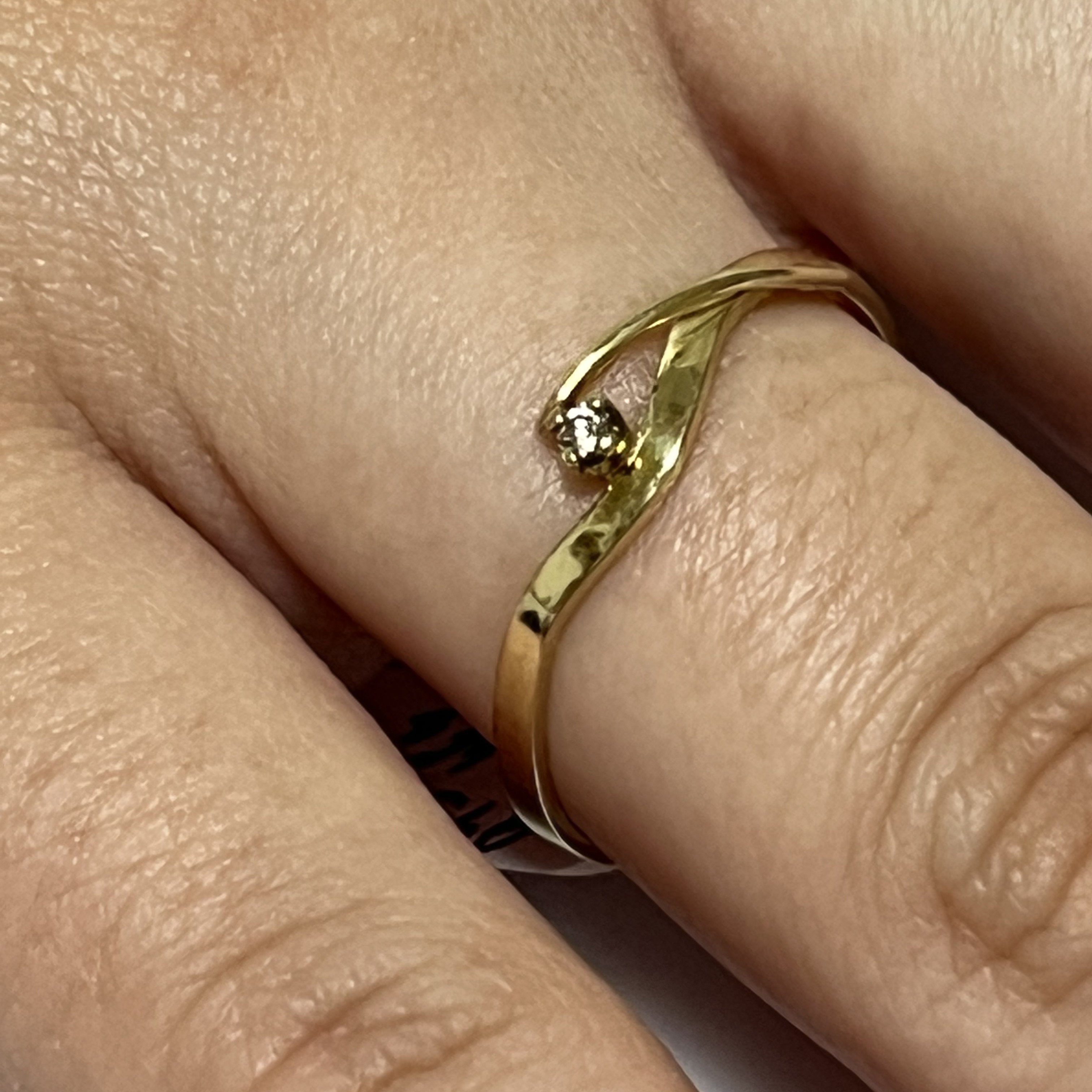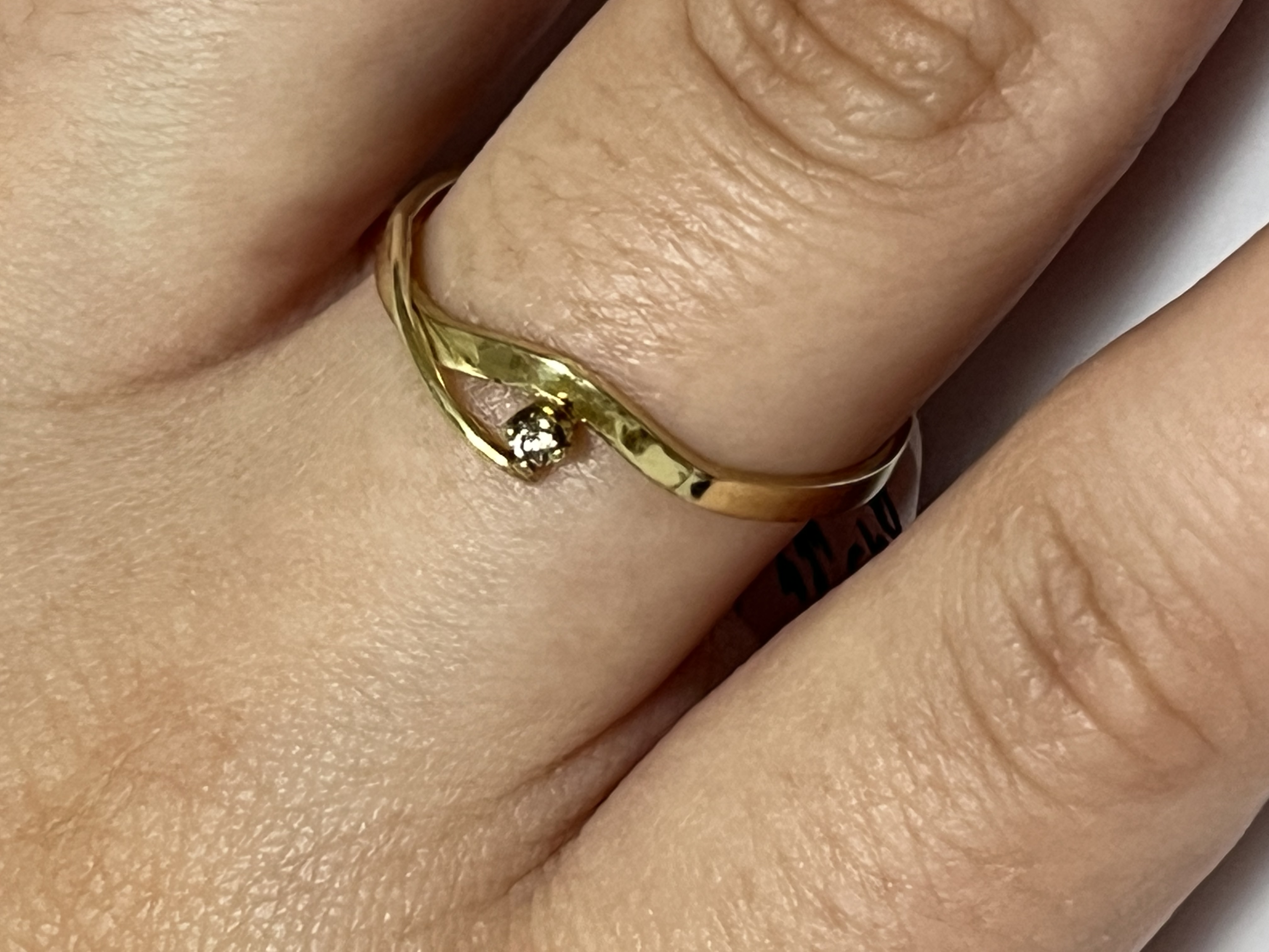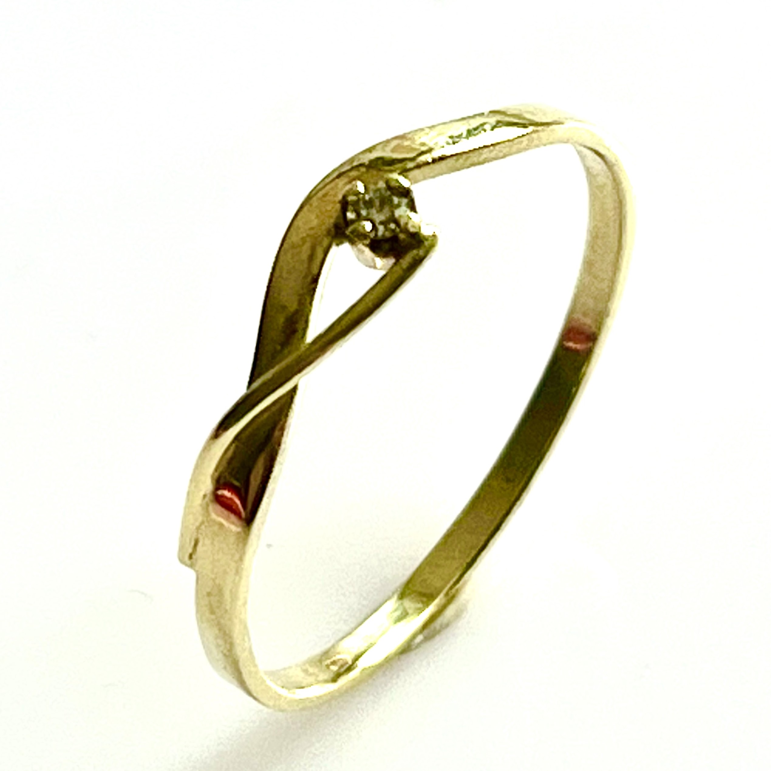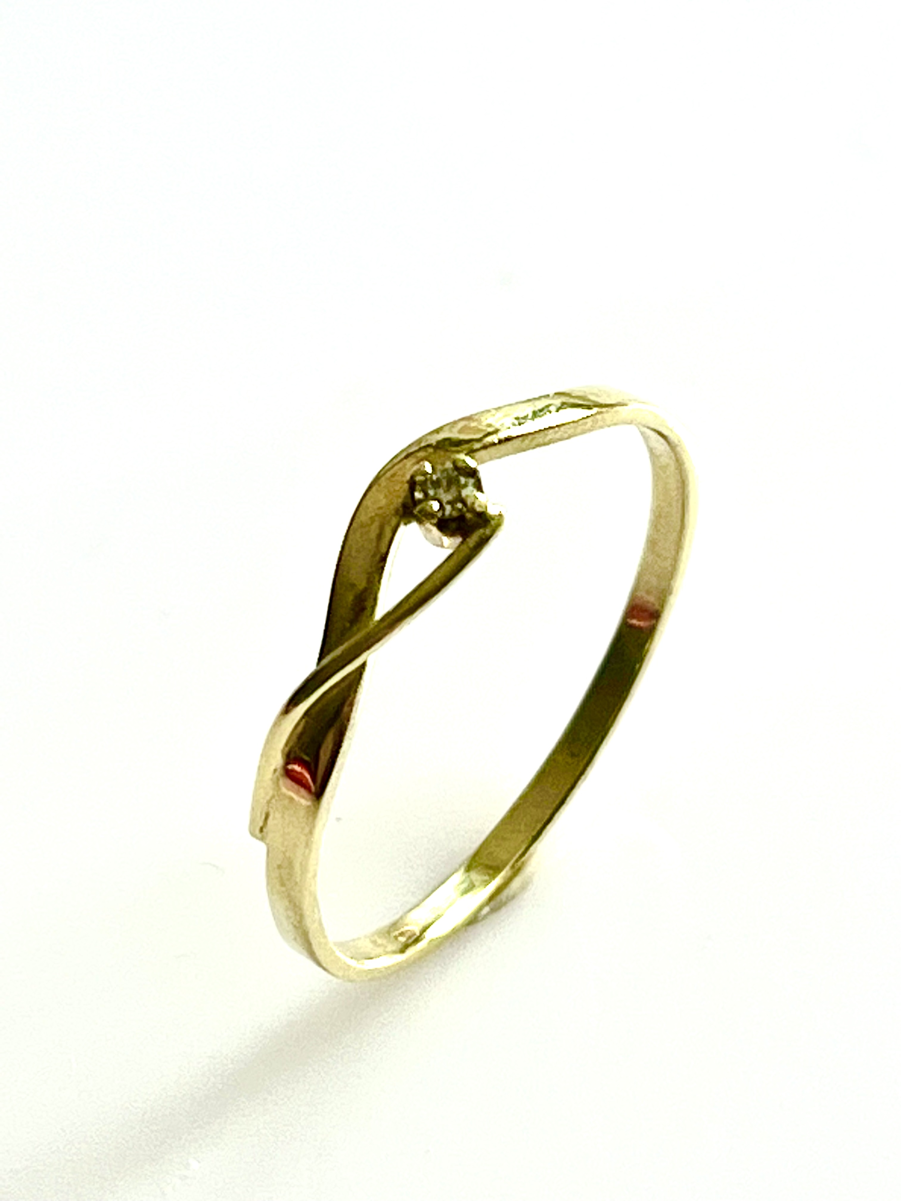 Zlatý prsten ze žlutého 14 karátového zlata AU 585/1000 doplněné jemným briliantem 0,025 ct SI/H. Váha prstenu 1,460 gramů. Prstýnek je ve velké velikosti číslo 63
