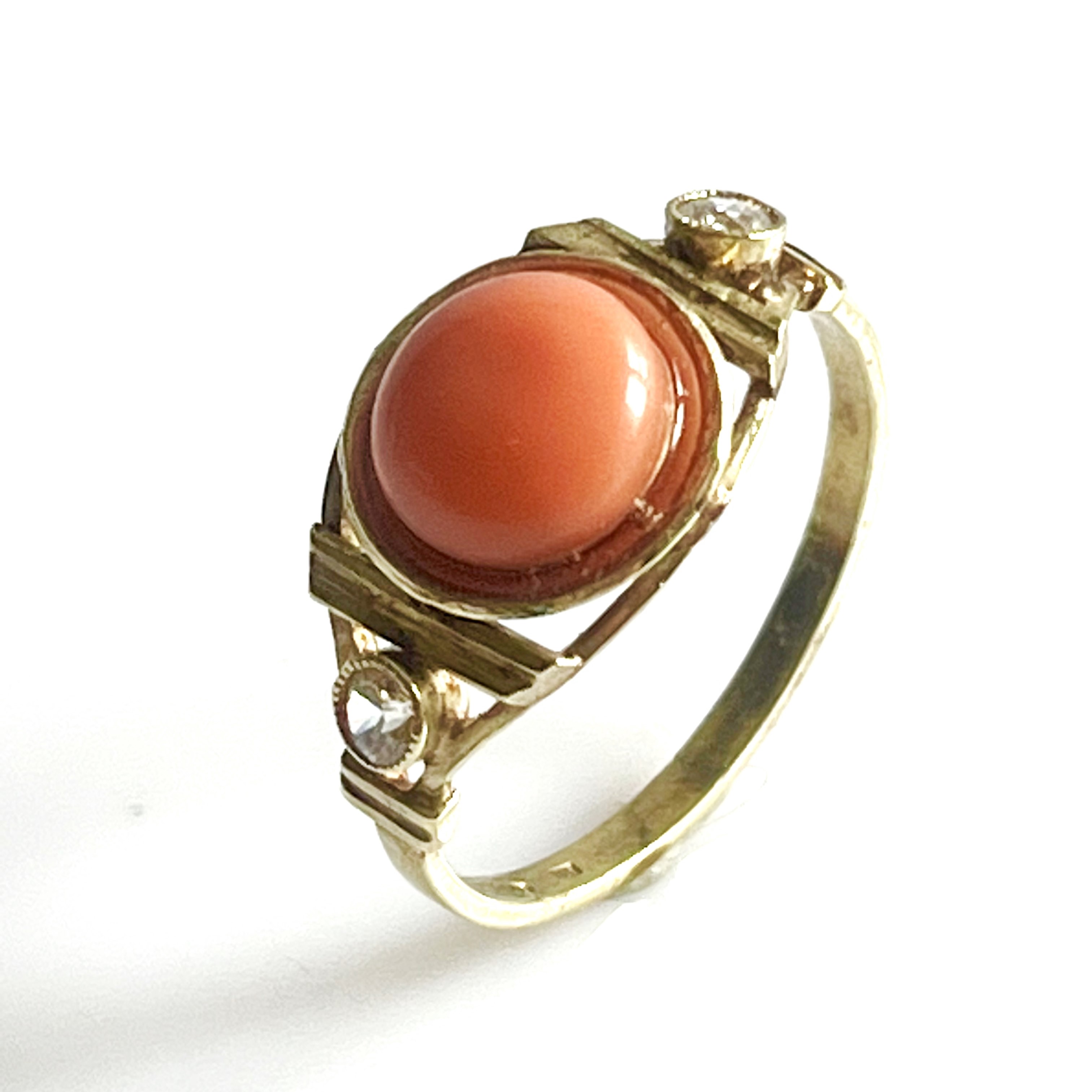 Originální zlatý prsten ze 14 karátového zlata s mořským korálem a leukosafíry-průměr korálu je cca 9,1 mm, Au 585/1000 váha prstýnku brutto 3,36 gramů . Velikost číslo 61