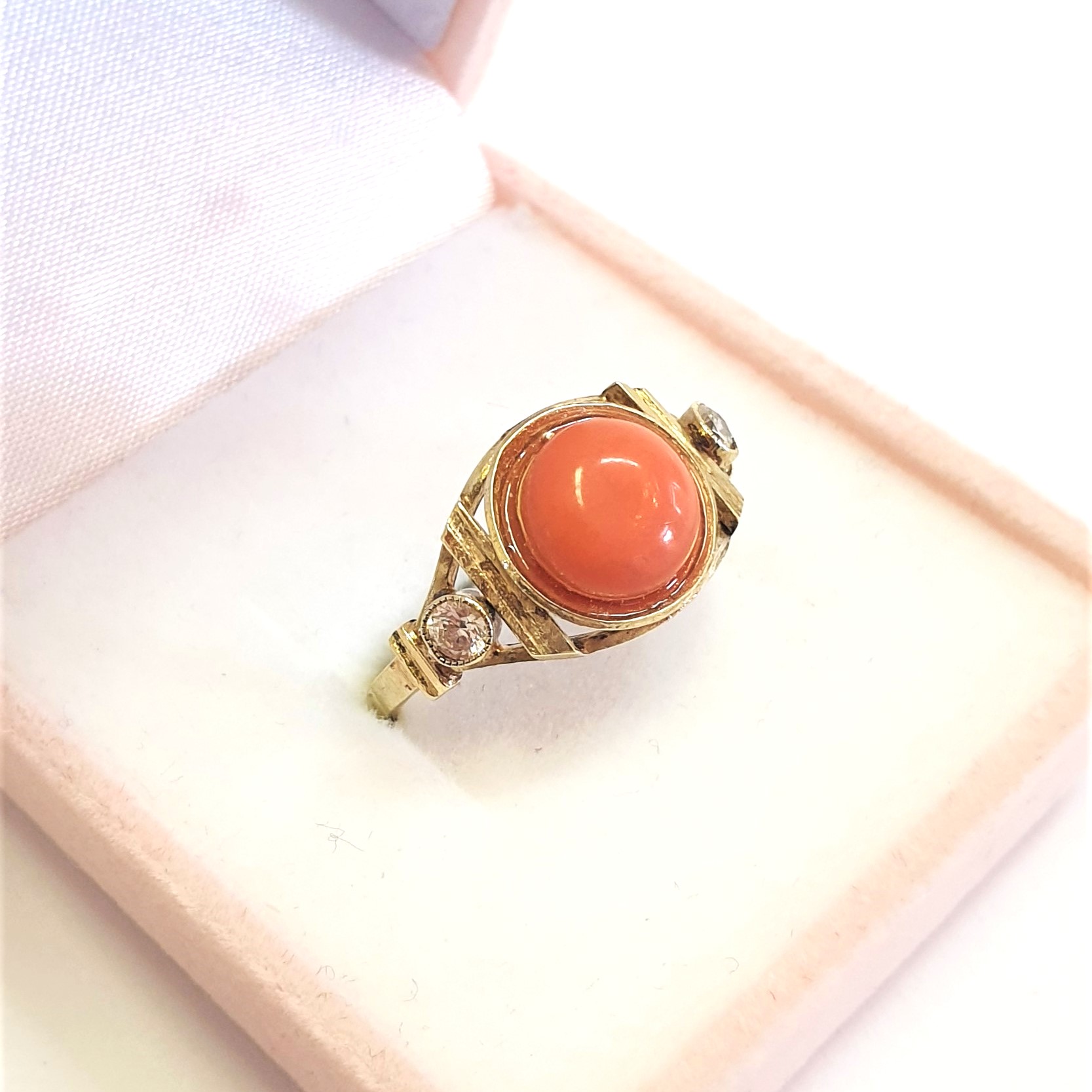 Originální zlatý prsten ze 14 karátového zlata s mořským korálem a leukosafíry-průměr korálu je cca 9,1 mm, Au 585/1000 váha prstýnku brutto 3,36 gramů . Velikost číslo 61