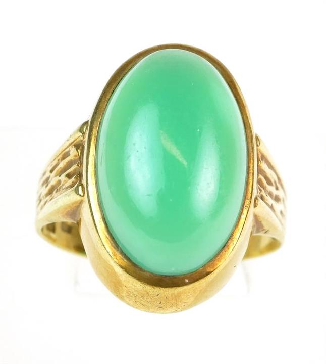 Zlatý prsten s chryzoprasem, Zlato o ryzosti 14 karátů 585/1000, hmotnost 4,49 g,