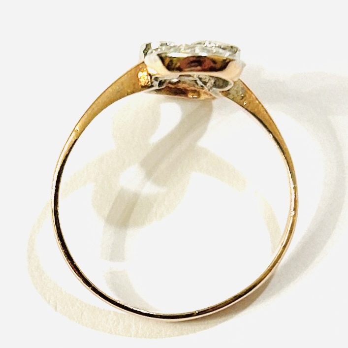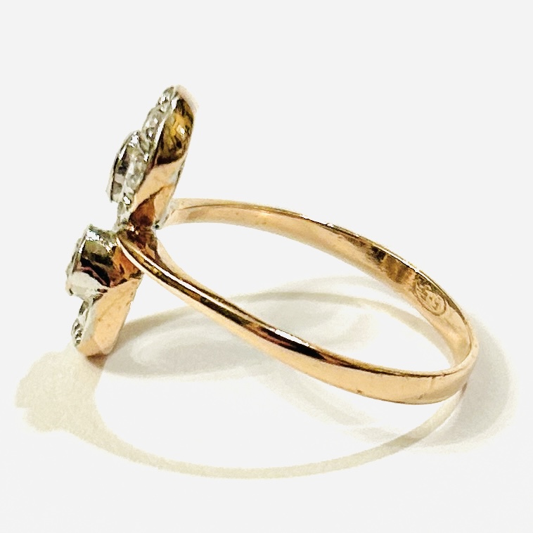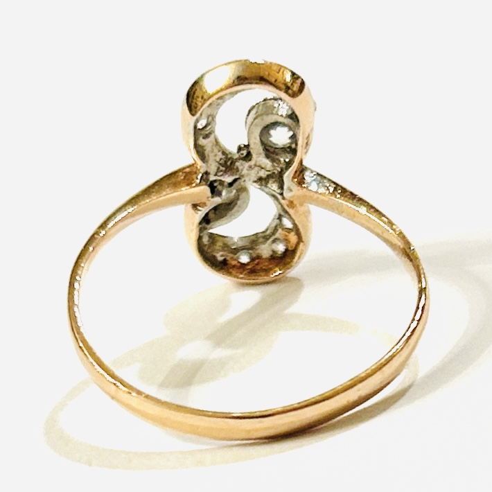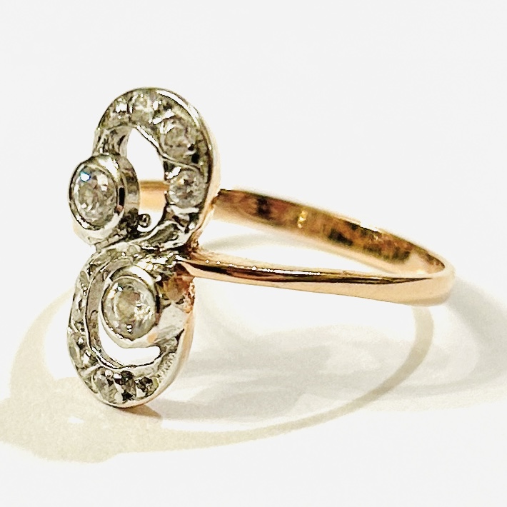 Půvabný, jemný prsten zhotovený patrně dle dobové secesní předlohy. Atypická hlavice ve tvaru \“8\“ pletence tvořena dynamicky se rozšiřujícími křivkami, zvýrazněno 2 většími kameny, osázeno přírodními diamanty kulatého briliantového a jednoduchého brusu o celkové váze 0,24 ct (8 ks), uloženo v lůžkách z bílého zlata. Západoevropská práce z konce 20. století.