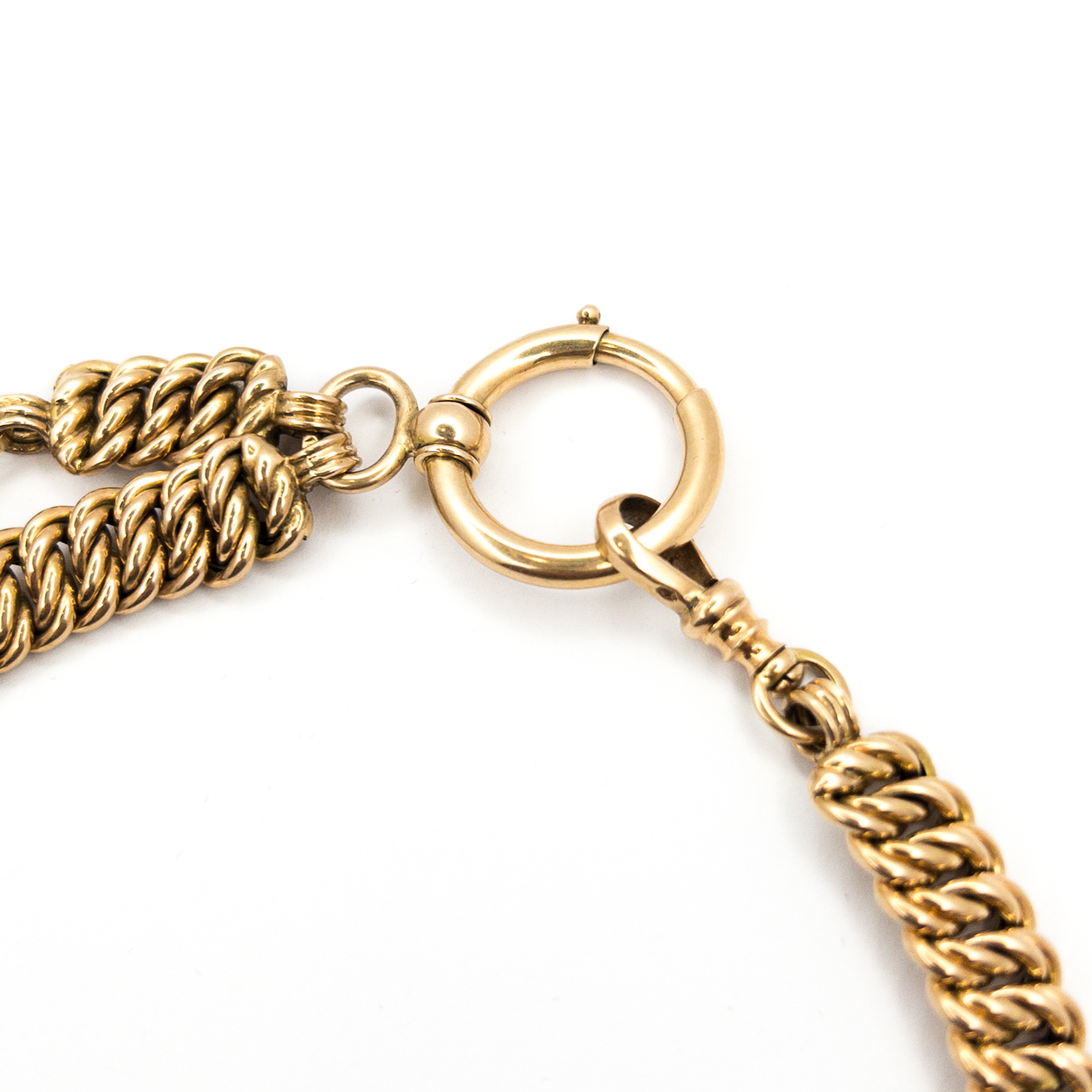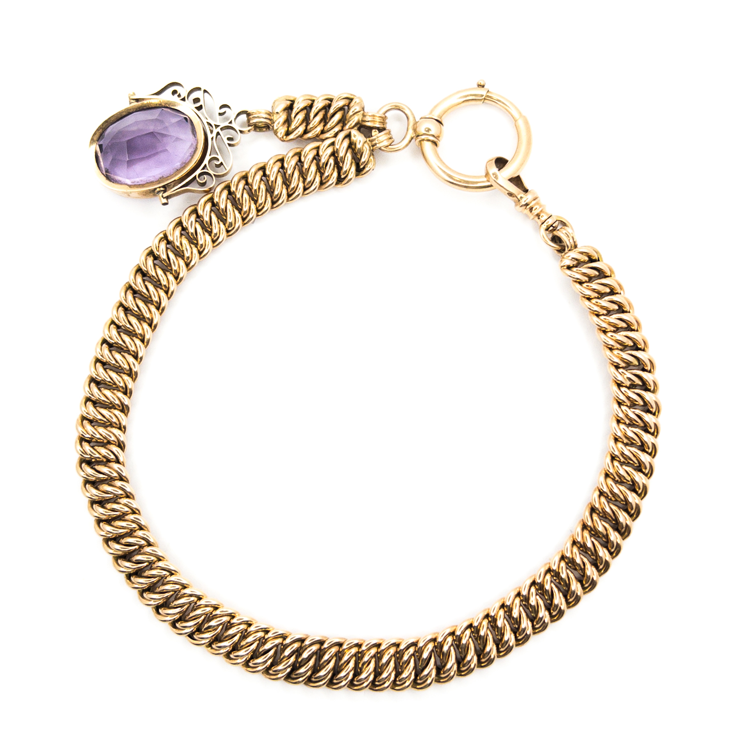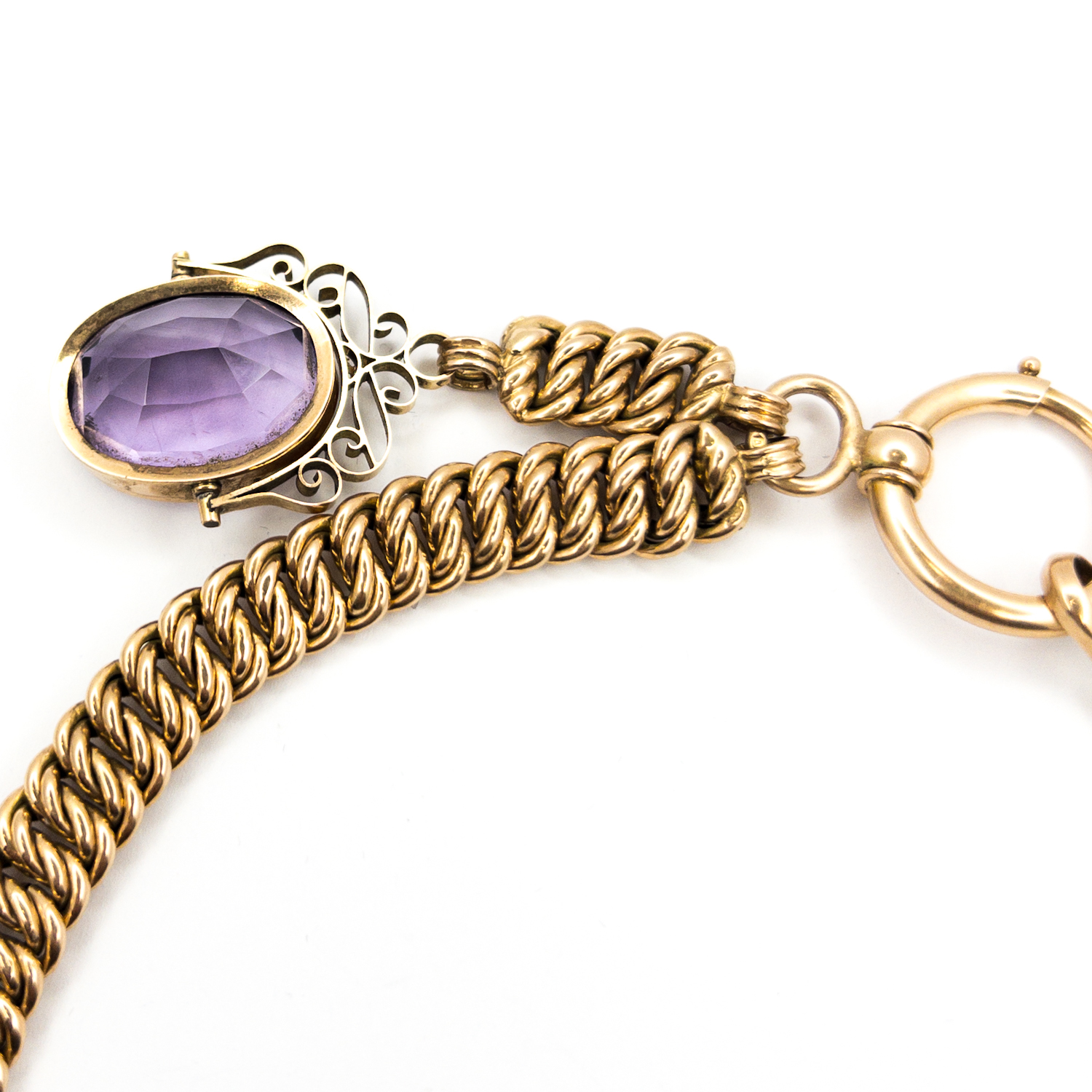 Klasický zlatý splétaný řetěz – šatlén k hodinkám s ametystem,