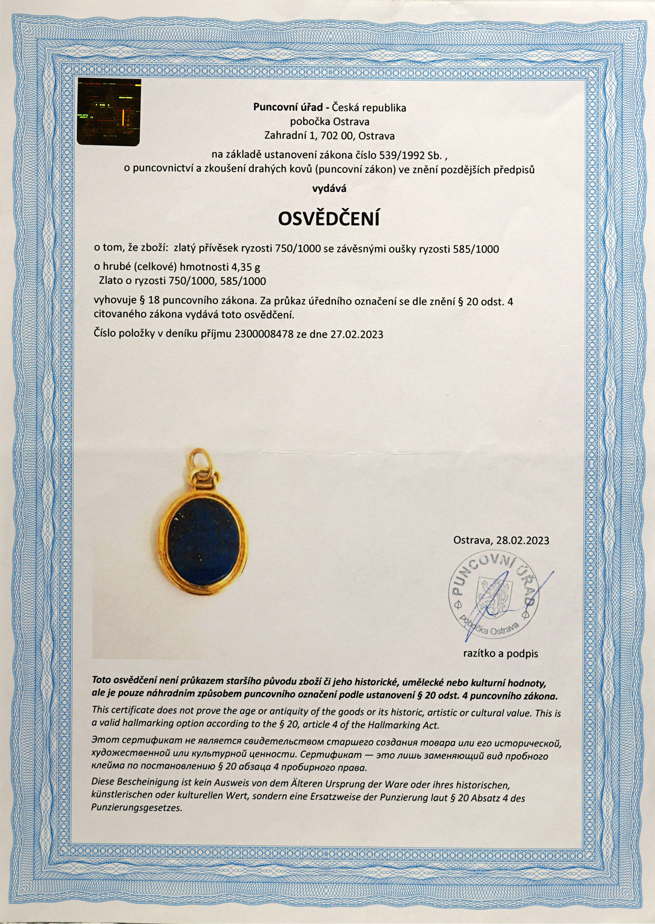Zlatý řetízek s přívěskem osazeným kamenem lapis lazuli, Au 9,35 g, 585/1000. Délka řetízku 49 cm. Délka přívěsku 3 cm.