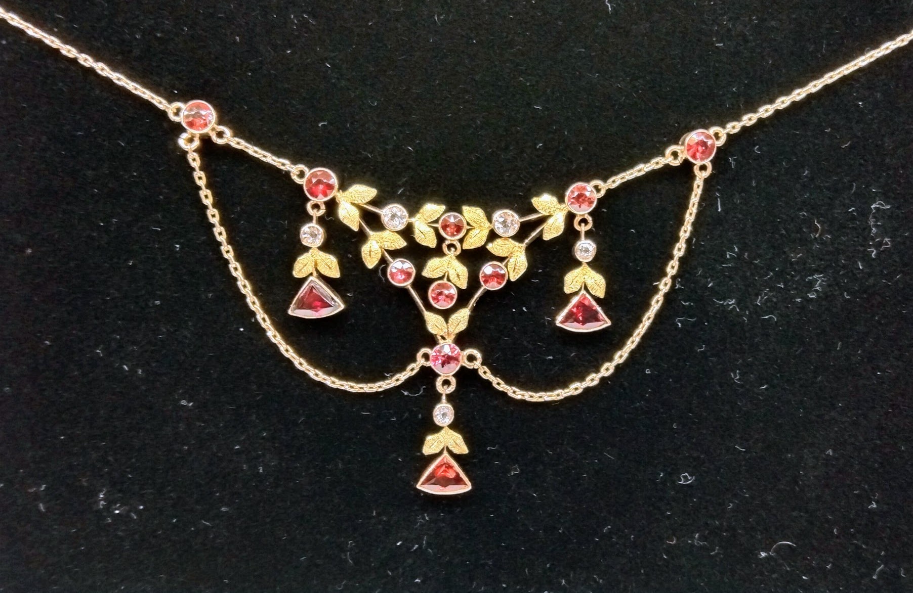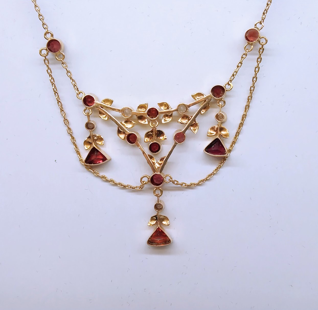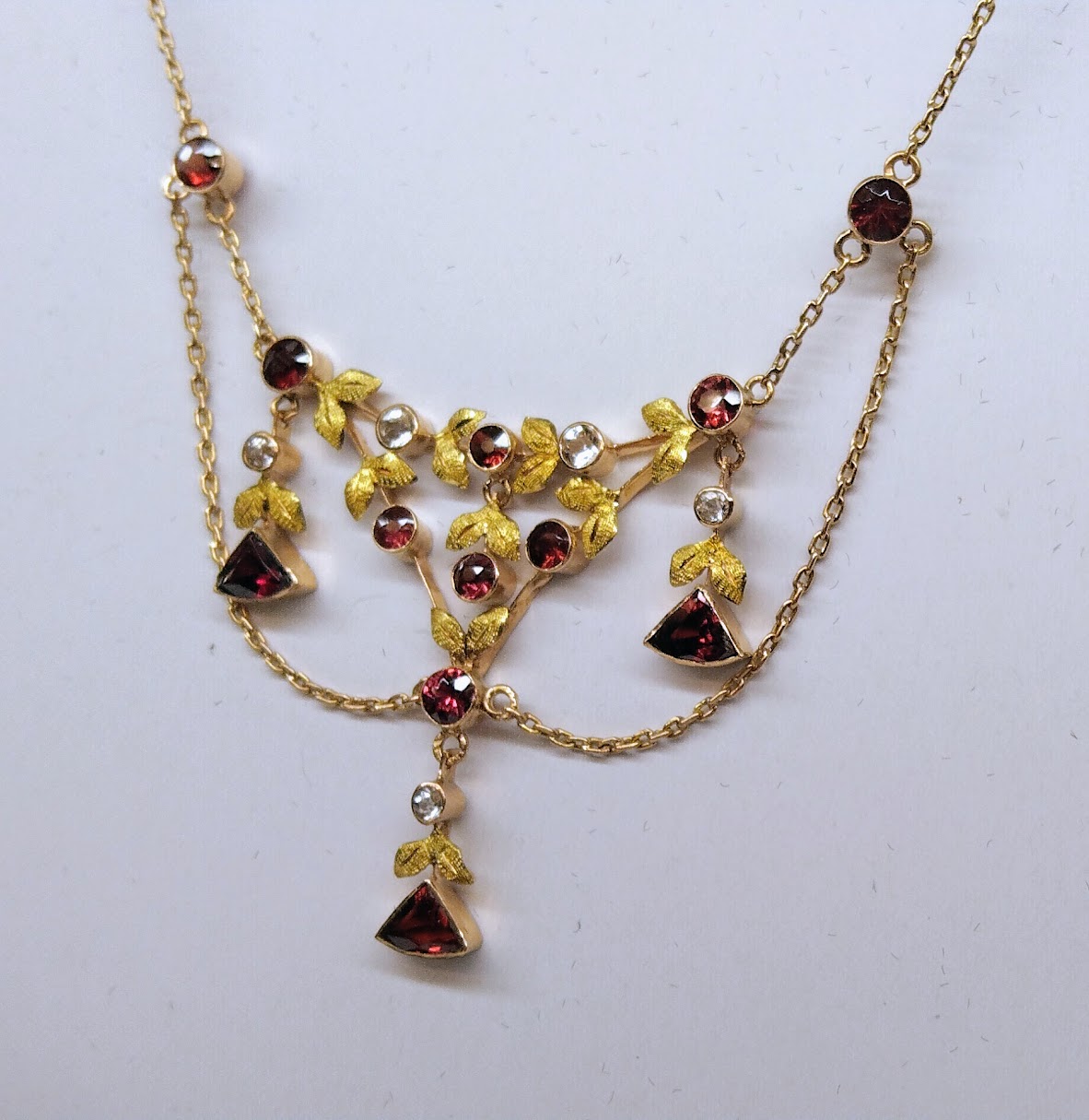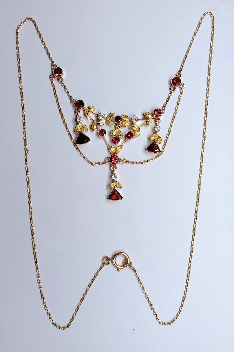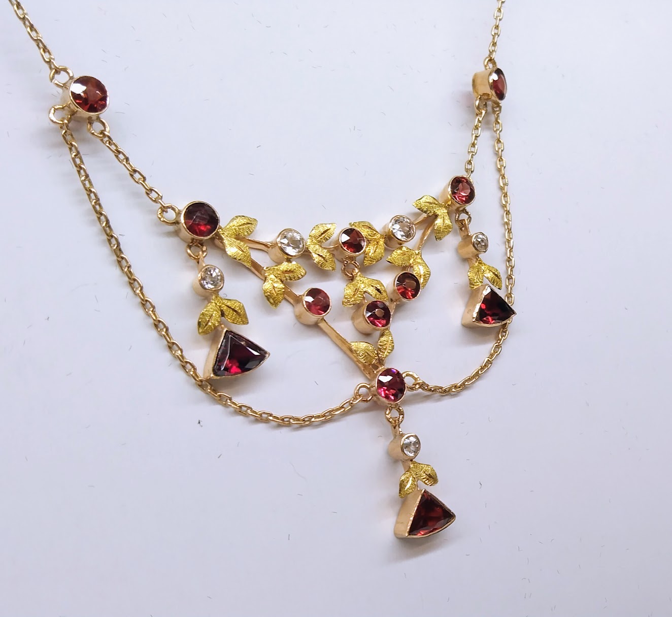 Zlatý secesní náhrdelník s almandiny a leukosafíry. Celková hmotnost 7,20 g, Au 580/1000, punc liška (Z – 27), Praha, mistrovská značka nečitelná. Excelentní šperkařská práce, České království, druhá dekáda 20. století. Délka závěsu 3,8 cm, šířka 3,6 cm, délka řetízku 42 cm.