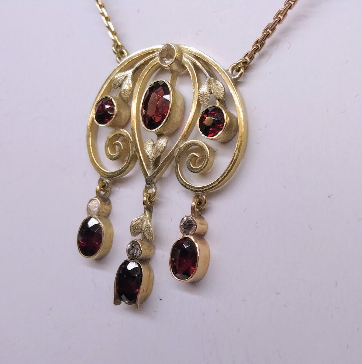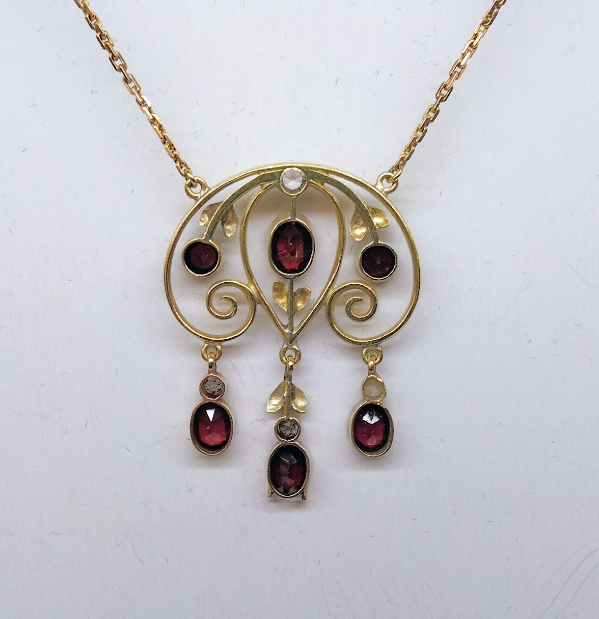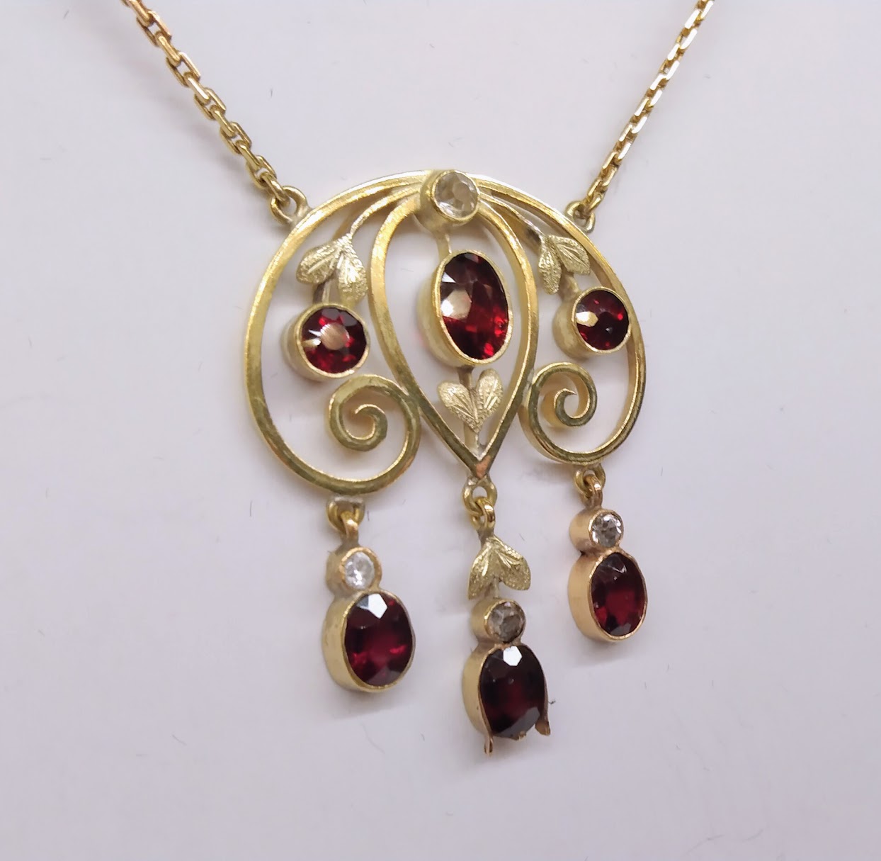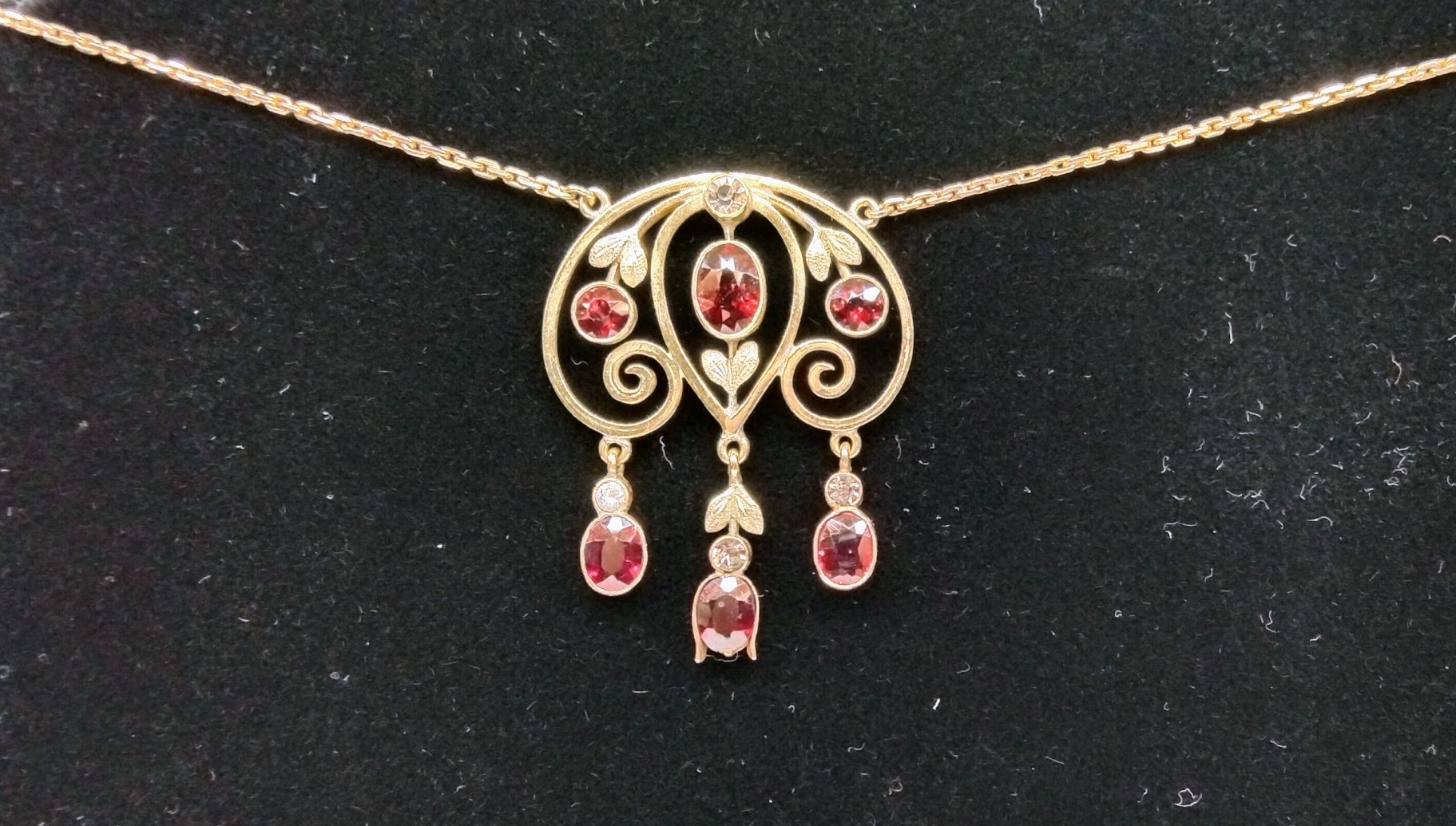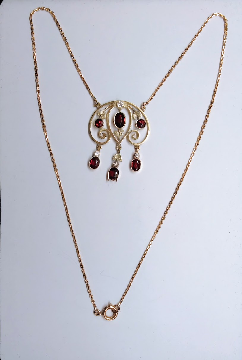 Zlatý secesní náhrdelník s almandiny a leukosafíry. Celková hmotnost 8,55 g, Au 585/1000, osvědčení Puncovního úřadu, značka výrobce JP v kartuši. Špičková šperkařská práce, České království, druhá dekáda 20. století. Délka závěsu 3,5 cm, šířka 3 cm, délka řetízku 40 cm.