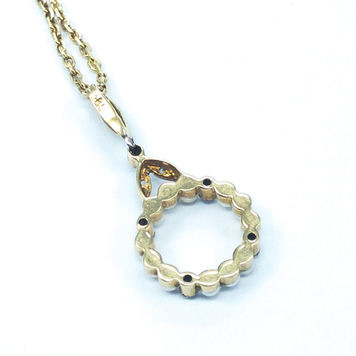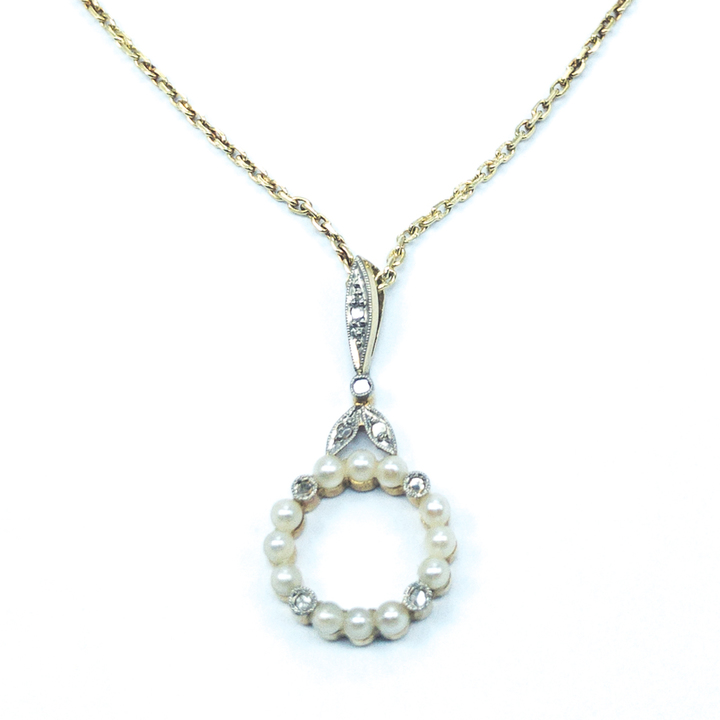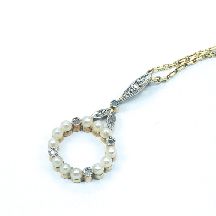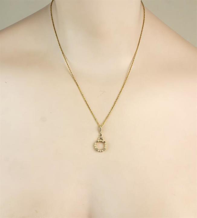 Zlatý secesní náhrdelník s diamantky a perličkami, zlato o ryzosti 14 karátů 585/1000 o celkové hmotnosti 3,35 g,