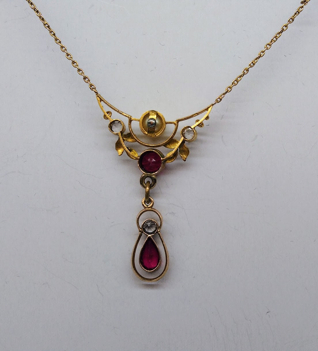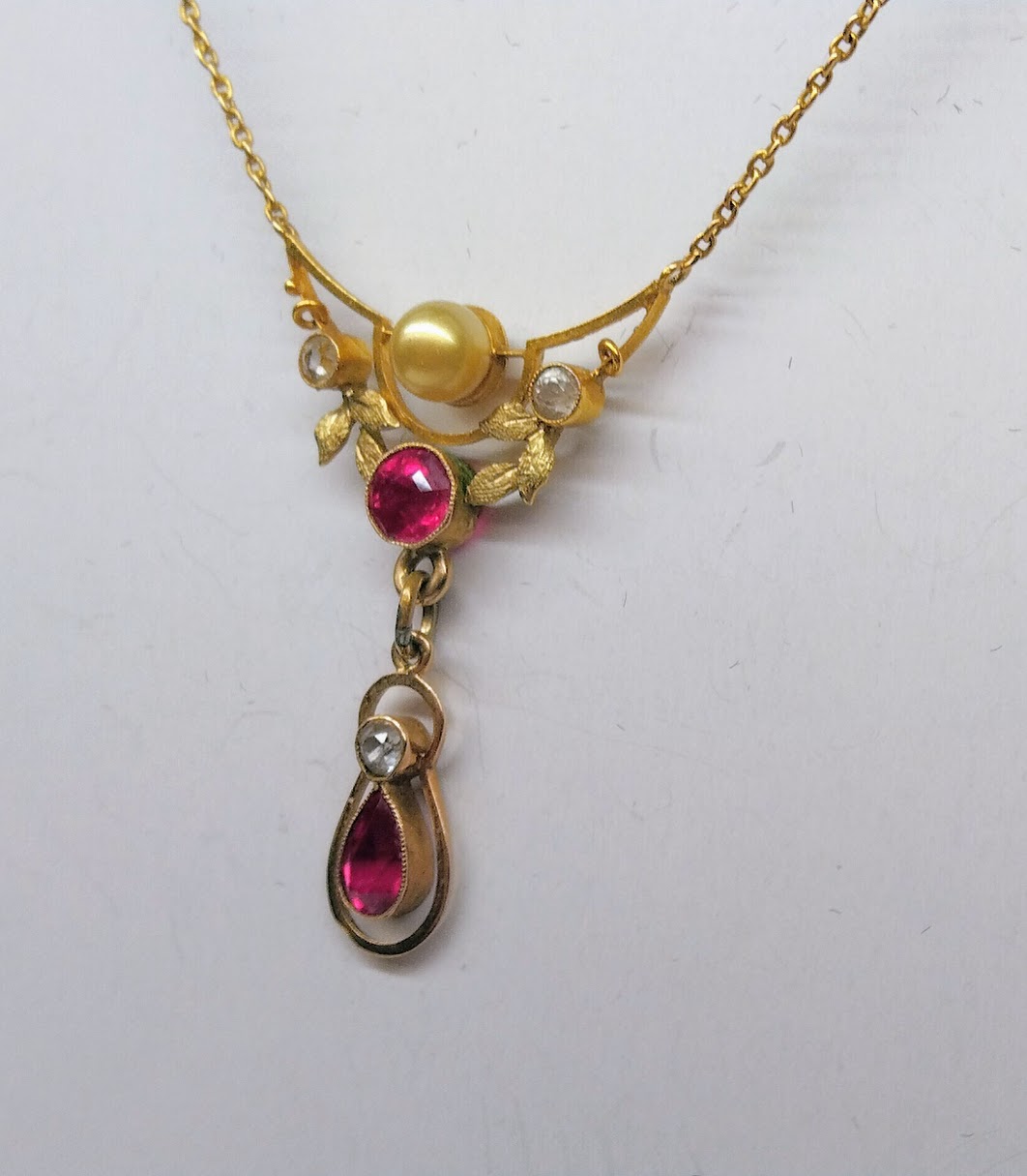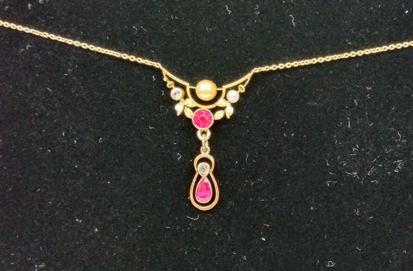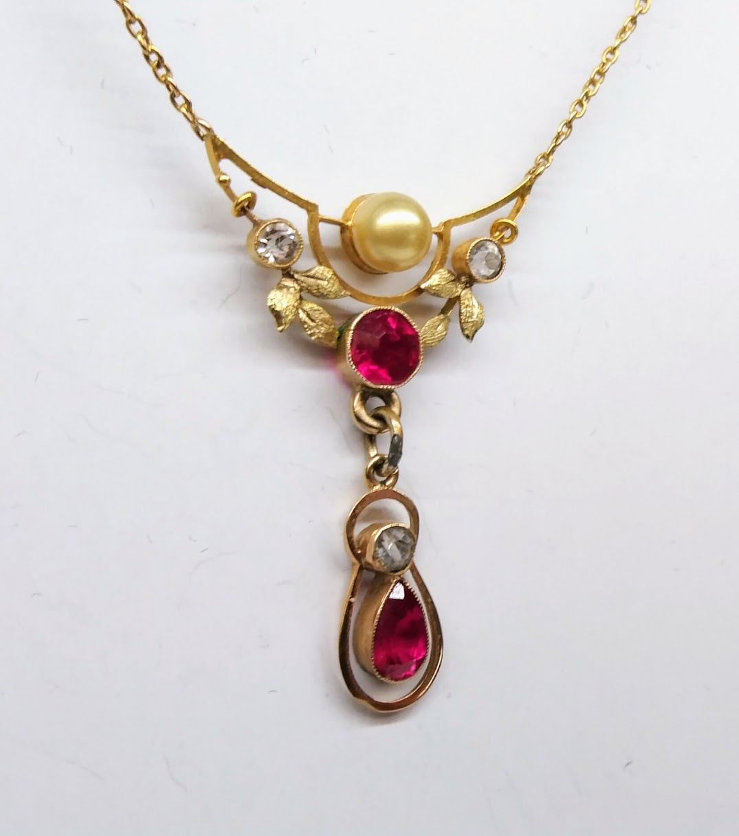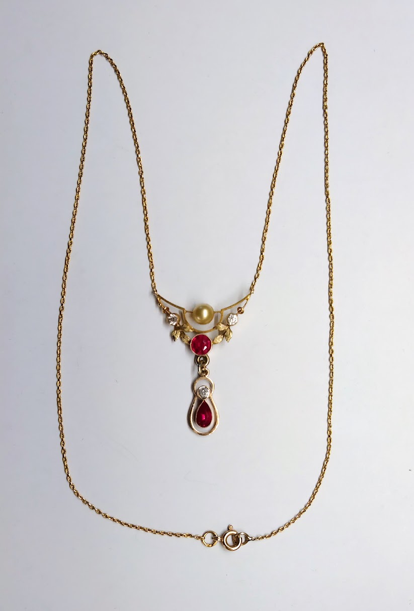 Zlatý pozdně secesní náhrdelník s perlou, syntetickými rubíny a leukosafíry. Celková hmotnost 3,36 g, Au 580/1000, punc čejka (Z – 36). Špičková šperkařská práce, Republika Československá, druhá čtvrtina 20. století. Délka závěsu 3,5 cm, šířka 2,3 cm, délka řetízku 39 cm.
