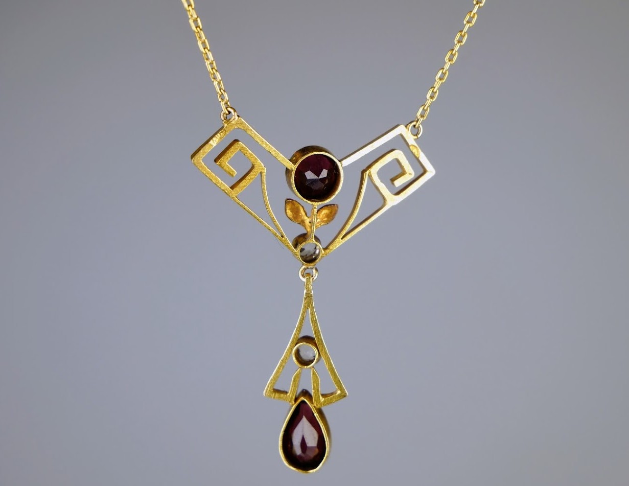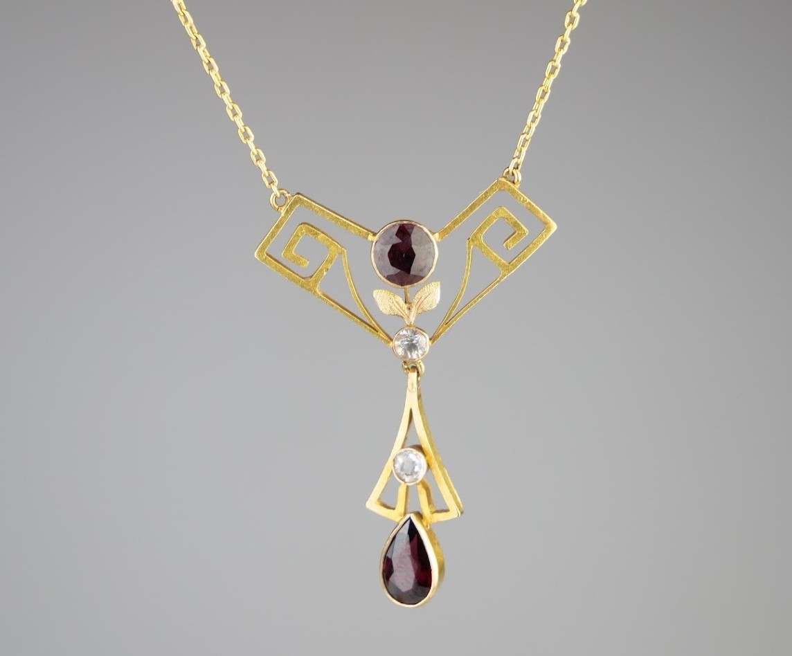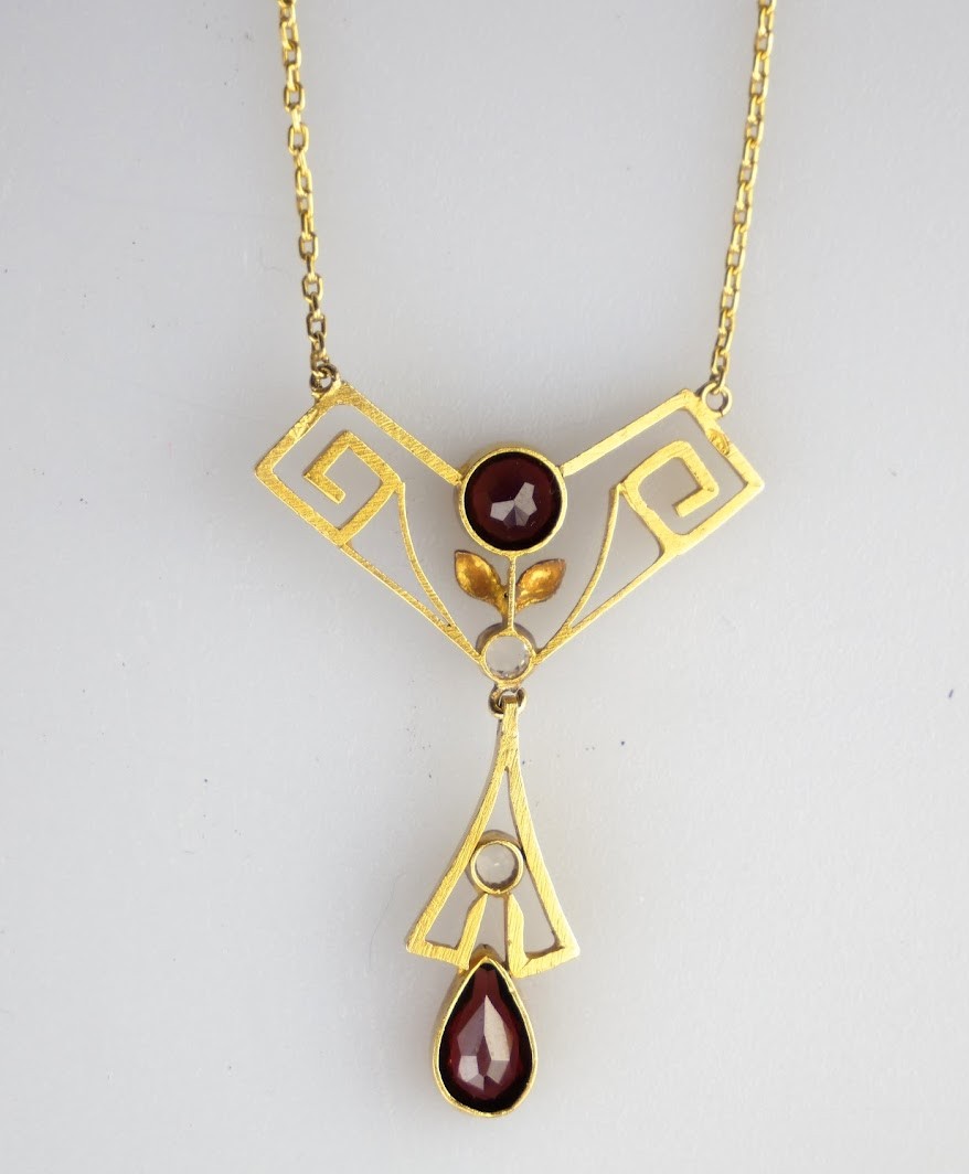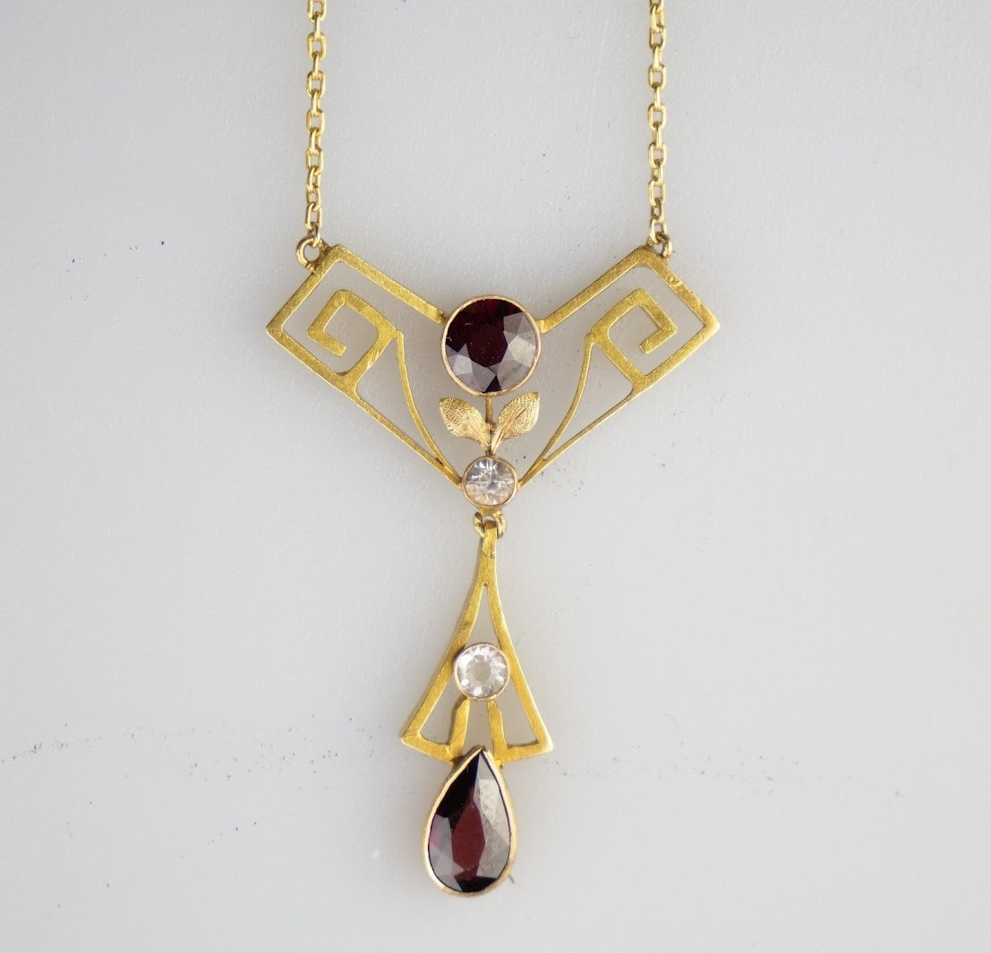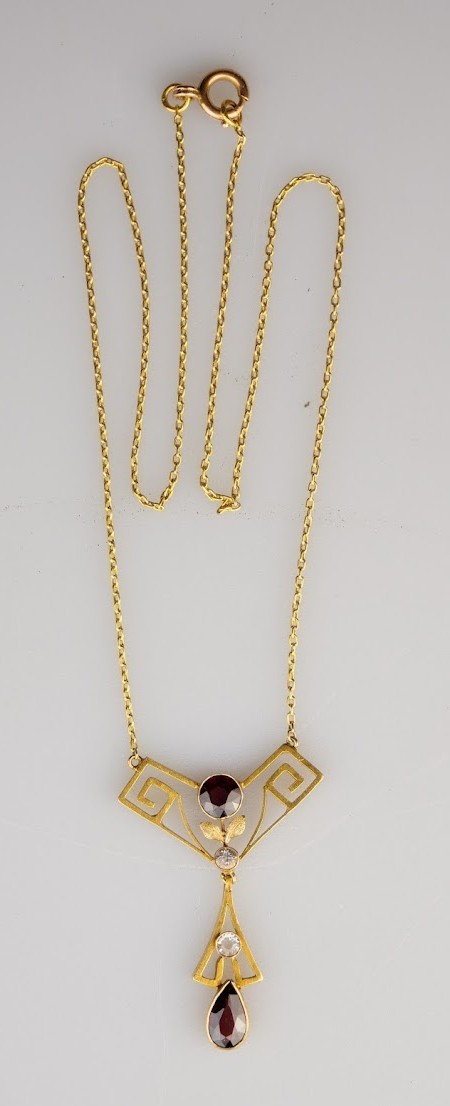 Zlatý pozdně secesní geometrizující náhrdelník se syntetickými rubíny a leukosafíry, s drobným florálním motivem. Celková hmotnost 5,50 g, Au 580/1000, punc liška (Z – 27), Praha. Kameny kruhového a kapkového brusu zafasovány v soudkovitých obrubách. Špičková šperkařská práce, České království, druhá dekáda 20. století. Délka závěsu 4,3 cm, šířka 2,9 cm, délka řetízku 38 cm.