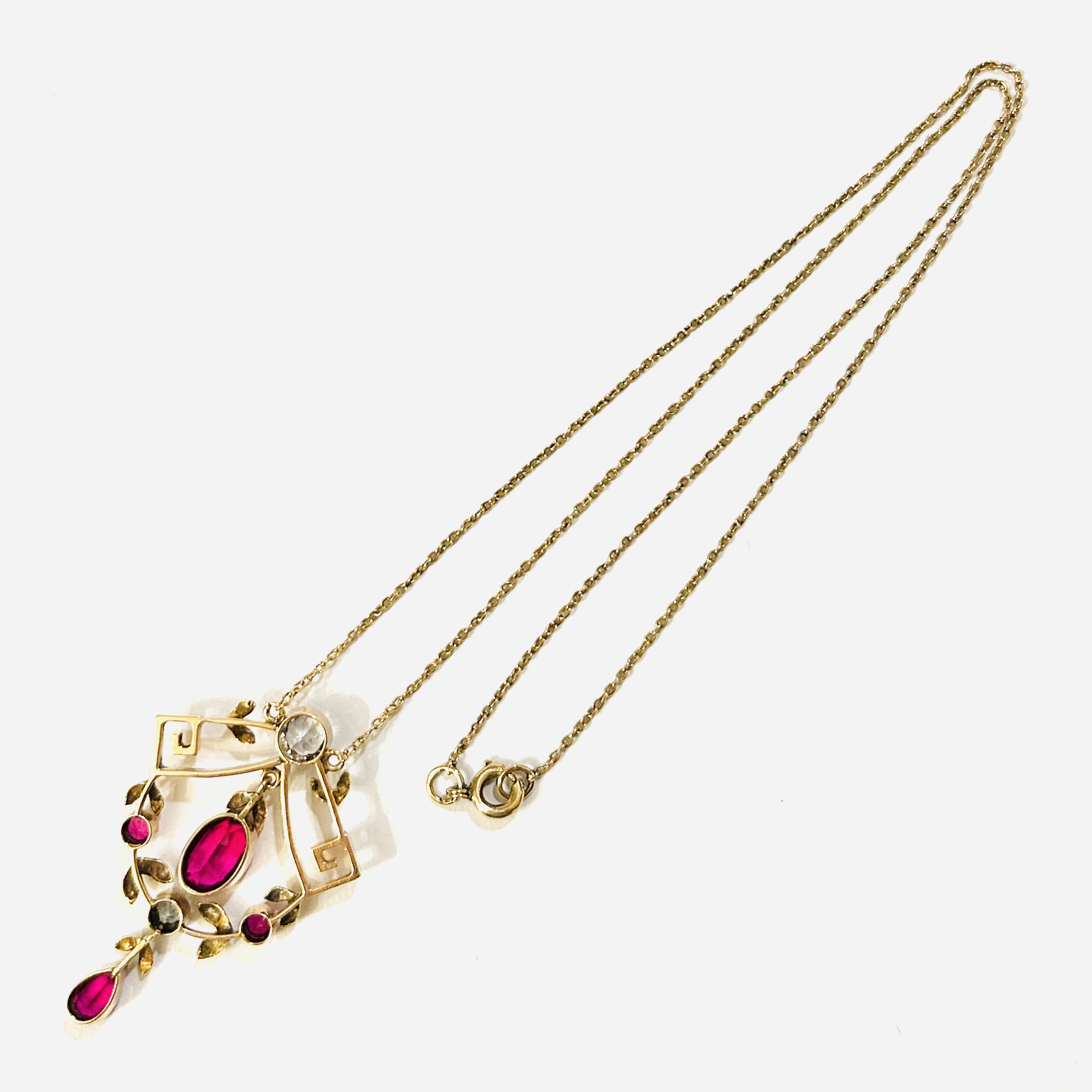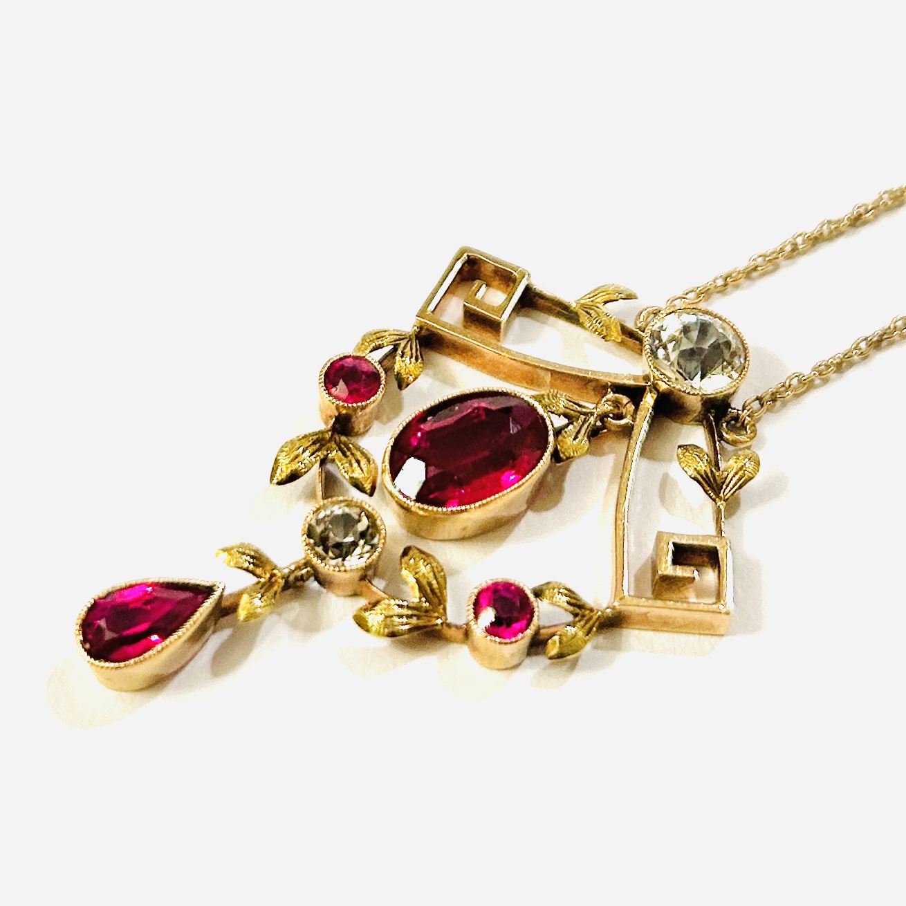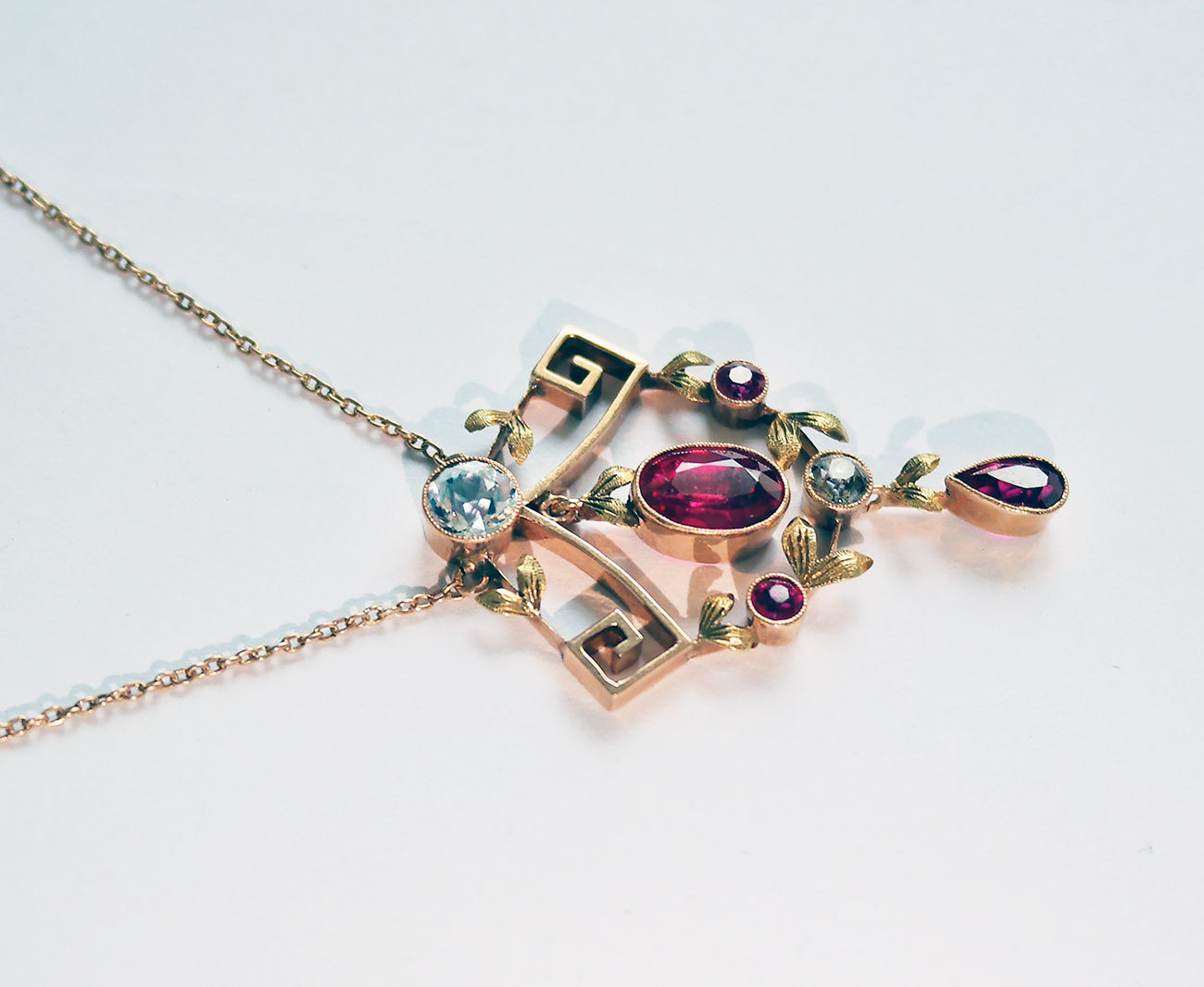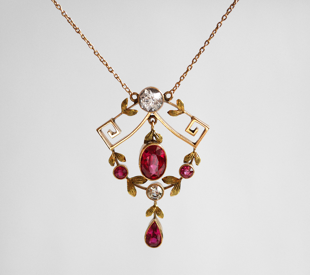 Velmi půvabný koliér z období pozdní secese, tělo větší ozdoby tvořeno dvěma zahraněnými volutami z nich je spuštěn feston, četně zdobeno jemně rytými lístečky. Osazeno syntetickými rubíny kulatého, oválného a kapkového brusu, doplněno o dva přírodní leukosafíry kulatého brusu o celkové váze cc 0,90 ct, fasováno v zrnitých obrubách. Kompoziční proporce nevšedně zvýrazněna 2 většími kameny v kontrastu s menšími, oživeno 2 kinetickými ověsky. Pražská klenotnická práce z přelomu 10. a 20. let 20. století.