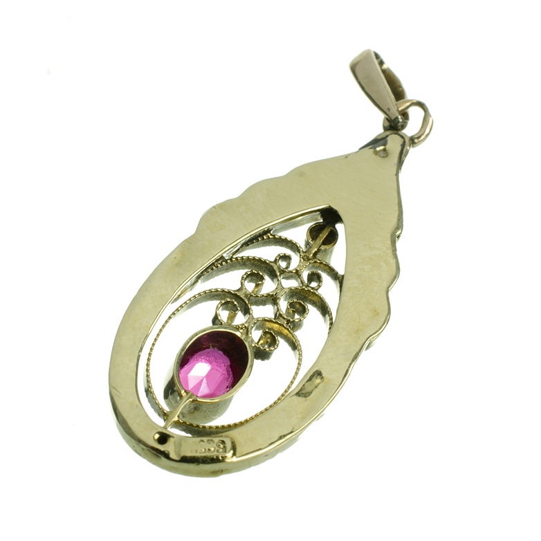 Secesní přívěs zdobený safírem, syntetickým spinelem a jemným gravírováním.