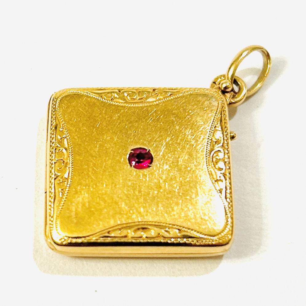 Půvabný, secesní přívěšek sloužící jako medailon na fotografie ve tvaru kosočtverce, přední strana osazena drobným rubínem kulatého brusu, při krajích zušlechtěno gravírováním rámovaném pulzujícími křivkami, zadní strana hladká. Kvalitní západoevropská, patrně německá zlatnická práce z přelomu 19. a 20. století.