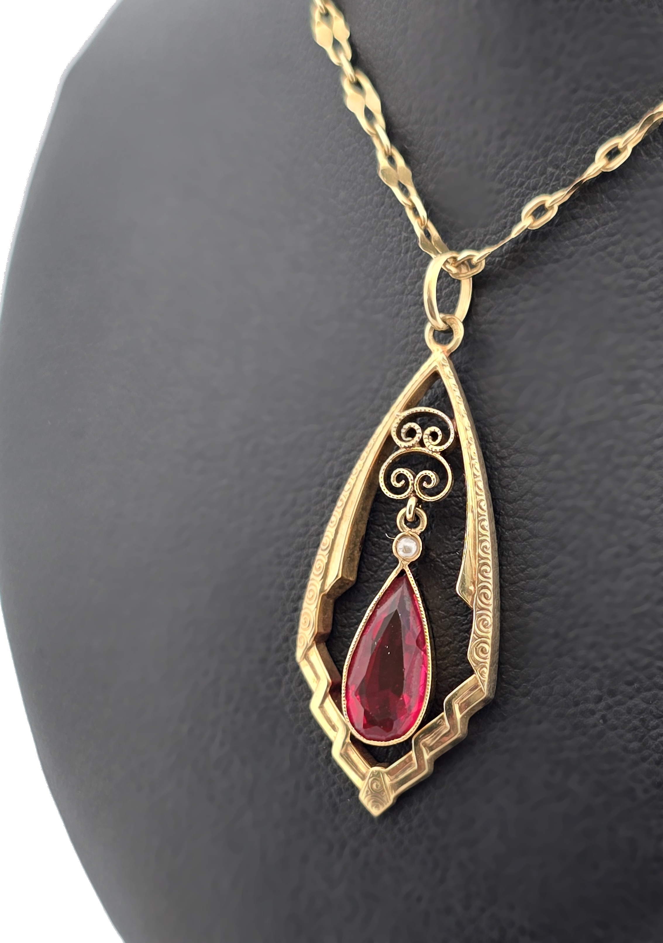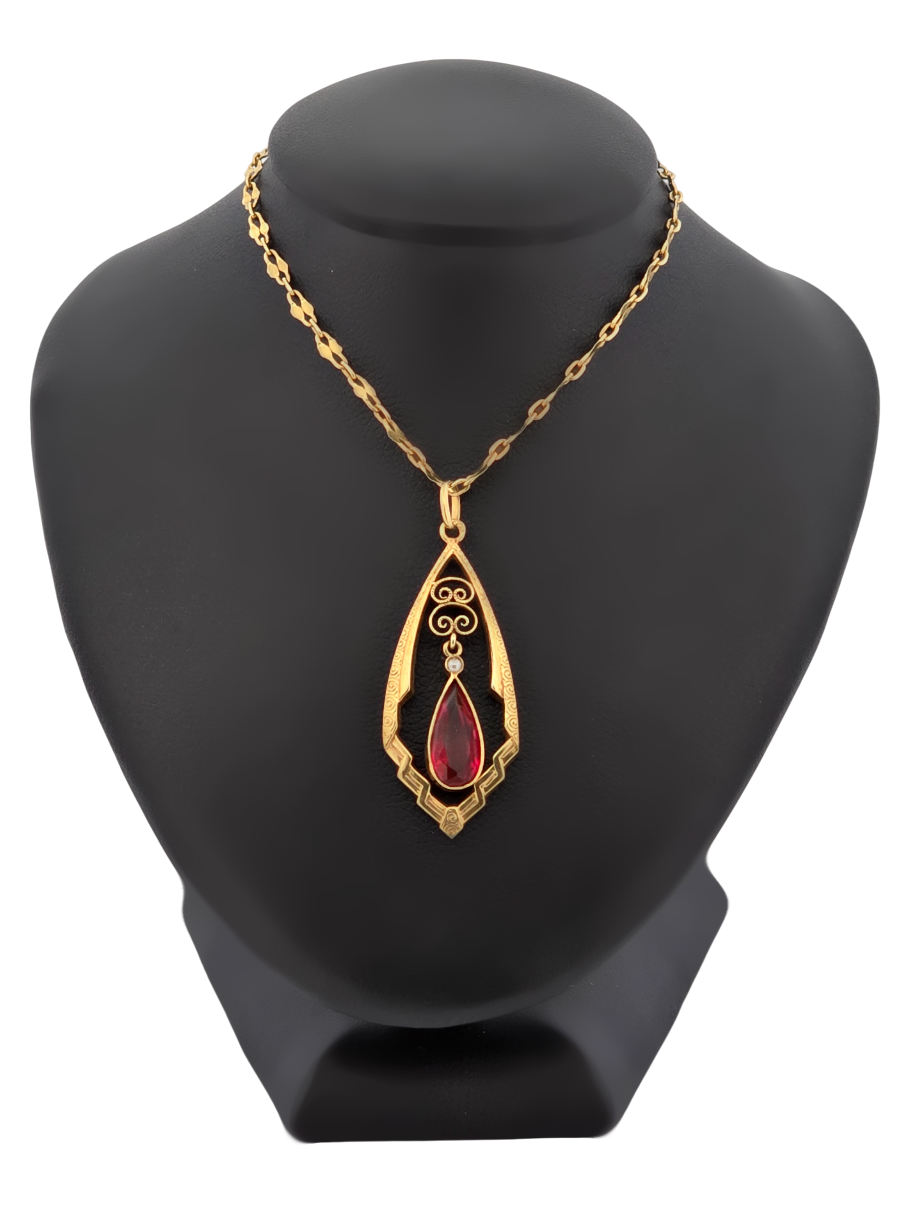 Popis: Starožitný secesní přívěsek ze žlutého zlata, s malou perličkou a rubínovým sklem. Krásně propracovaný, zdobený.