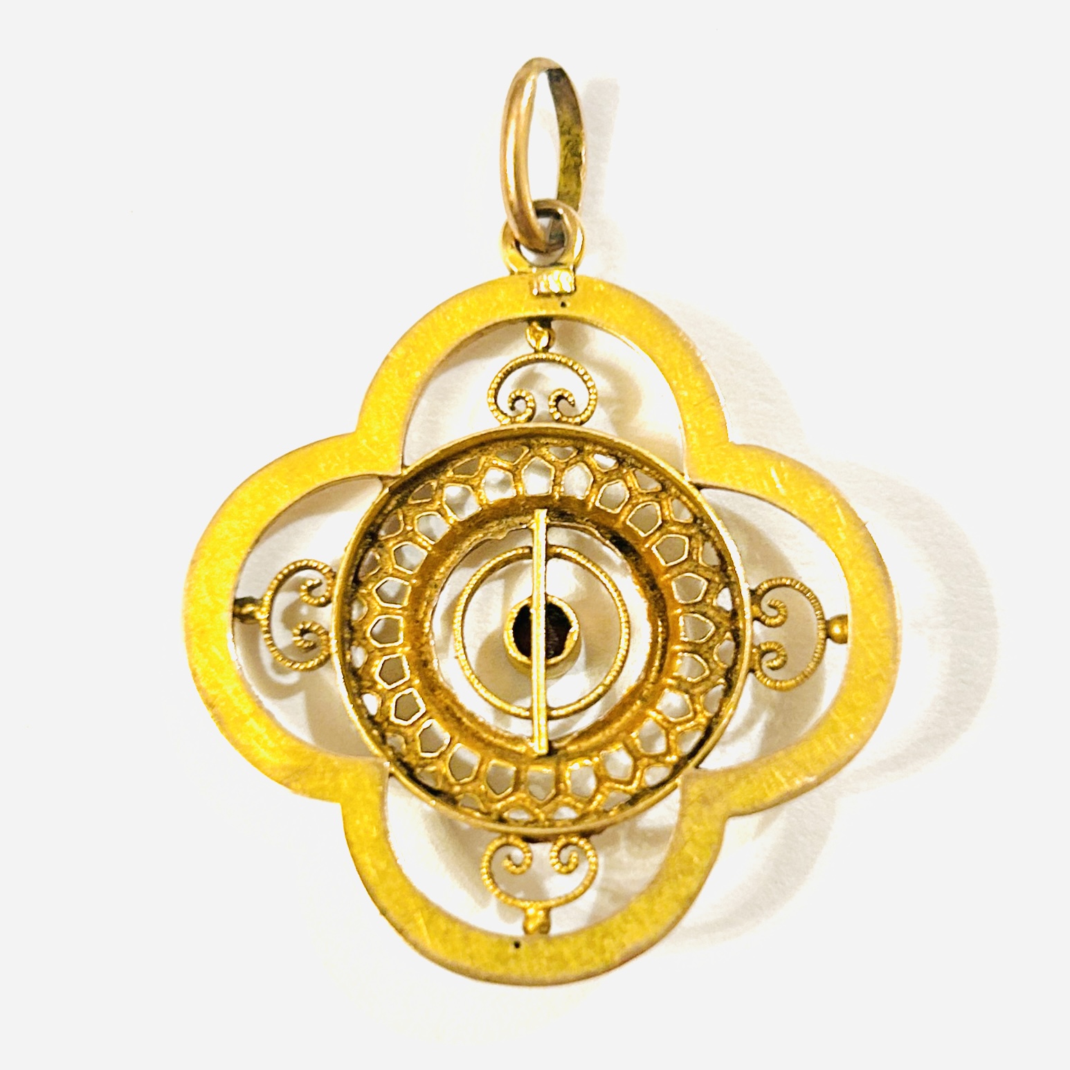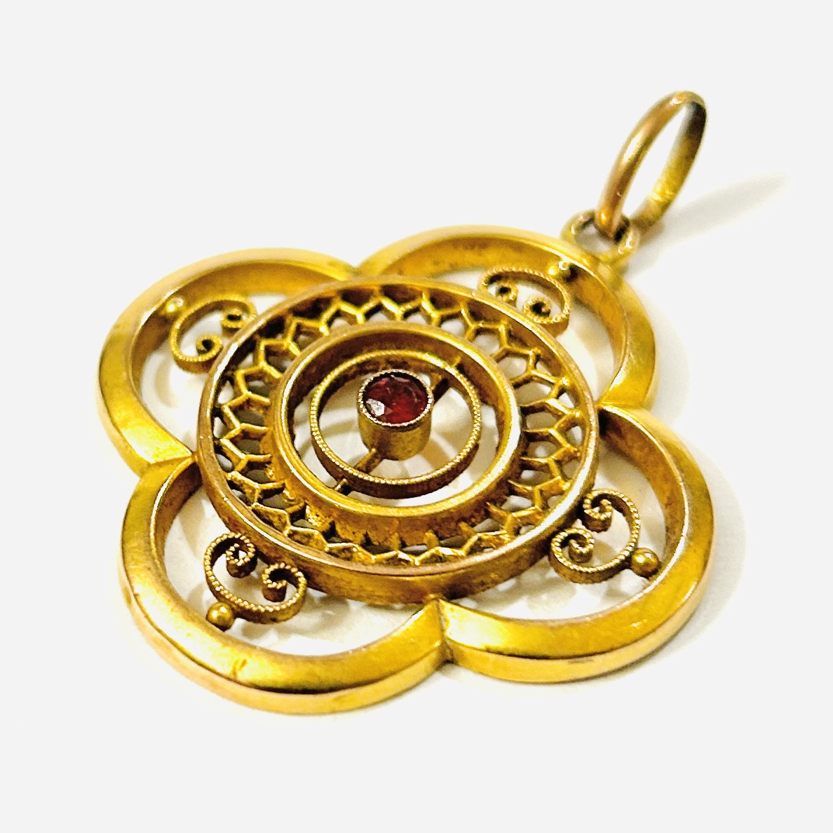 Půvabný, raně secesní větší přívěšek tvaru čtyřlístku, bohatě ornamentální prolamovaná výplň uprostřed osazena rubínovým sklem kulatého brusu. Kvalitní německá zlatnická práce z konce 19. století. Rámeček vyroben technikou dutého kovu.