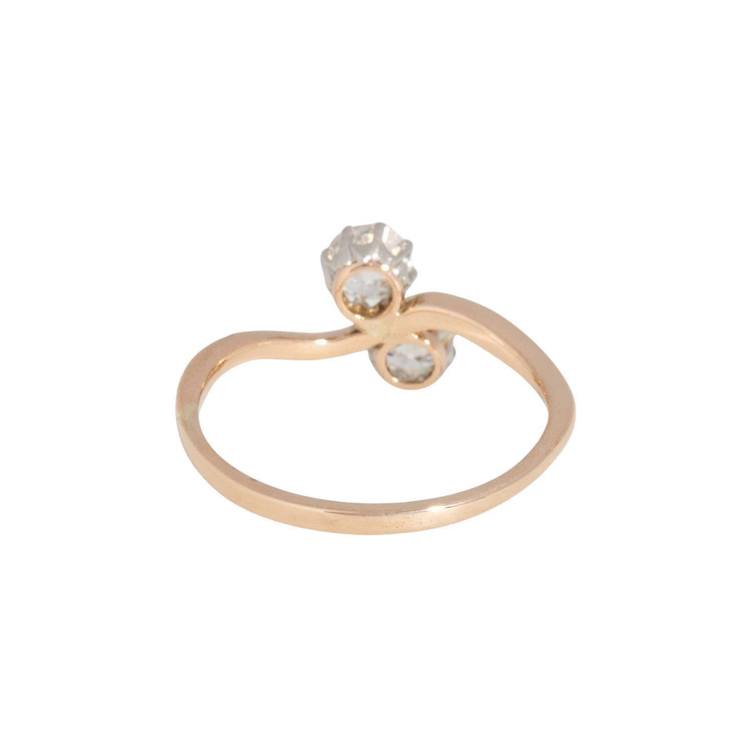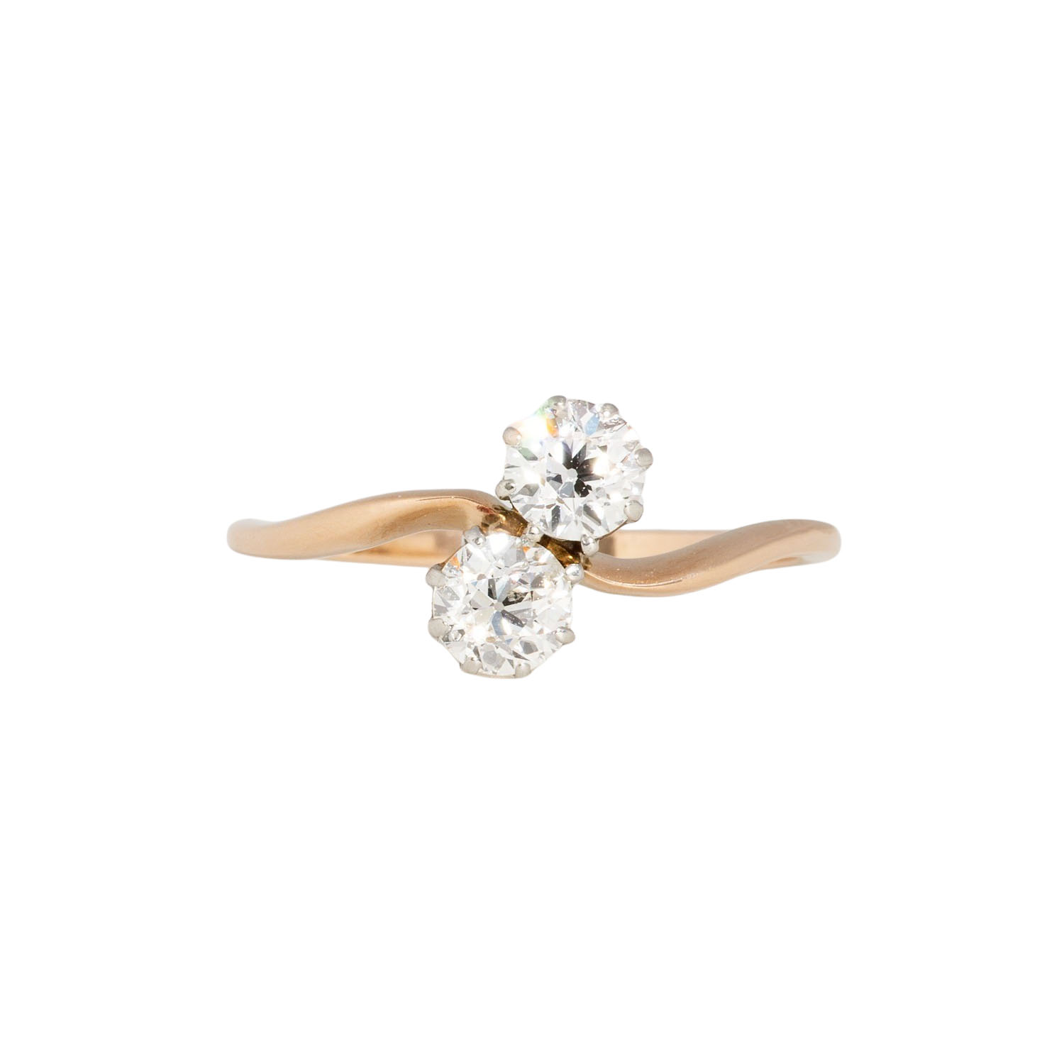 Půvabný zlatý prsten z období secese, je osazený dvěma přírodními diamanty starého briliantového brusu o celkové hmotnosti 0,92 ct,