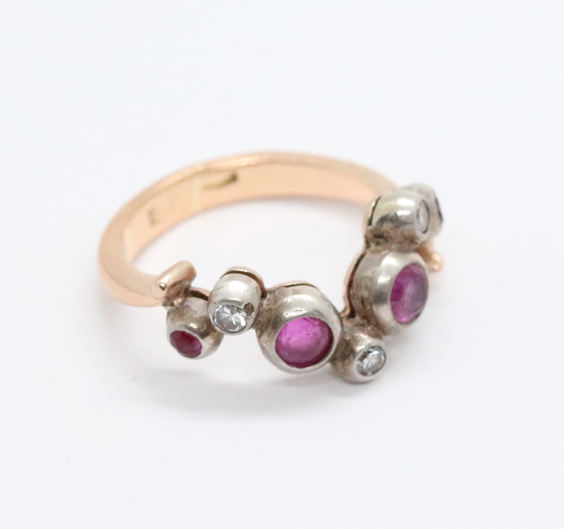 Zlatý secesní prstýnek se čtyřmi rubíny a třemi drobnými diamanty o hmotnosti cca 0,06 ct, Au btto 3,20g/750/1000, kameny zasazené ve stříbrném lůžku, střední Evropa, kolem roku 1915, atest puncovního úřadu; velikost prstenu 46