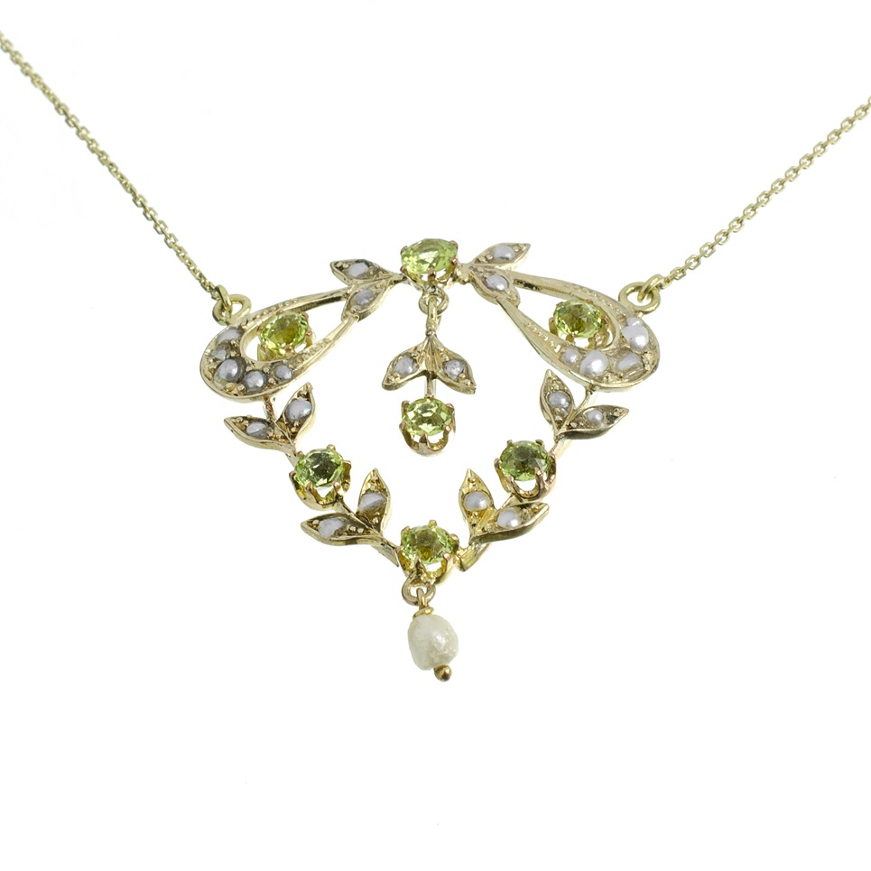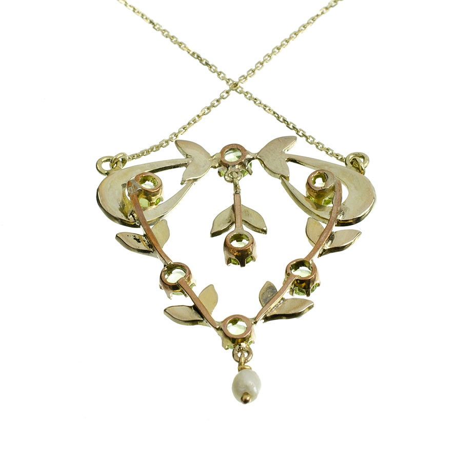 Secesní závěs zdobený přírodními olivíny a drobnými říčními perličkami. Zlato Au 585/1000, 5,16gr. Čechy, do roku 1920
