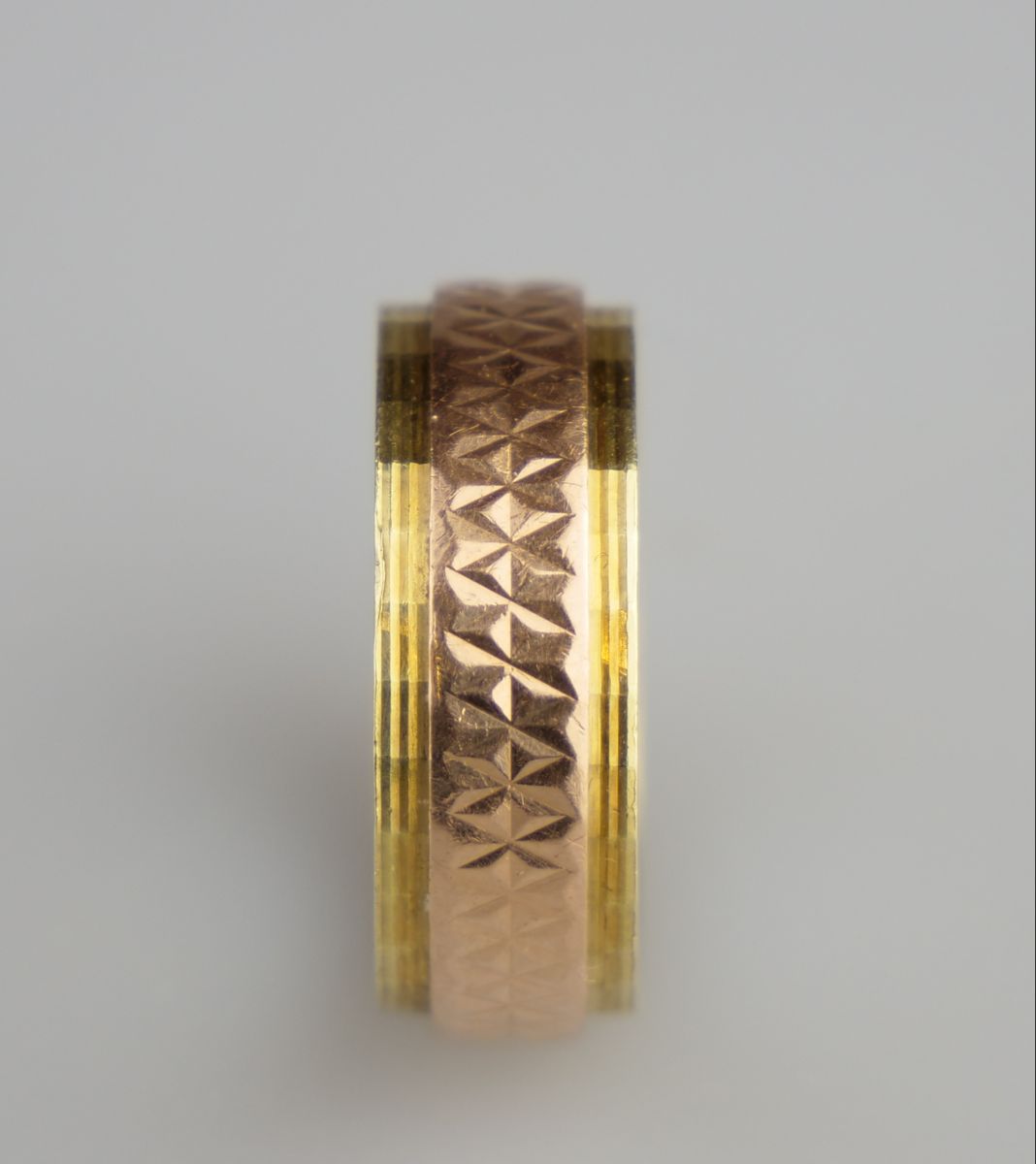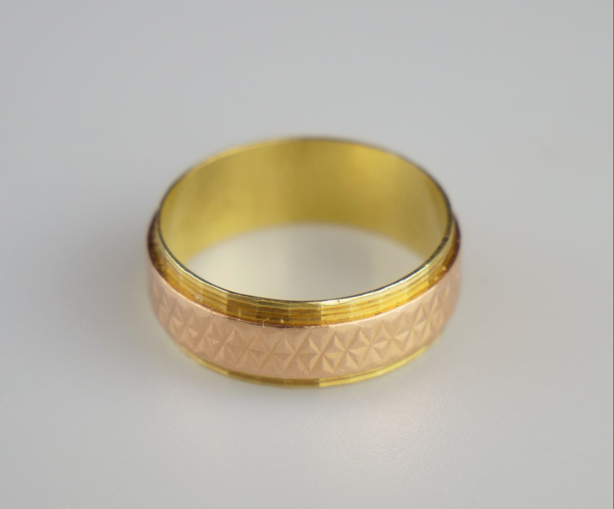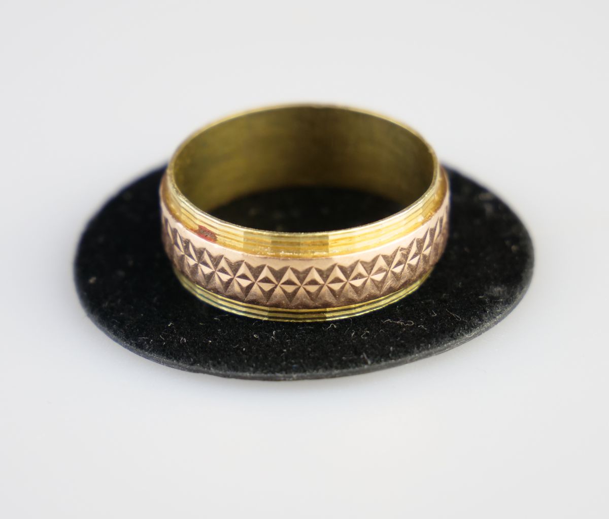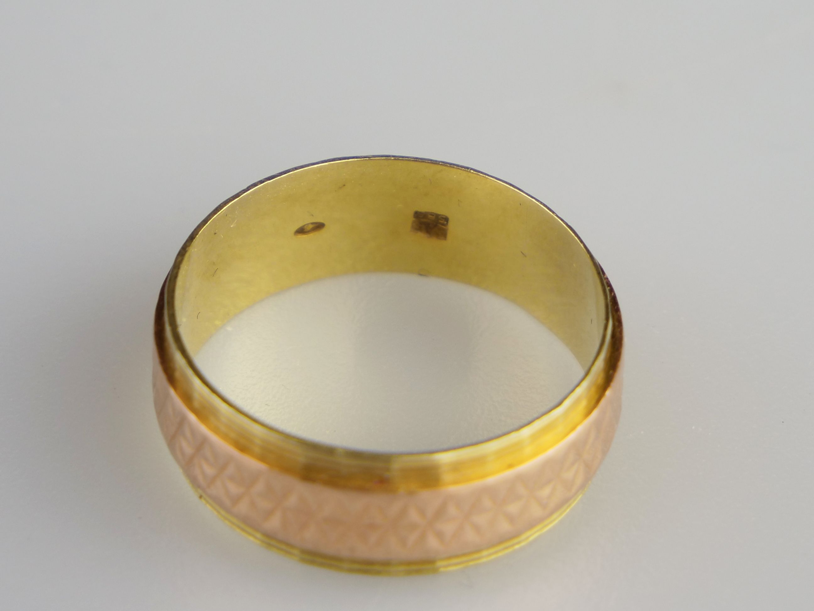 snubní prsten ze žlutého a růžového zlata, Au 4,80 g/585/1000, Československo, kolem r. 1985, dobový punc (čejka), šířka 0,75 cm; velikost prstenu 61