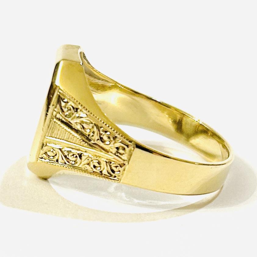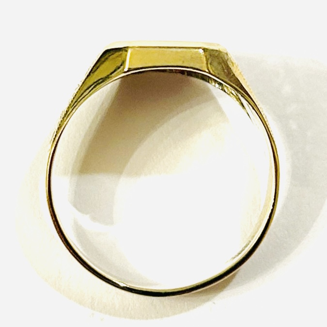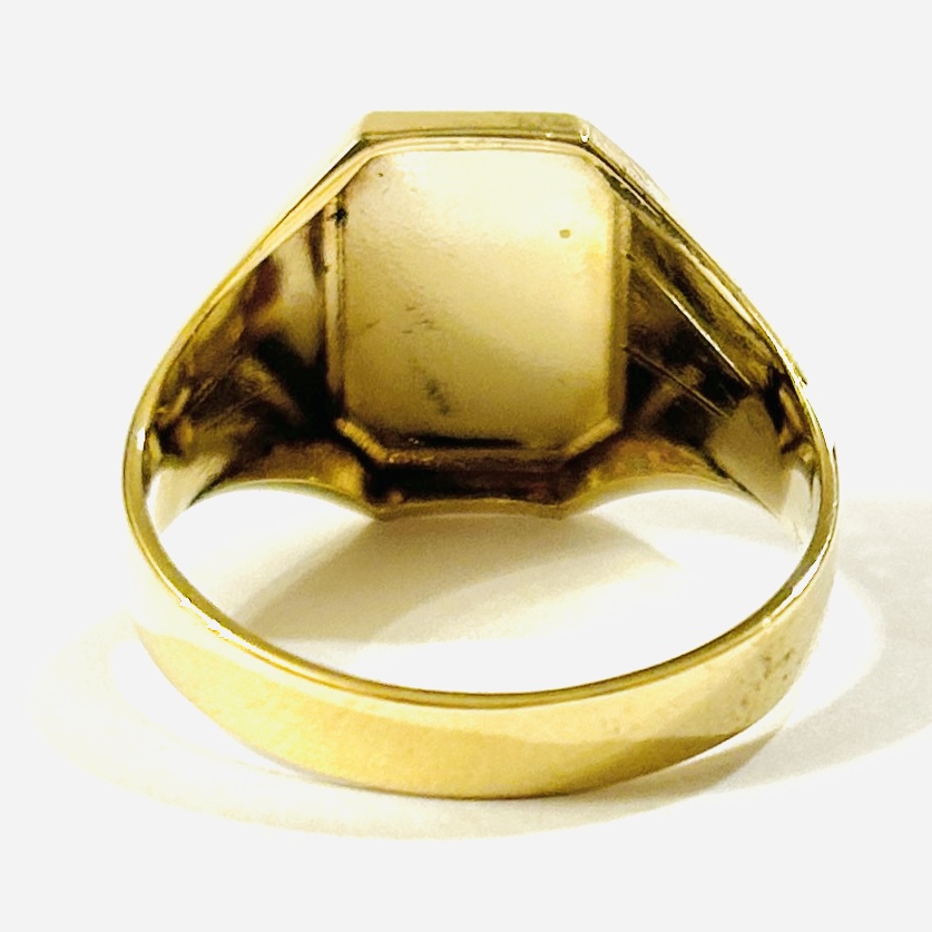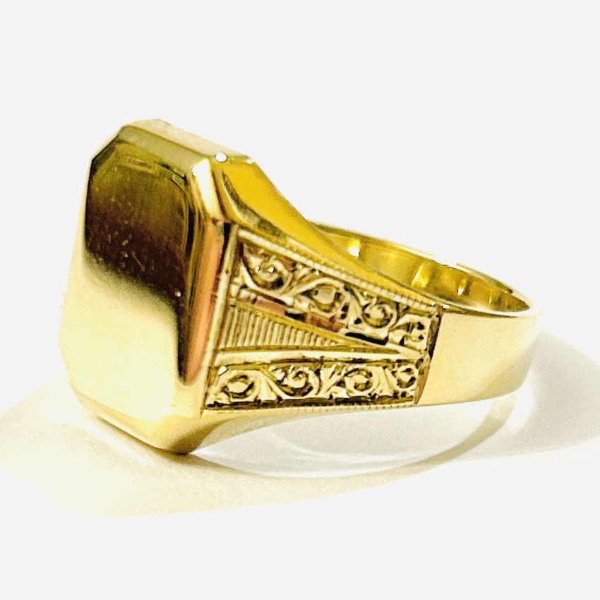 Elegantní, starožitný prsten s obdélnou pečetní hlavicí volnou pro případný monogram, ramena šíny zdobena jemným art-deco laděným rytím. Solidní tuzemská práce klenotnického družstva Soluna z 60. až 80. let 20. století.