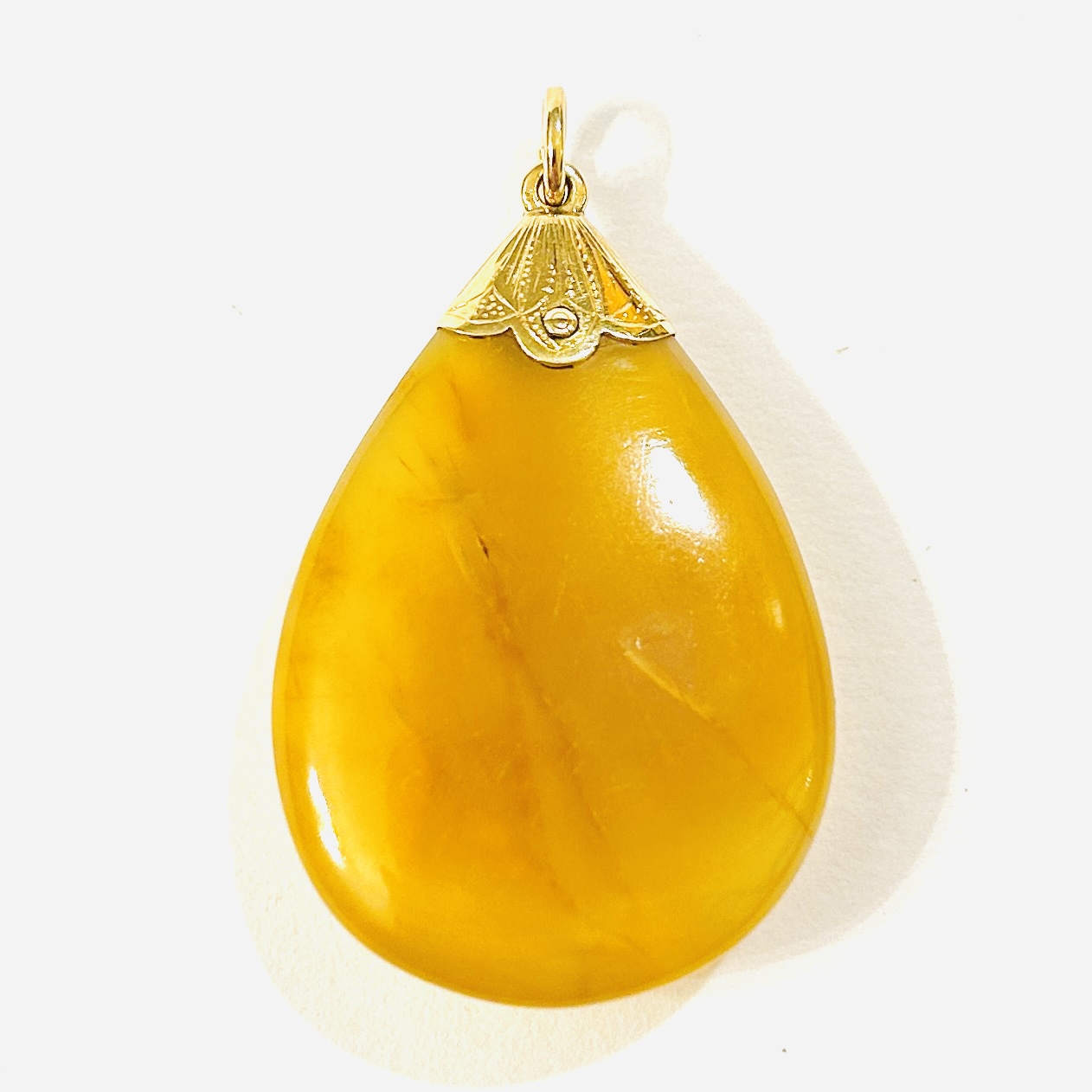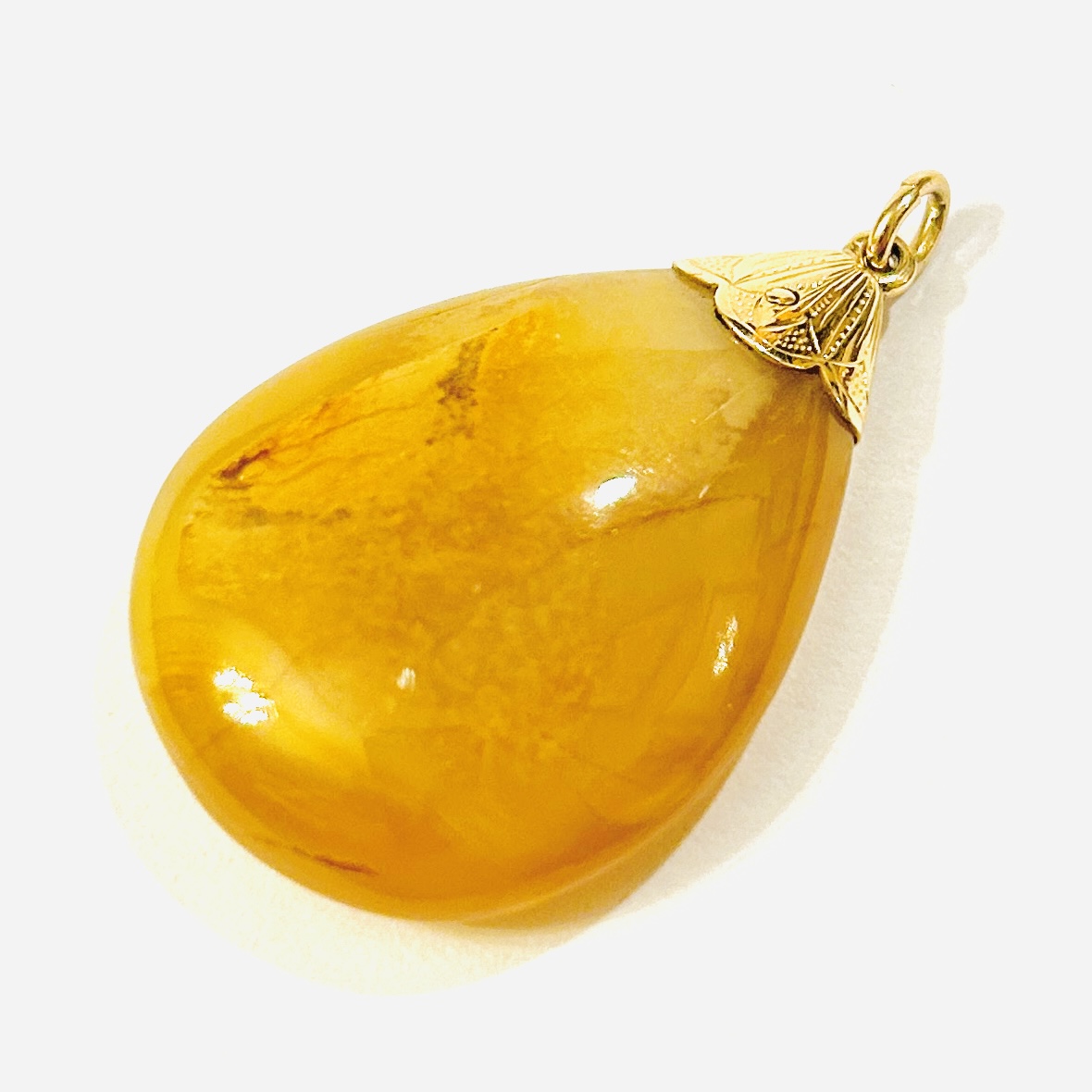 Nevšední, výrazný přívěšek, jemuž dominuje přírodní žlutý achát leštěný do ploché kapky, uchycení s vlnitým okrajem celoplošně zdobeno dekorativním rytím. Západoevropská či mimoevropská práce z 1. až 2. třetiny 20. století.