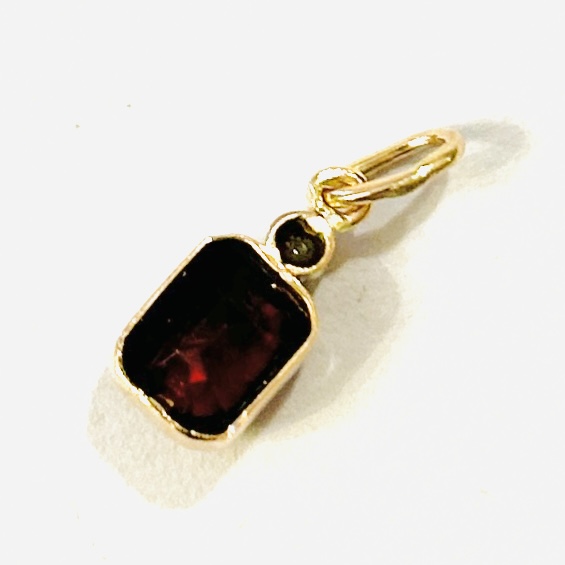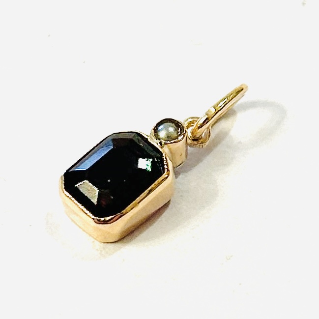 Decentní přívěšek osazený rudým sklem obdélného brusu, doplněno drobnou přírodní šedou perlou, fasováno v zrnitých obrubách. Vídeňská zlatnická práce z počátku 20. století.