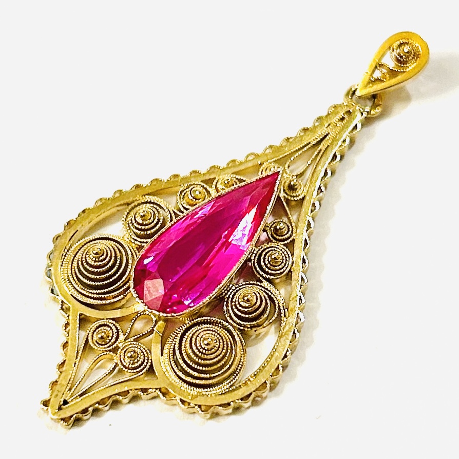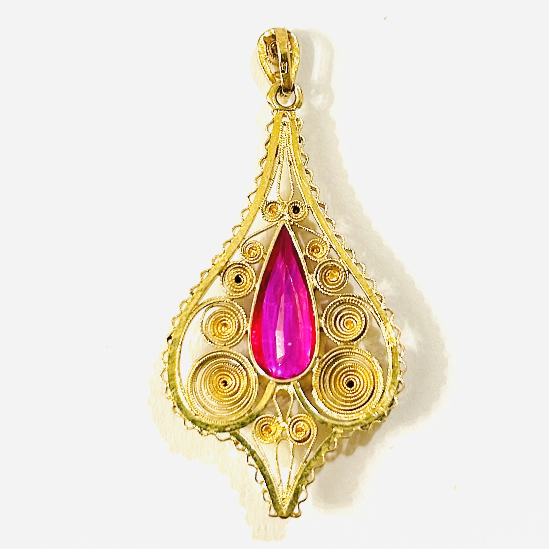Větší přívěšek ve tvaru stylizované kapky, osazeno syntetickým růžovým kamenem (korund/spinel) kapkového brusu, fasováno v zrnité obrubě. Tělo vyplněno jemnými filigránovými volutami s granulovanými kuličkami, vlnité orámování. Pozdně secesní design blízký tvorbě Marie Křivánkové, precizní pražská klenotnická práce z počátku 20. let 20. století. Sběratelsky zajímavé.