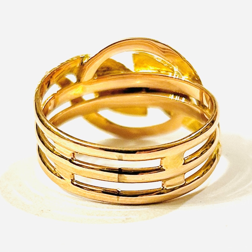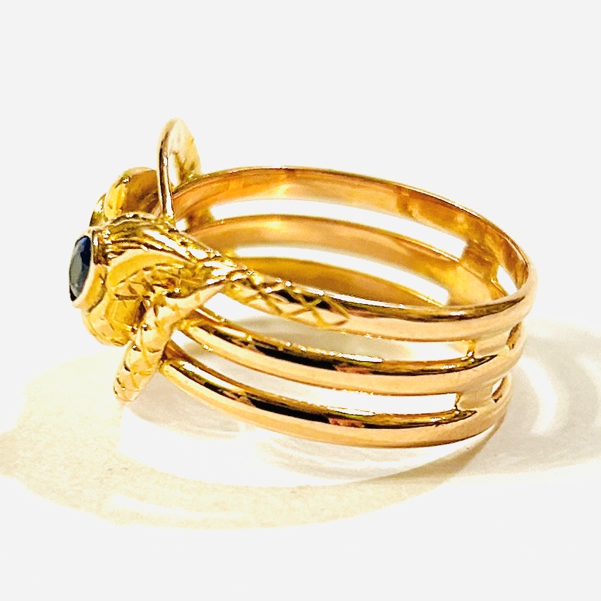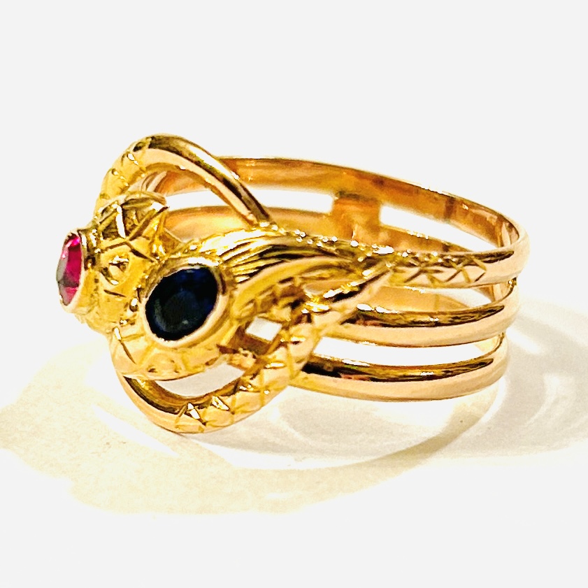 Nevšední, výrazný prsten s hlavicí s motivem dvou splétaných hadů, osazeno v plně přiléhající obrubě červeným a modrým kamenem oválného brusu (sklo či syntetika), těla detailně vystižena, širší šína ze tří pásů s průsvitkami. Šperk s tradiční symbolikou nejen síly a znovuzrození, jež byla nezřídka využívána ve šperkařství té doby. Precizní západoevropská klenotnická práce ze 3. čtvrtiny 19. století.
