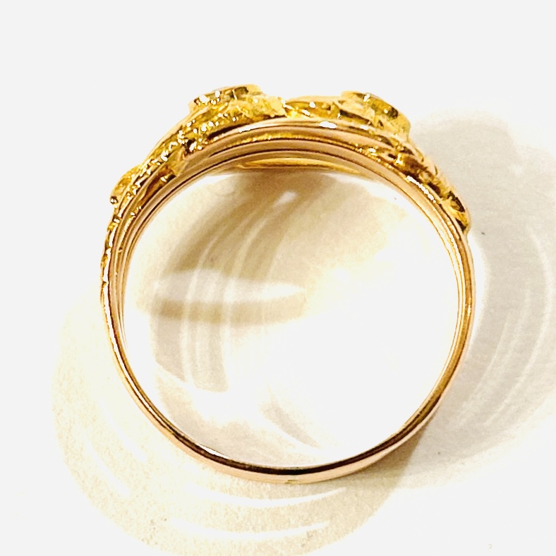Zhotoveno z narůžovělého žlutého 18 karátového zlata, tj. o ryzosti 750/1000; vyhotoveno osvědčení puncovního úřadu, neznačeno. Hmotnost 5,00 g, velikost 57,5, šířka 13 mm. Velikost v minulosti upravována, v zachovalém stavu, odborně vyčištěno a vyleštěno zlatníkem.