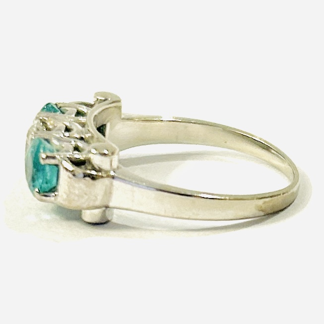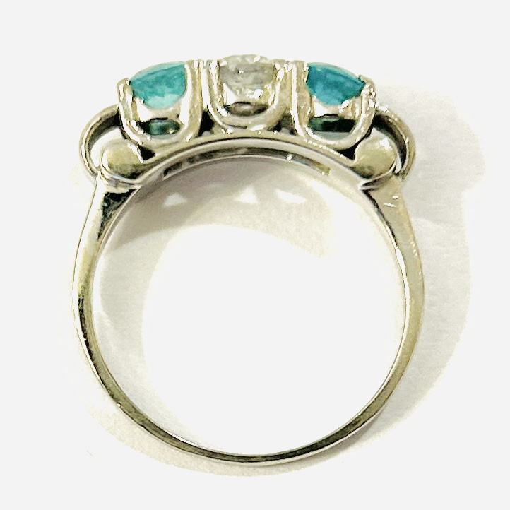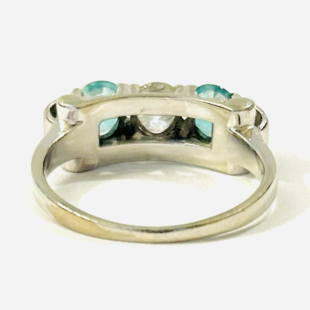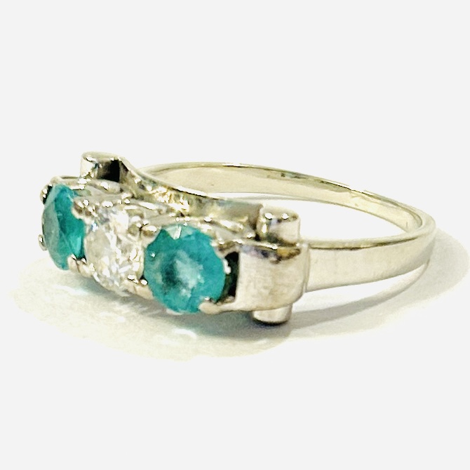 Apartní starožitný prsten koktejlového typu, jež je v dekorativně tvarované hlavici osazen v krapnové koruně ve středu přírodní diamantem starého briliantového brusu o váze 0,44 ct, čistota SI2, barva L-M, po stranách osazeno přírodními kolumbijskými smaragdy kulatého brusu o váze 0,46 a 0,44 ct, dobré čistoty a slabým olejováním F1 (postup u smaragdů zcela běžný). Mistrovská německá klenotnická práce z 50. let 20. století.