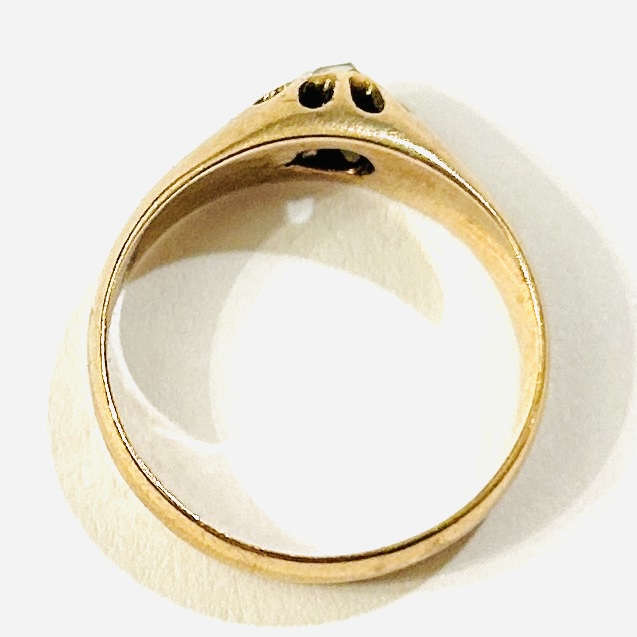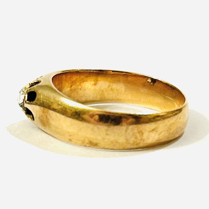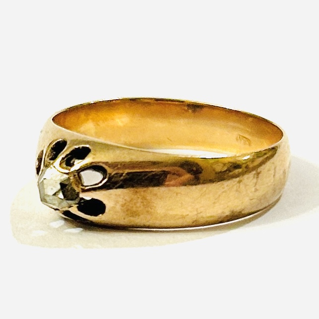 Elegantní prsten typu \“vídeňák\“, který je osazen v mnohokrapnové koruně přírodním diamantem routového brusu o hmotnosti cca 0,15 ct, šína ponechána hladká. Solidní vídeňská zlatnická práce z konce 19. století.